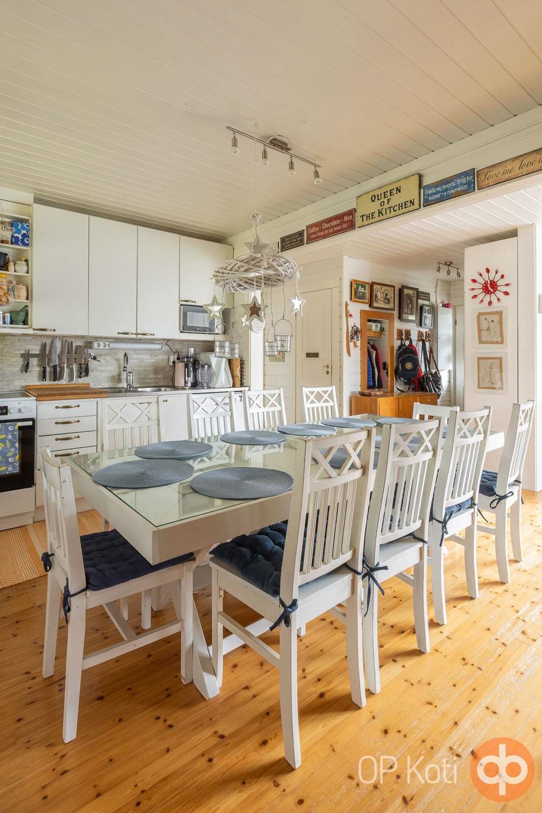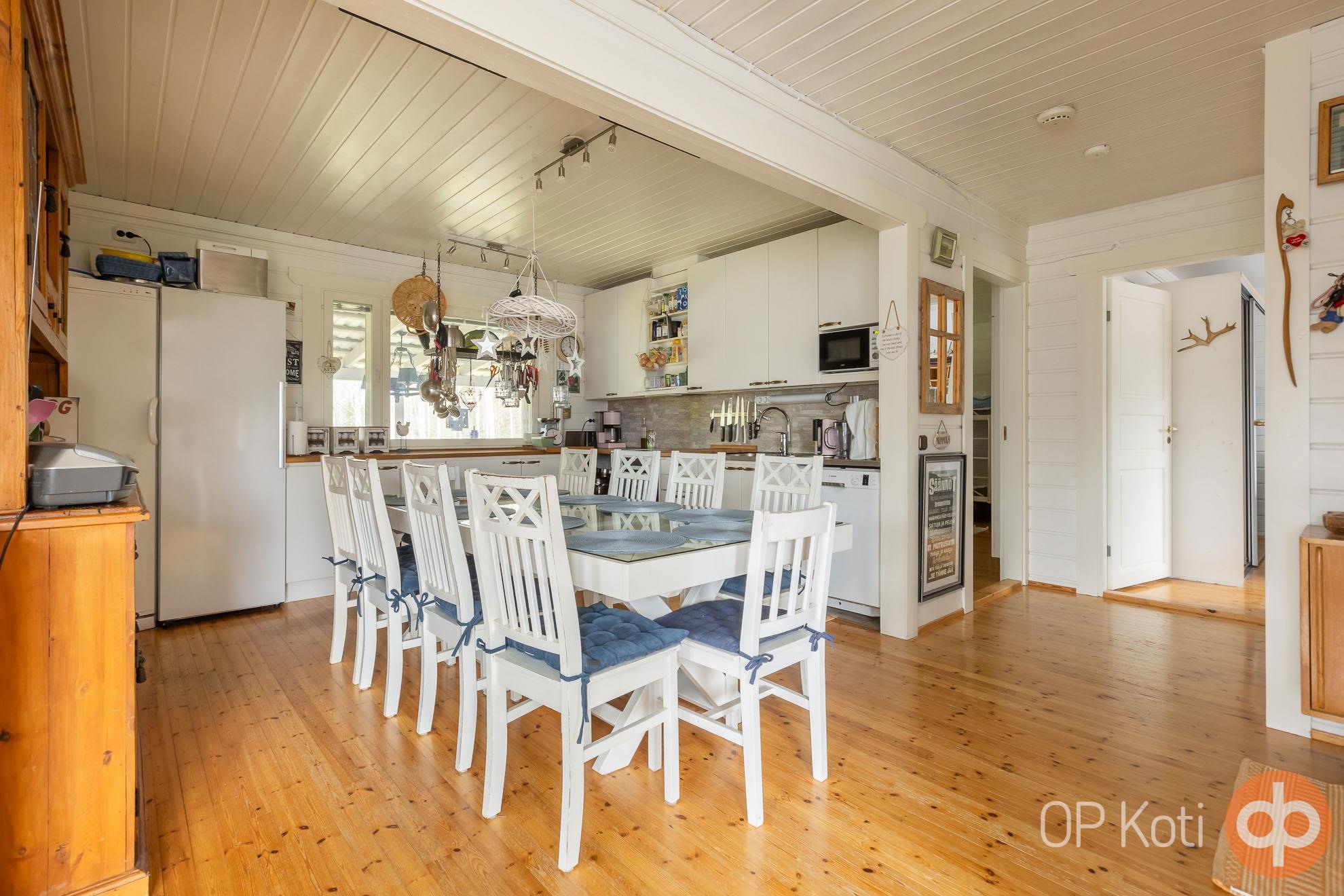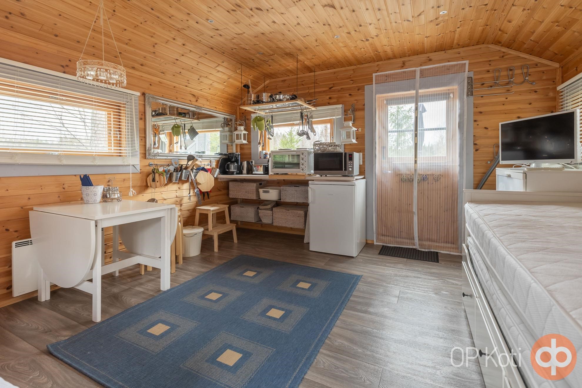 - Jääkaappi Keittiössä, jääkaappipakastin Eteisessä (jääpalakone), pakastekaappi Eteisessä, keraaminen liesi, liesituuletin, mikroaaltouuni, astianpesukone 2022 Uusittu moottori, kaapistot, irralliset kaapistot Vitriini, kiinteät valaisimet, pöytätasojen materiaali Puu. Ritiläteline . Kalusteet, astiat, aterimet kuuluvat kauppaan. (Pl. muutama henk. koht)