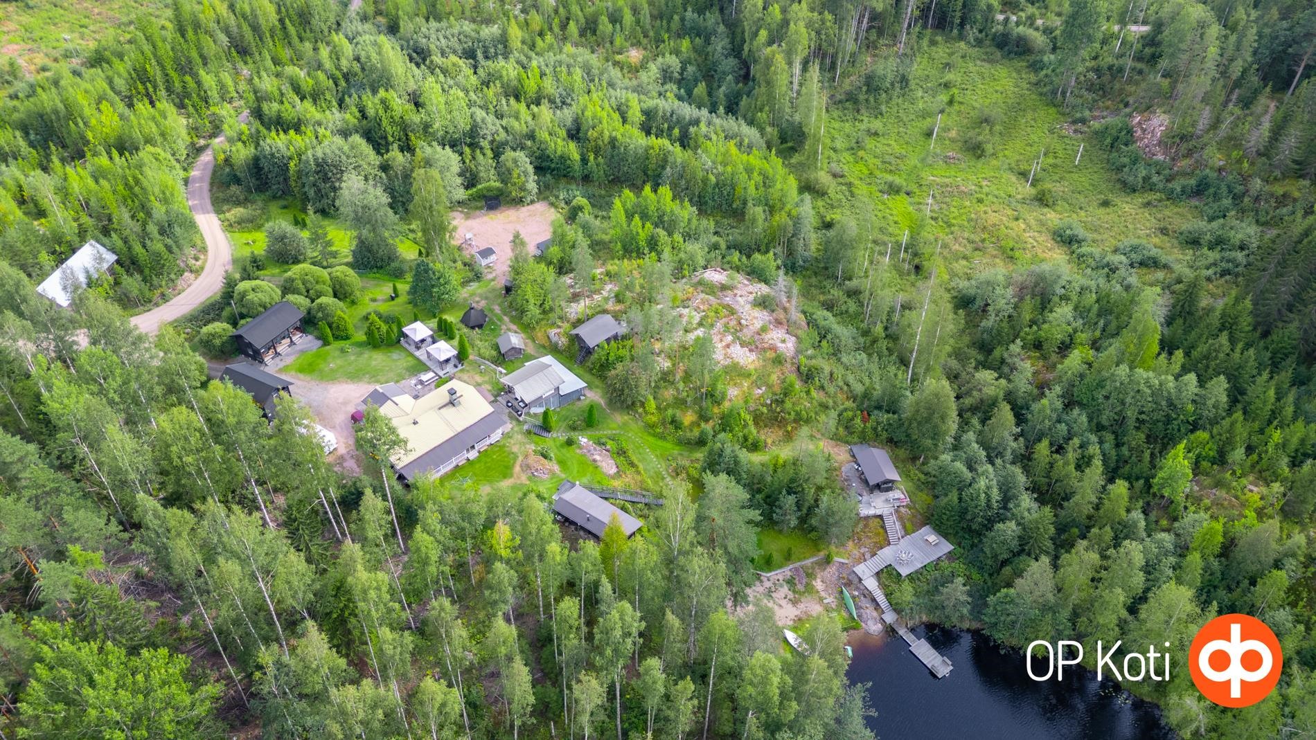 The property also includes a sauna building with a small living area, a smoke sauna by the lakeshore, a storage cabin, and two large barn-style buildings offering a total of 12 rooms. Additionally, there is a drying barn, children's playhouse, lean-to shelter, hut, root cellar, and four outdoor toilets.