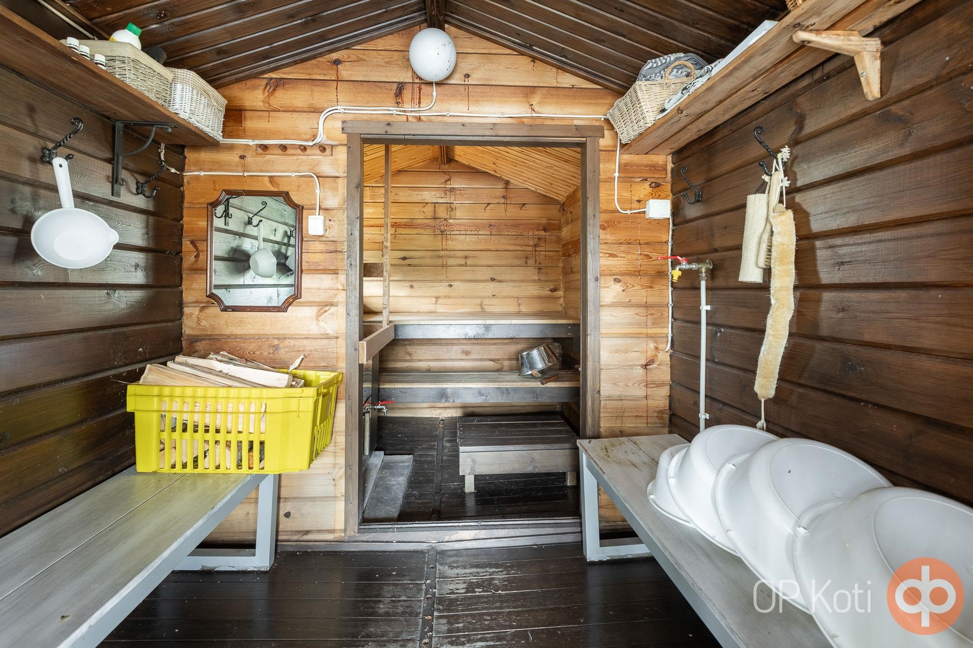 - Sauna Päärakennuksessa (puu), saunarakennuksessa, rannassa savusauna), puukiuas, kylpyhuone, erillinen wc, suihku, peilikaappi Erillisessä vessassa, kaapit, allaskaappi Erillisessä vessassa, pesukoneliitäntä, lattialämmitys, kiinteät valaisimet. Palju pihasaunalla ja savusaunalla. Pyykinpesukone (11kg) ja kuivasrumpu kuuluvat kauppaan.