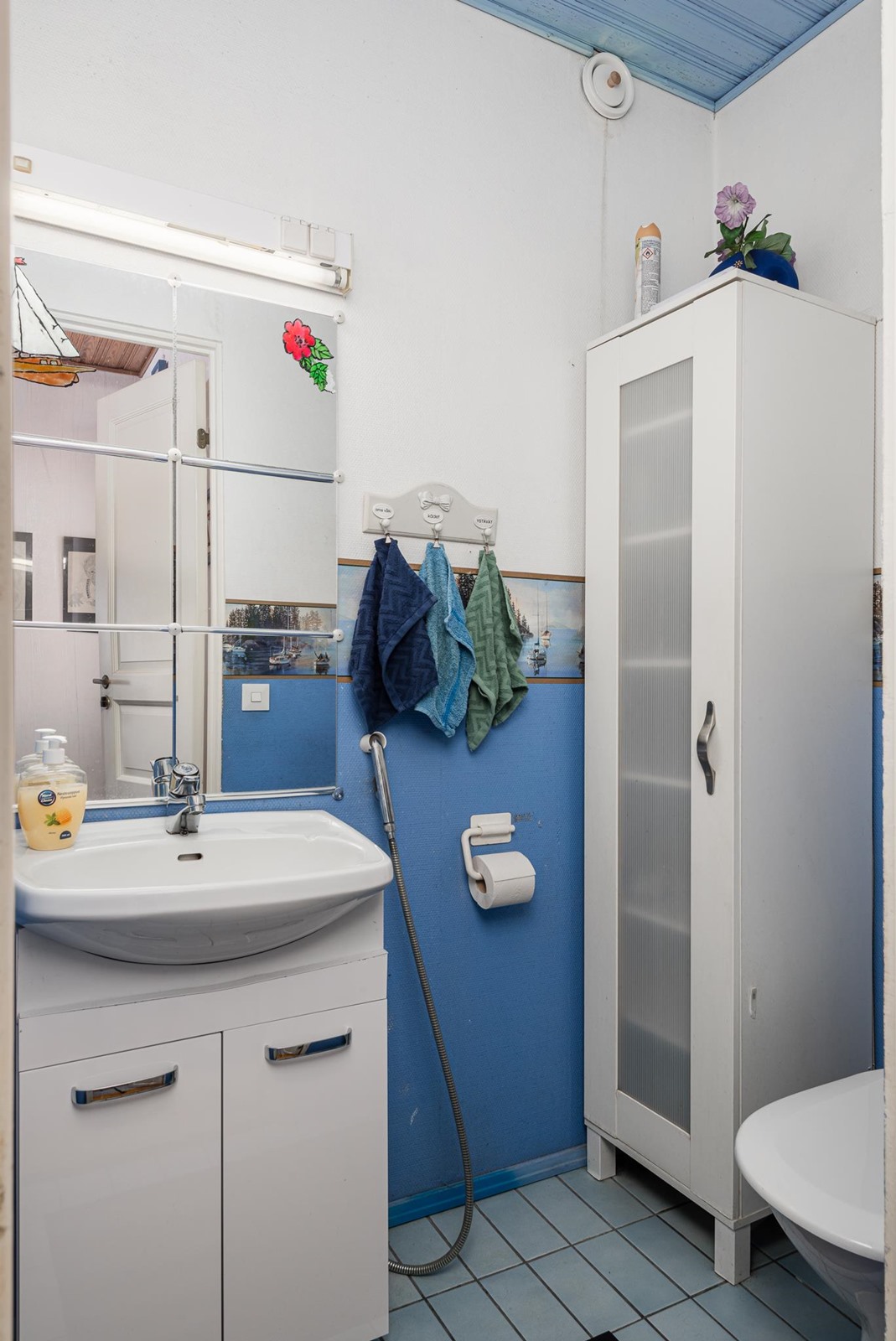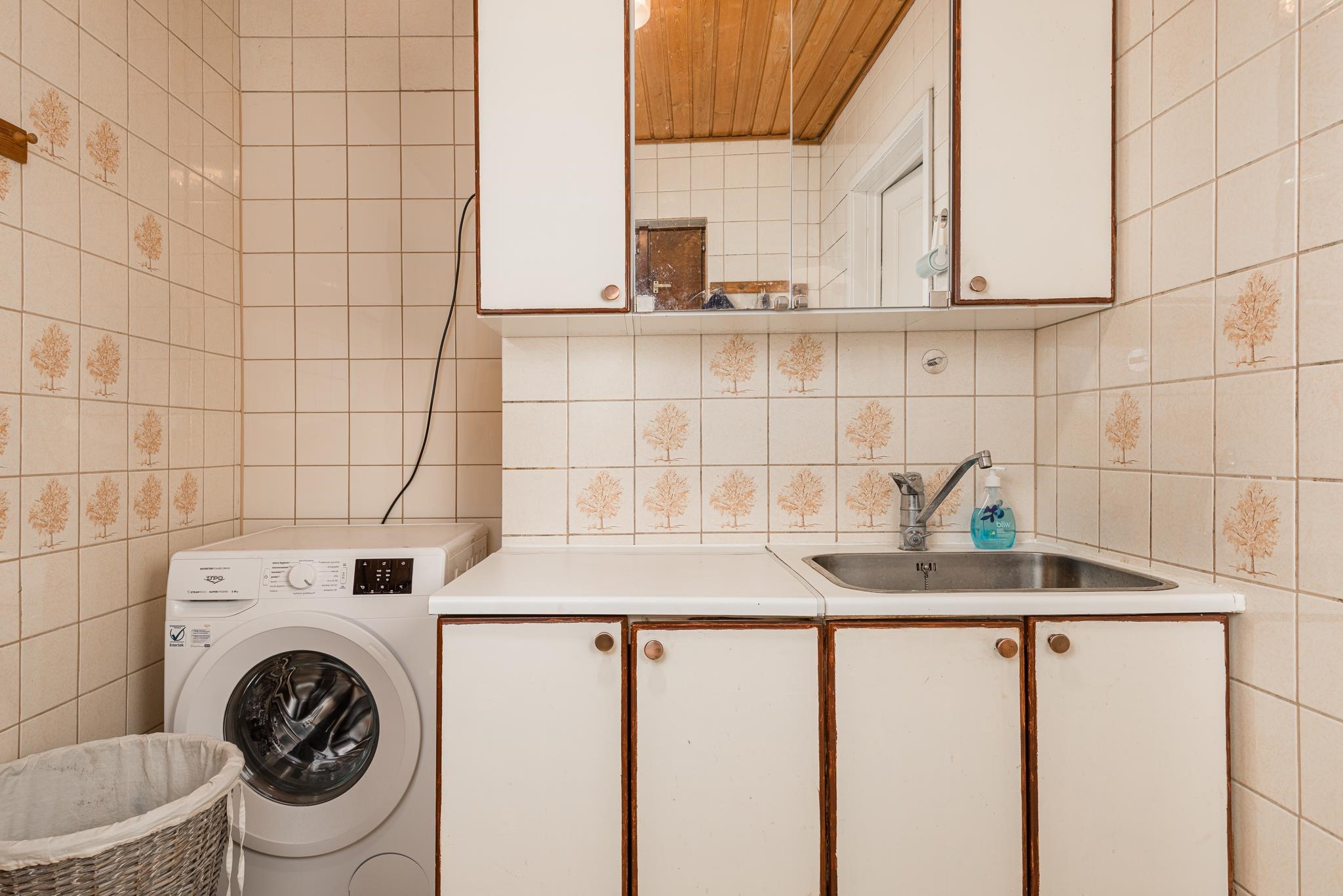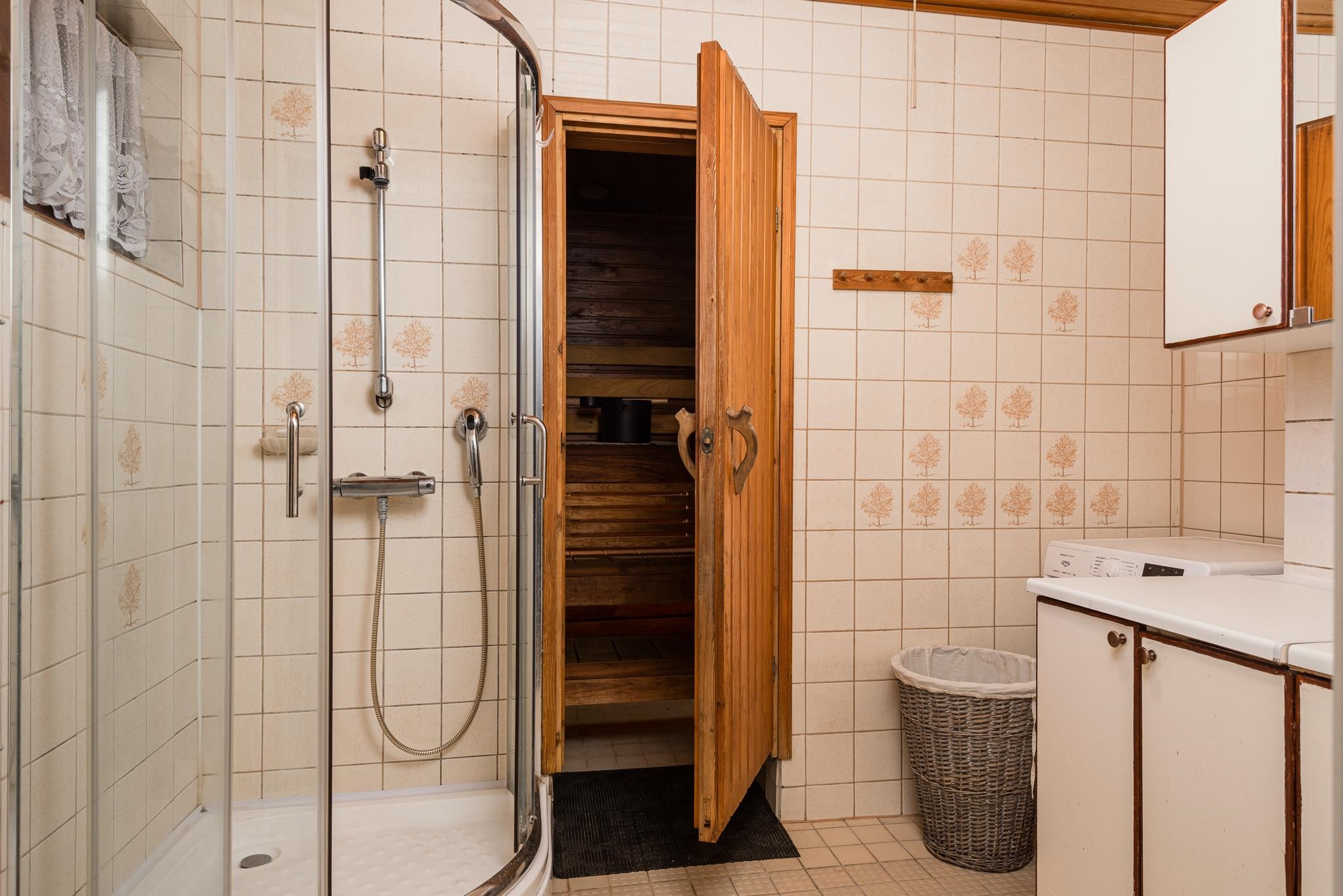 - Sauna, sähkökiuas, kylpyhuone, erillinen wc, suihkukaappi, peilikaappi, allaskaappi, pesukoneliitäntä, lattialämmitys, kiinteät valaisimet.