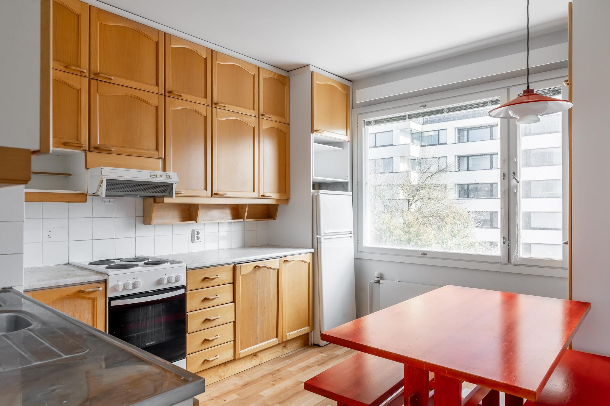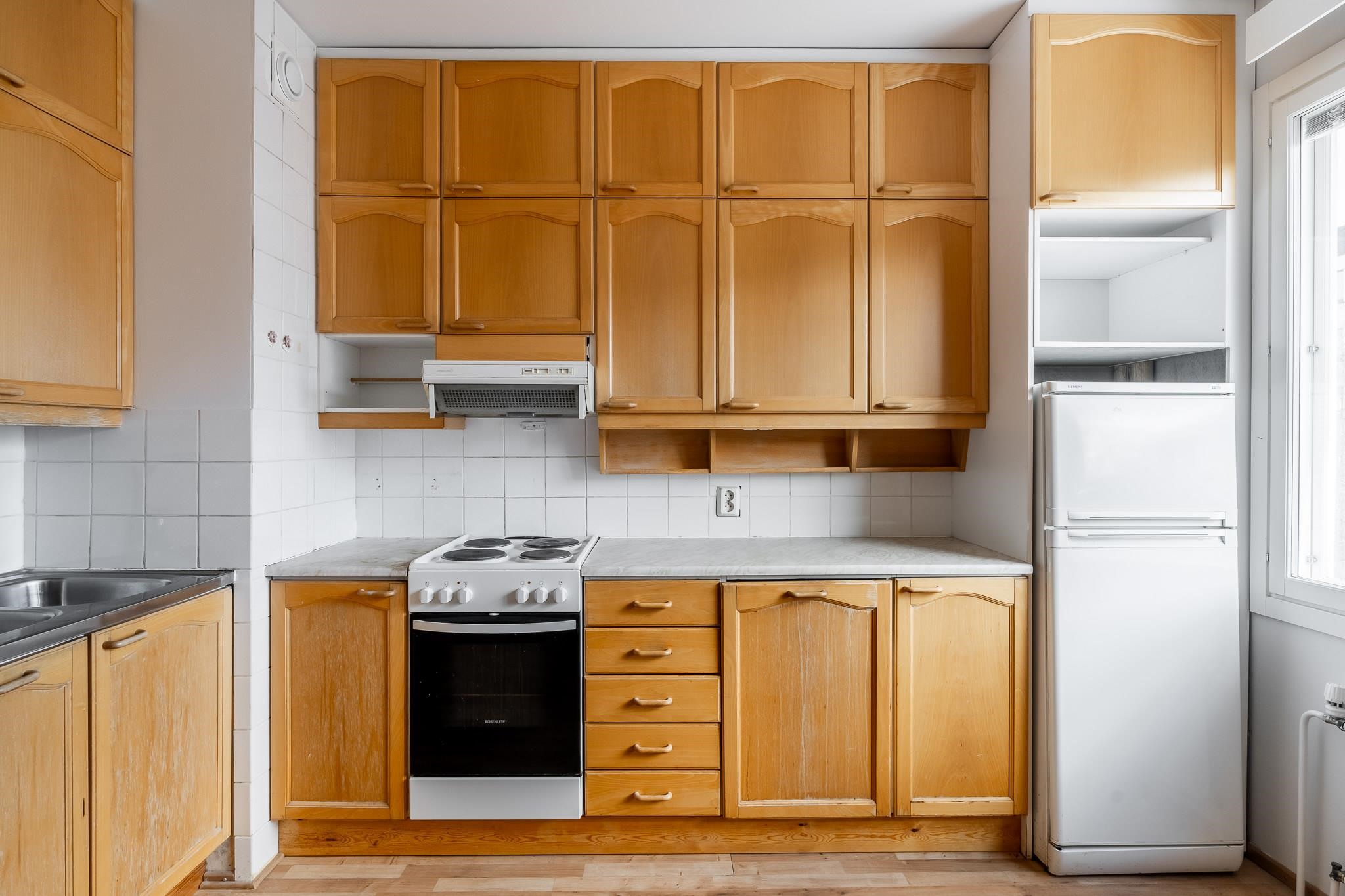 - Jääkaappipakastin, lattialiesi, liesituuletin, kaapistot, kiinteät valaisimet.