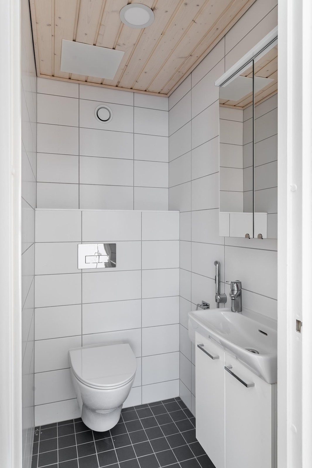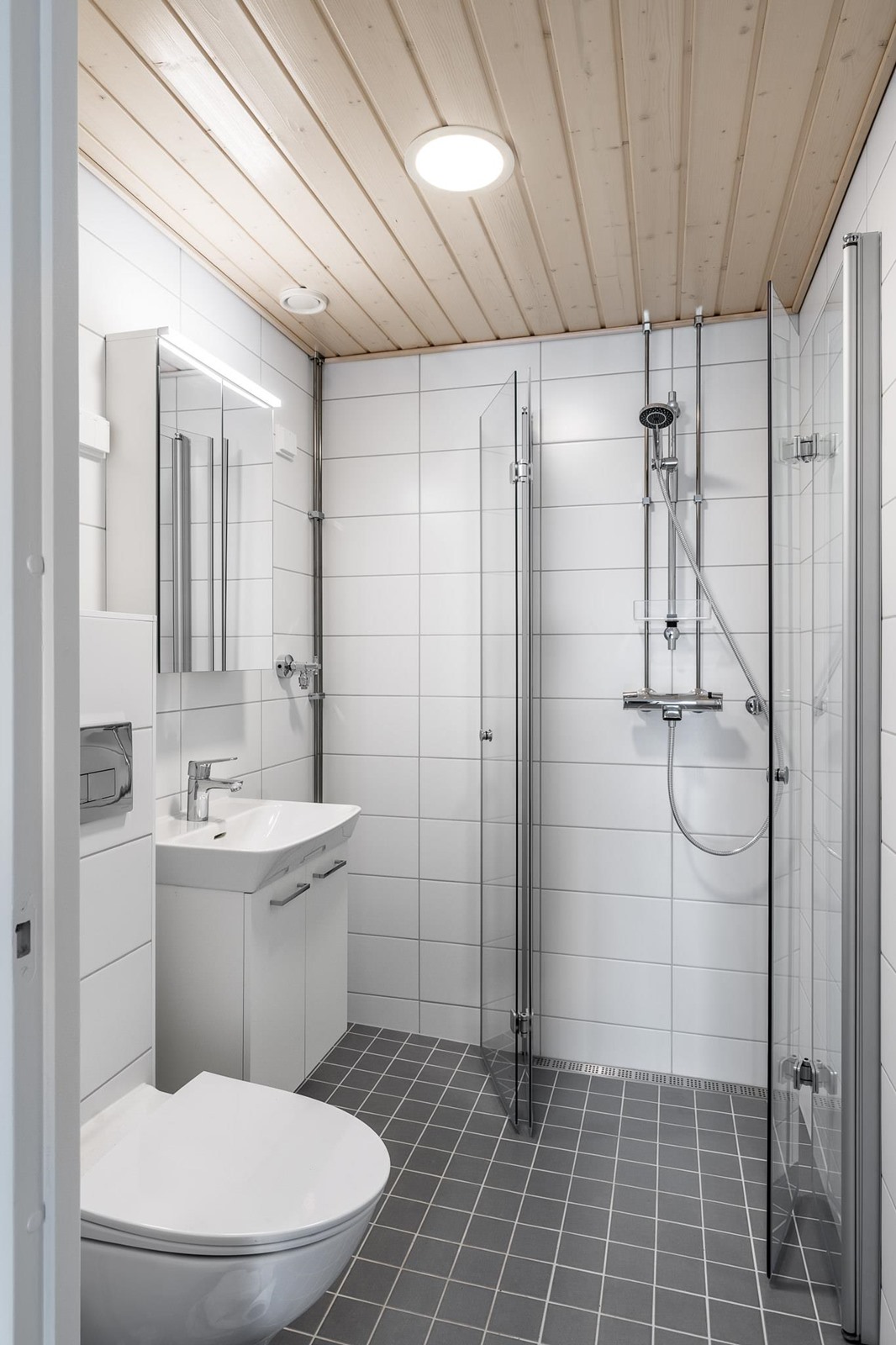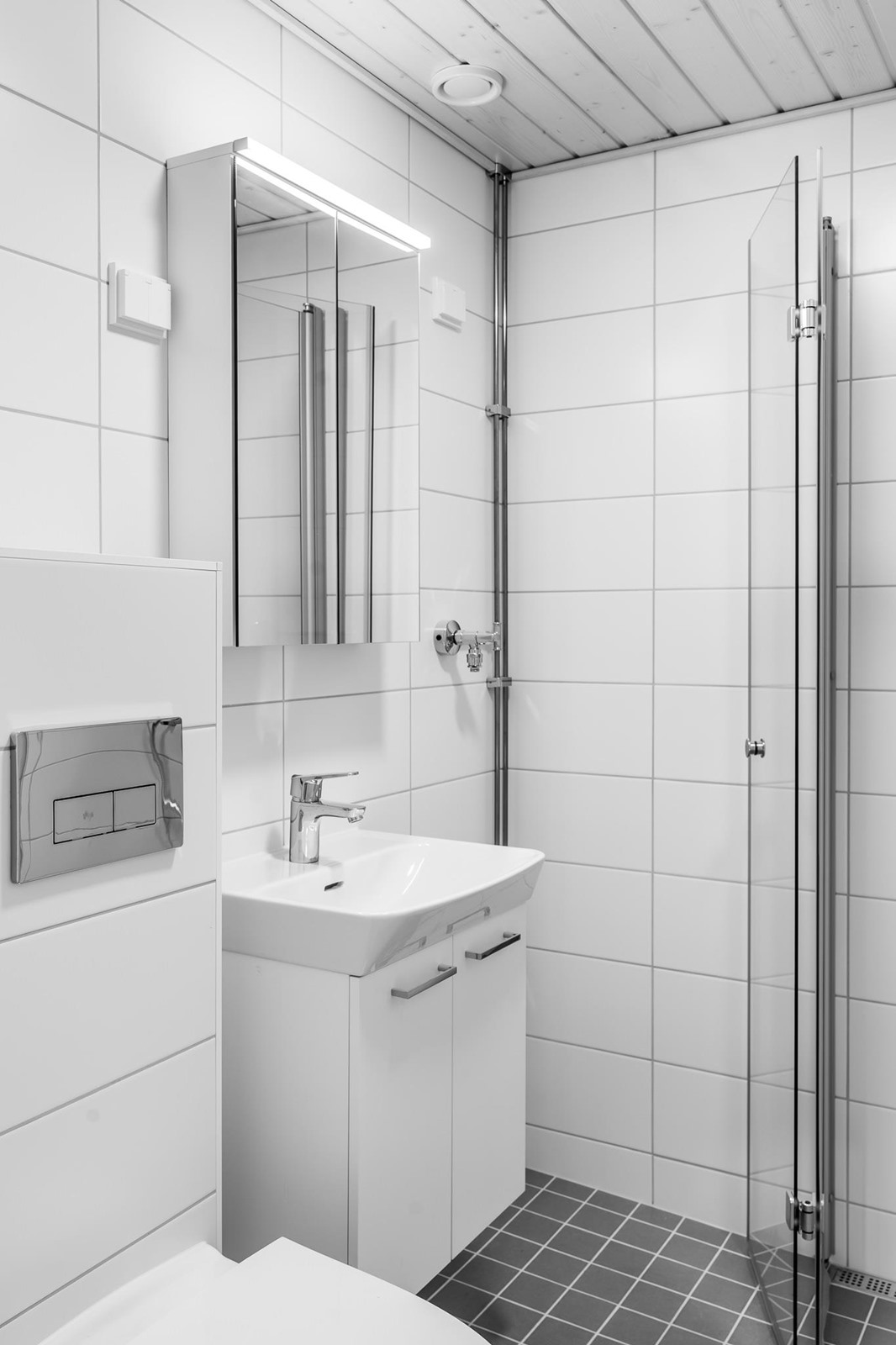 - Kylpyhuone, suihku, suihkuseinä, peilikaappi myös erillisessä wc:ssä, allaskaappi myös erillisessä wc:ssä, pesukoneliitäntä, kiinteät valaisimet.