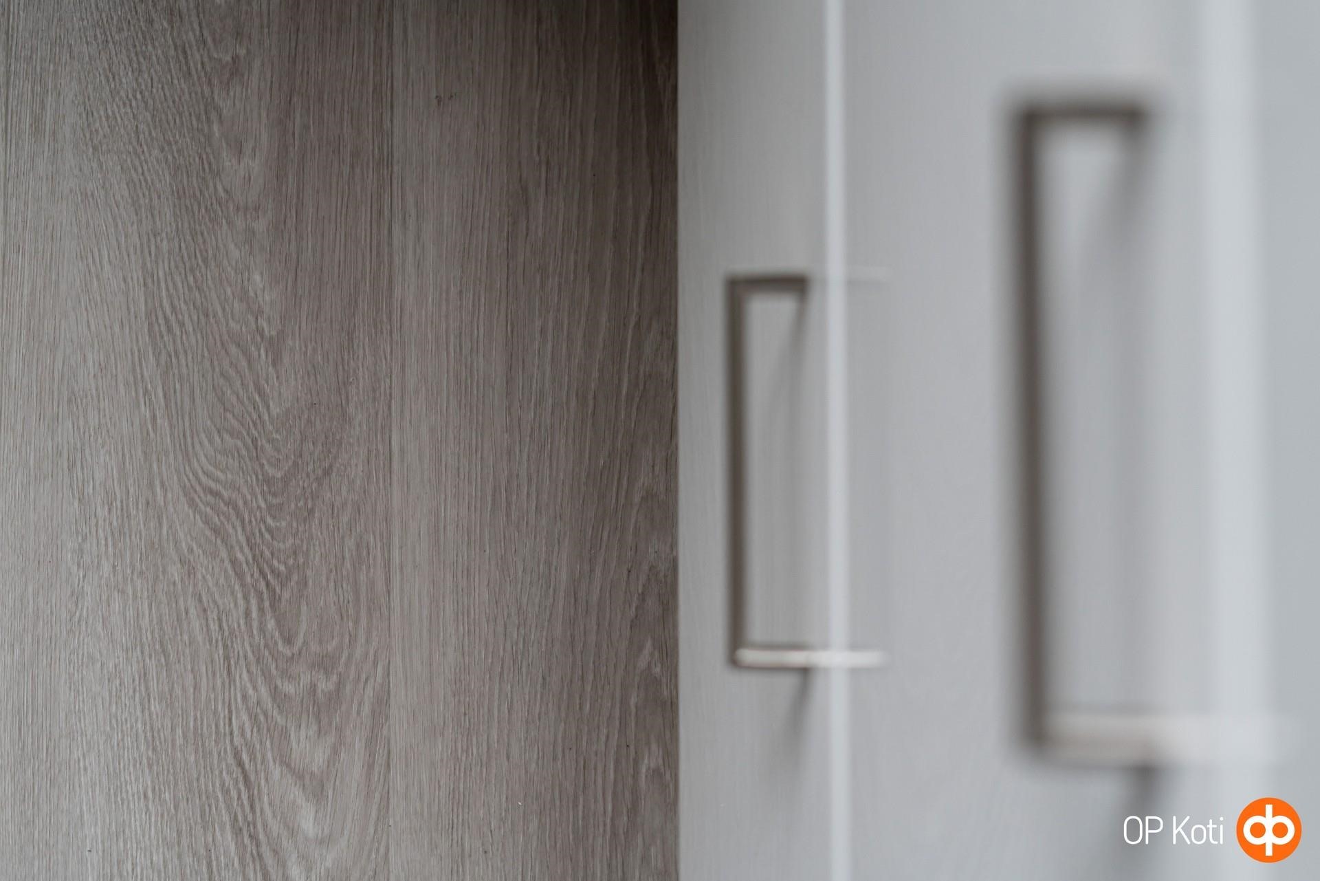 Keittiö: lattia vinyylilankku, seinät maali. Olohuone: lattia vinyylilankku, seinät maali. Makuuhuone 1: lattia vinyylilankku, seinät maali, kiinteät kaapit. Sauna: lattia laattaa, seinät paneeli. Kylpyhuone: lattia ja seinät laattaa.