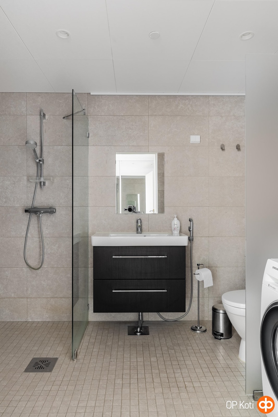 - Kylpyhuone, suihku, suihkuseinä, peilit, allaskaappi, pesukoneliitäntä, lattialämmitys, kiinteät valaisimet. Pyykinpesukone (vm-2020) . Huoneistoon ei ole rakennettu saunaa asukasmuutoksena.