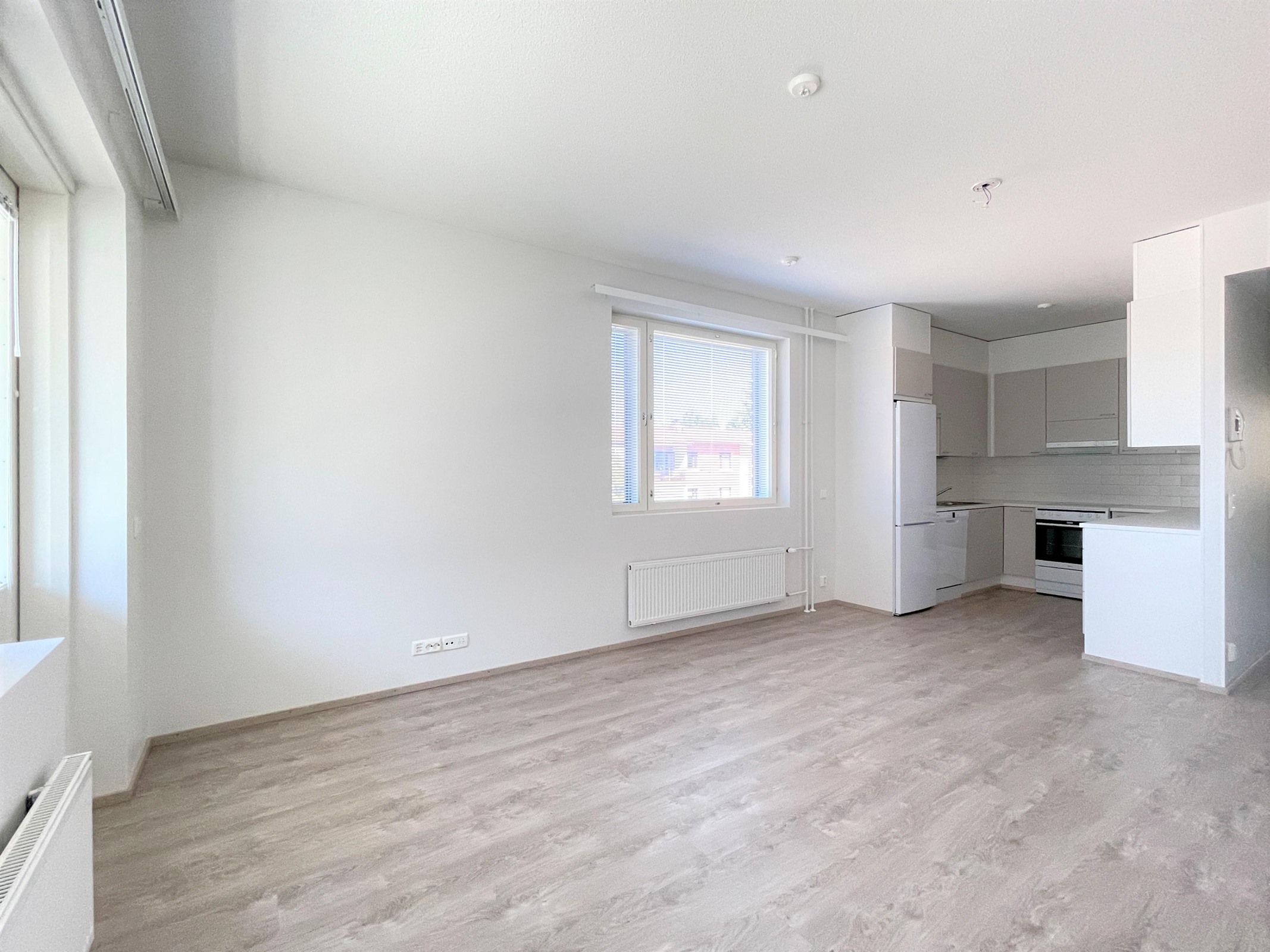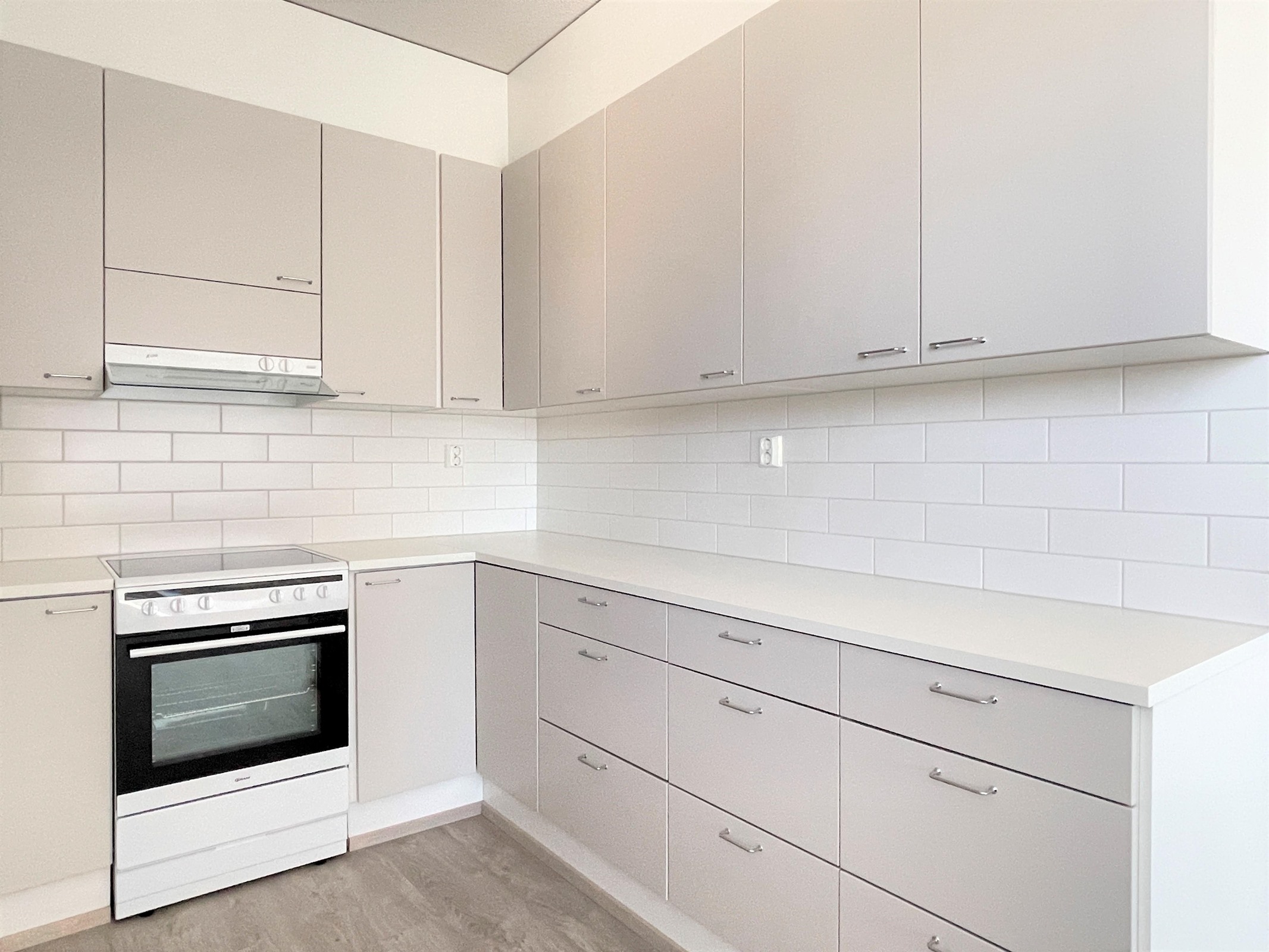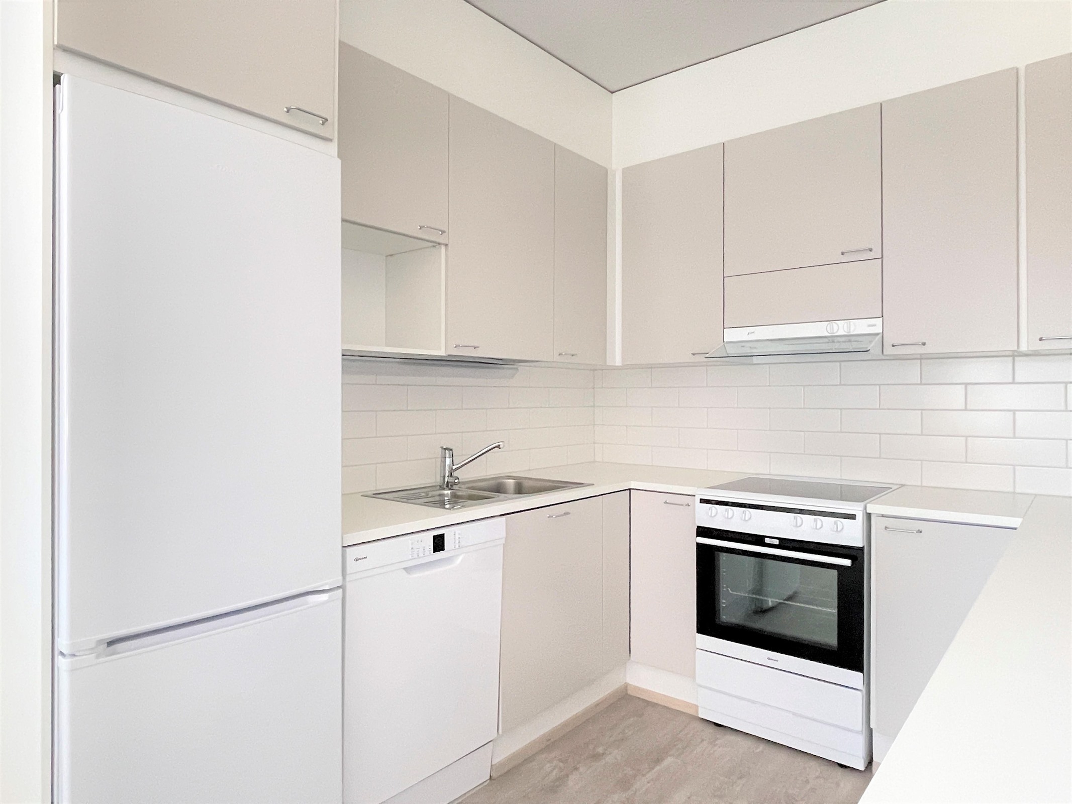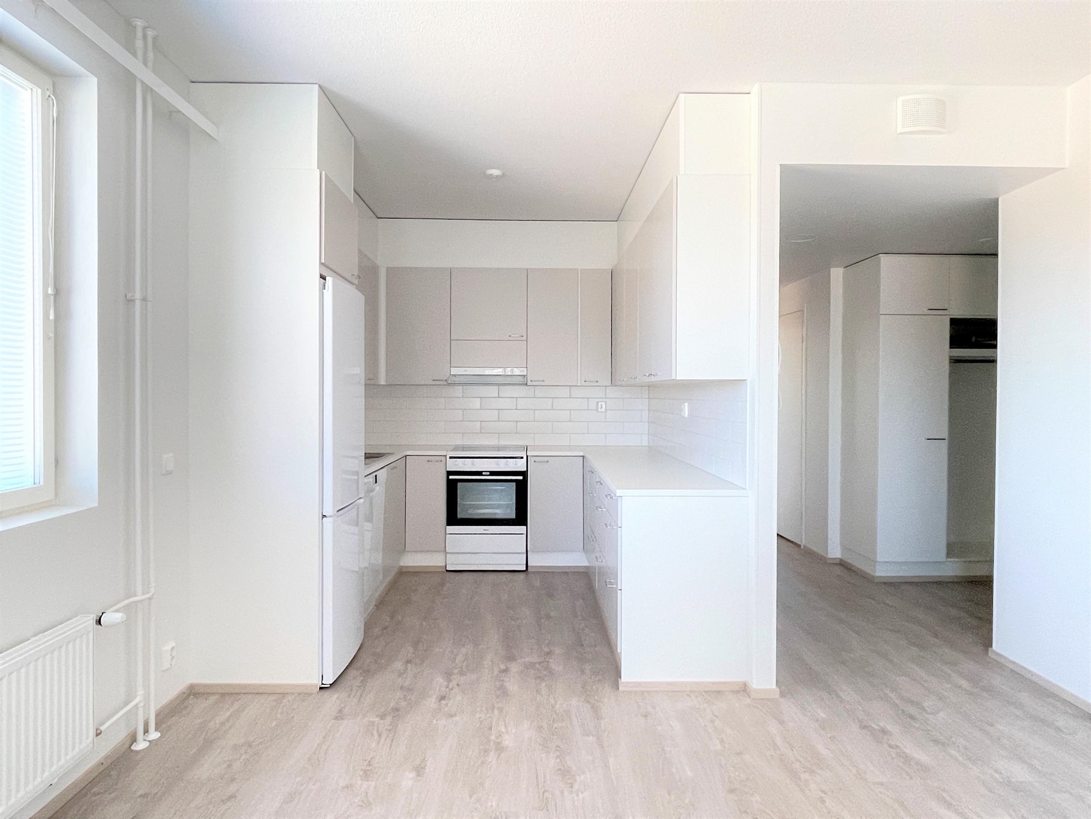- Vaalea keittiö avautuu saumattomasti olohuoneeseen. Varusteina jääkaappipakastin, keraaminen liesi, liesituuletin sekä astianpesukone.