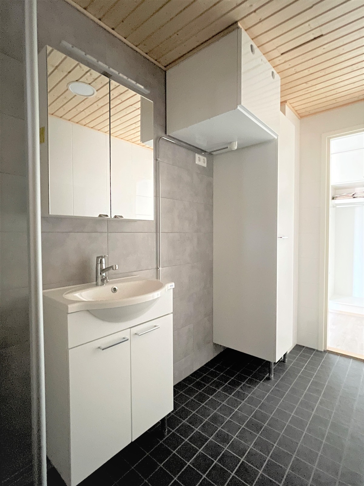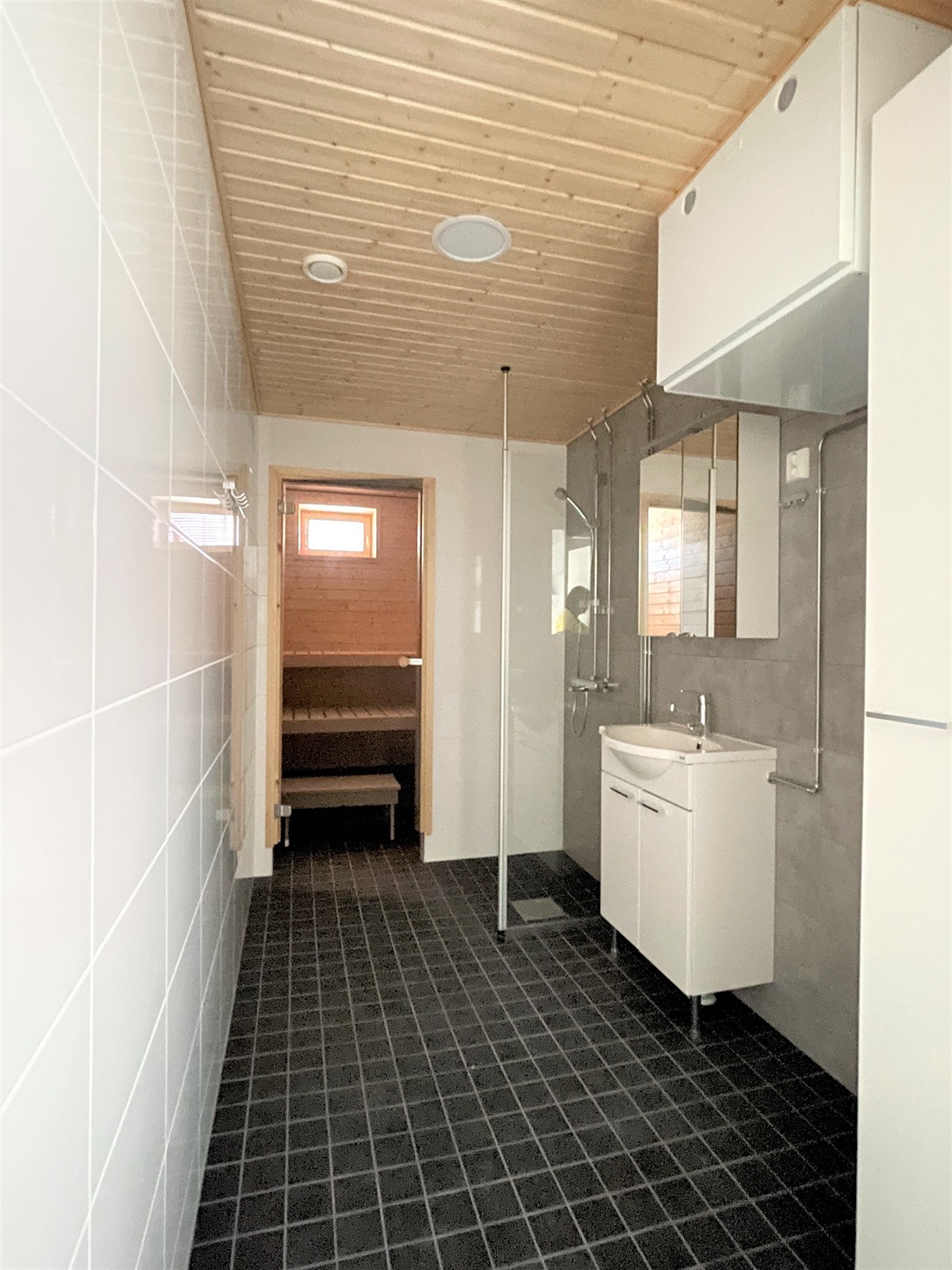 - Tilava kylpyhuone, jossa myös kodinhoito-osio. Suihkutilat erotettu muusta tilasta lasiseinämällä. Ikkunallinen sauna. Erillinen wc.