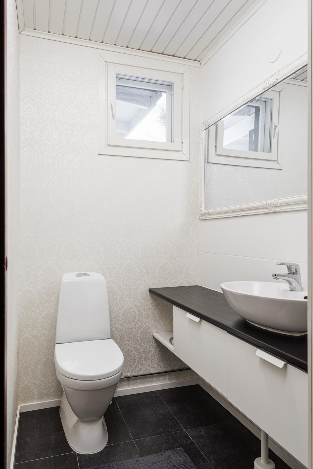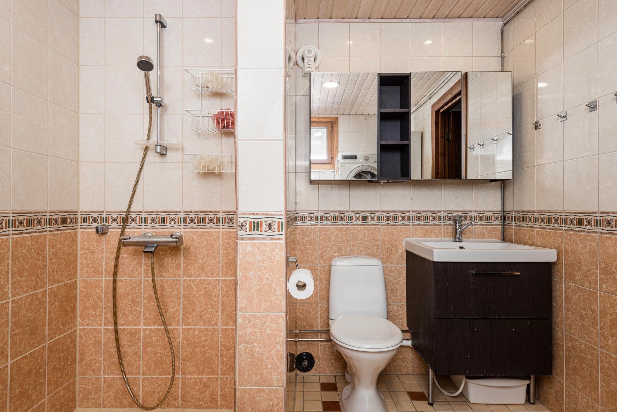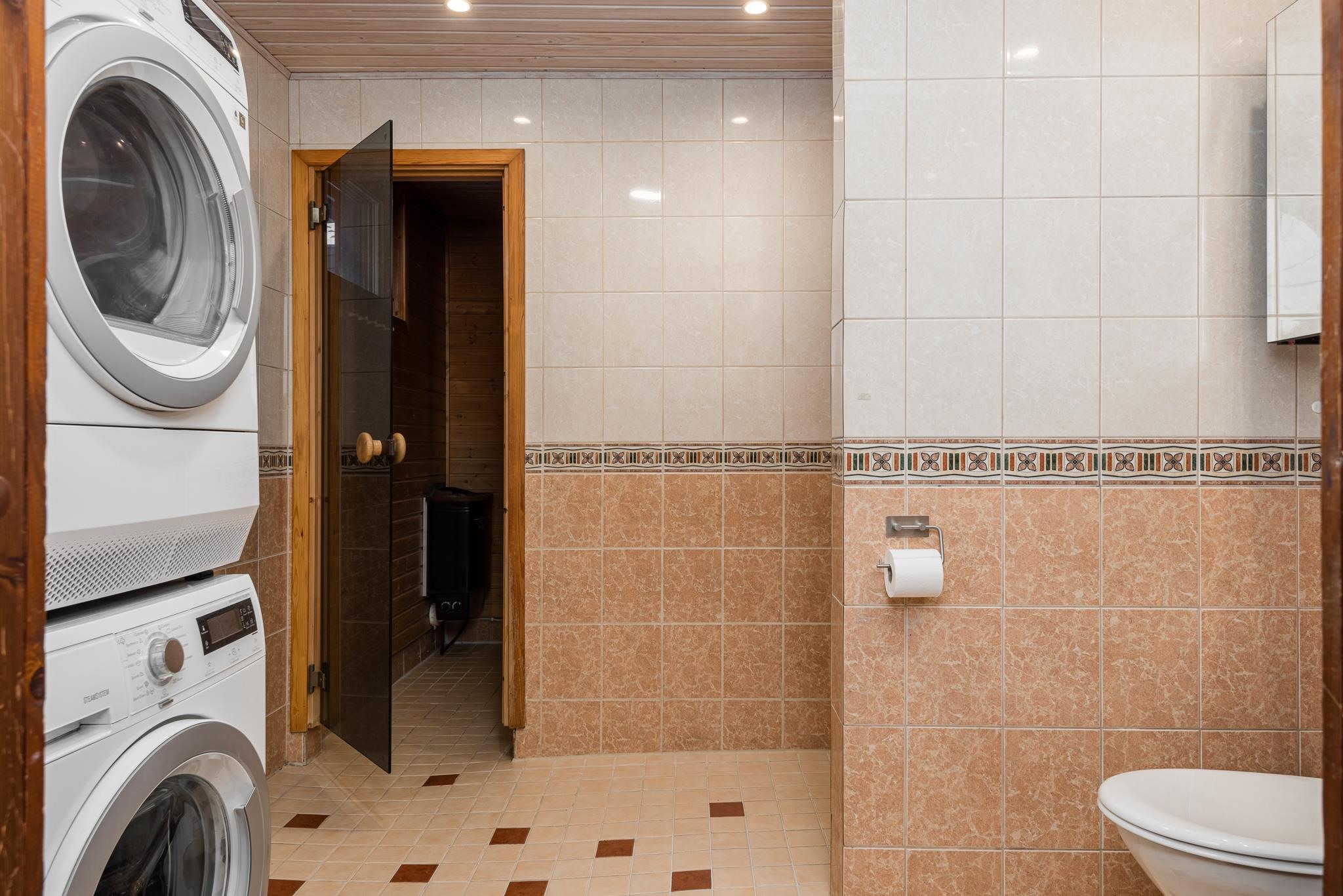- Sauna, sähkökiuas, kylpyhuone /wc, erillinen wc, suihku, peilit, peilikaappi, allaskaappi, pesukoneliitäntä kph, lattialämmitys eteinen +pikku wc+ pesuhuone osittain, kiinteät valaisimet.