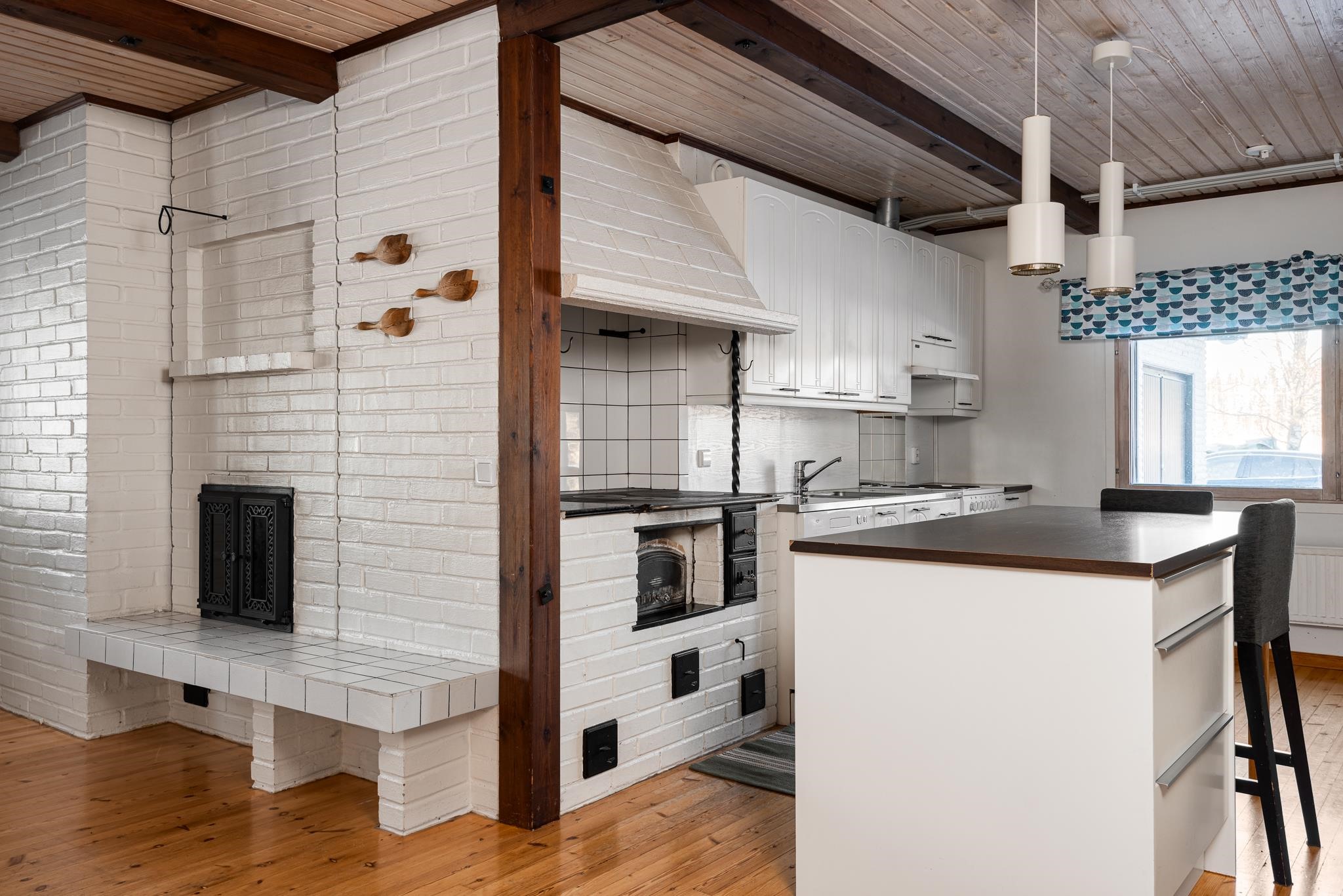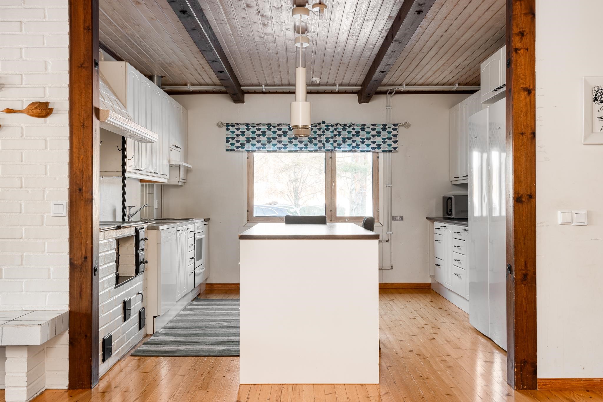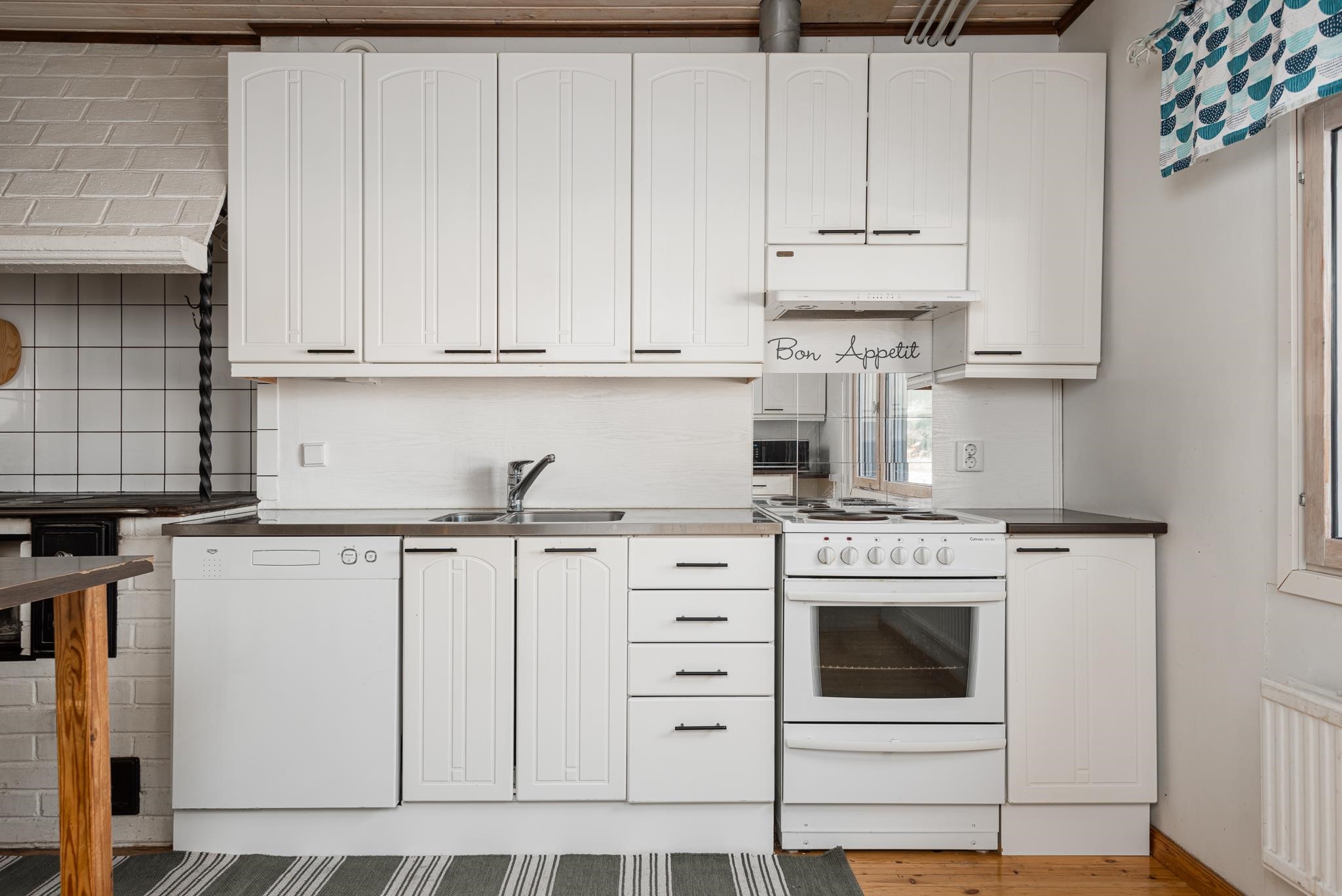 - Jääkaappi, pakastekaappi, sähköliesi, liesituuletin, leivinuuni, astianpesukone, kaapistot, kiinteät valaisimet.