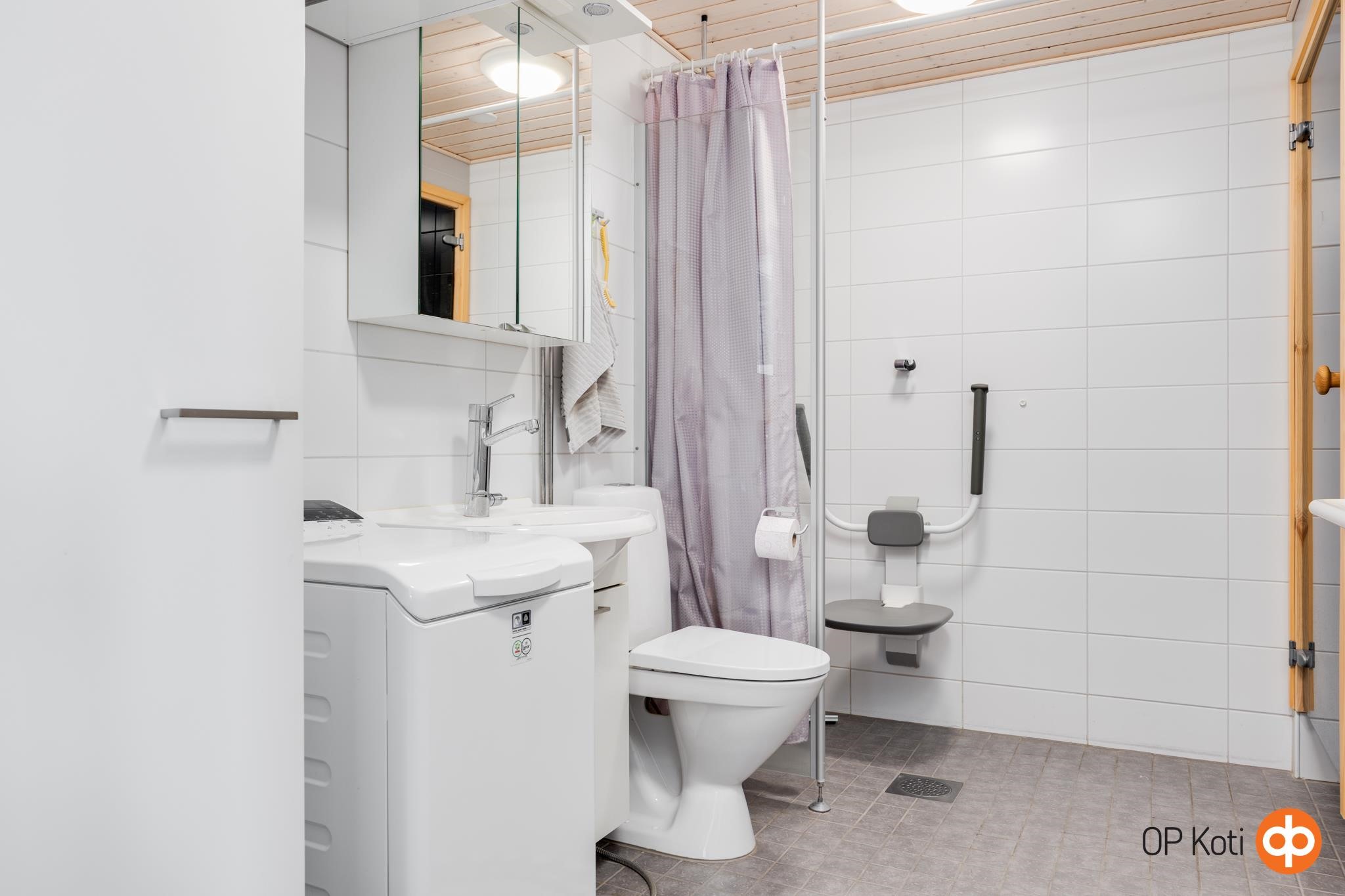 - Sauna Lauteita ja kiuasta ei ole asennettu, kylpyhuone, suihkuseinä, peilikaappi, allaskaappi, pesukoneliitäntä, lattialämmitys, kiinteät valaisimet. -