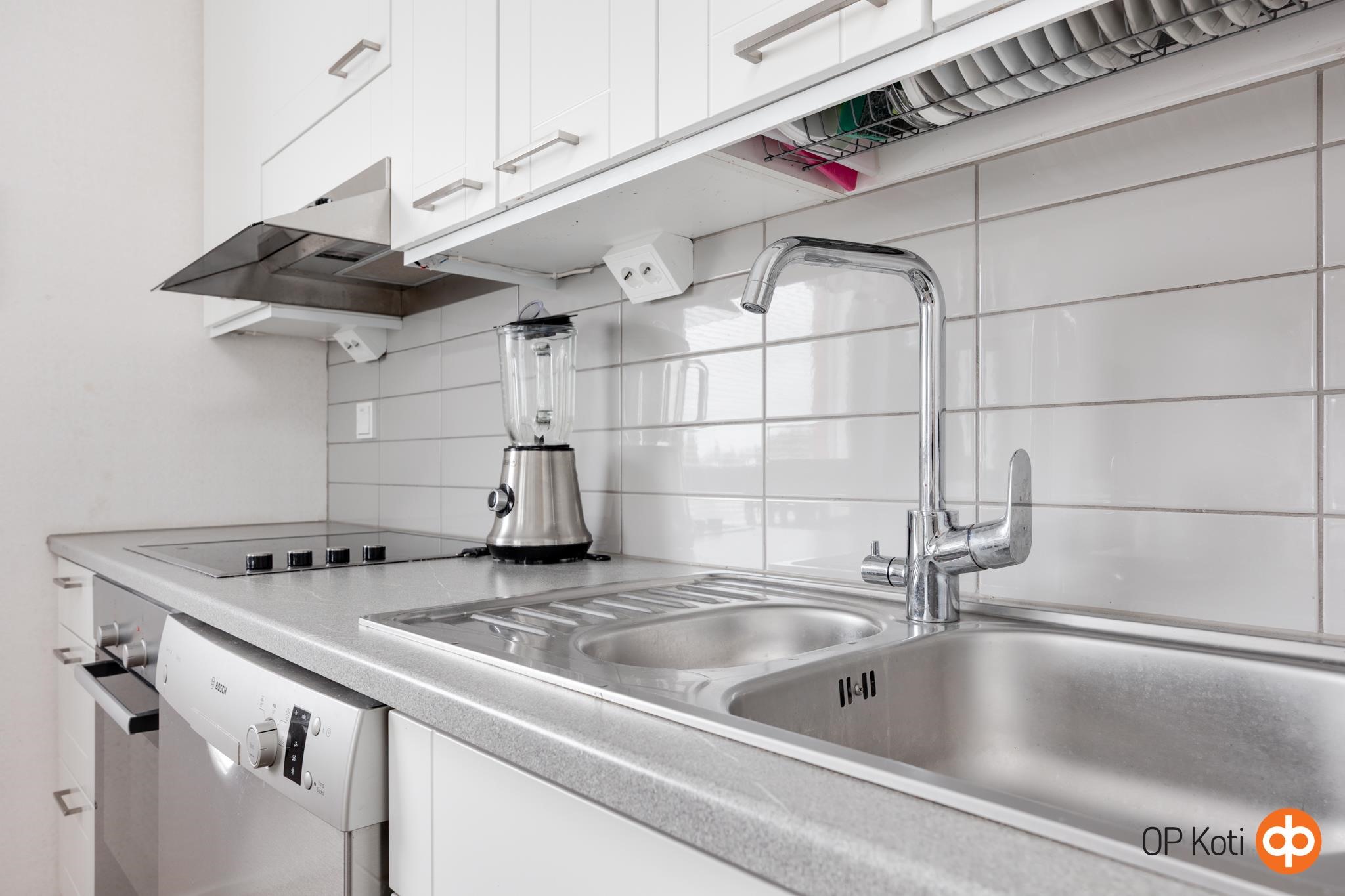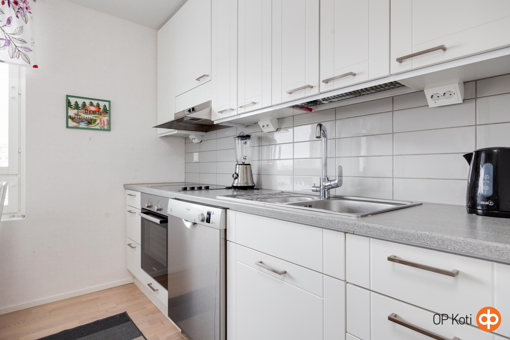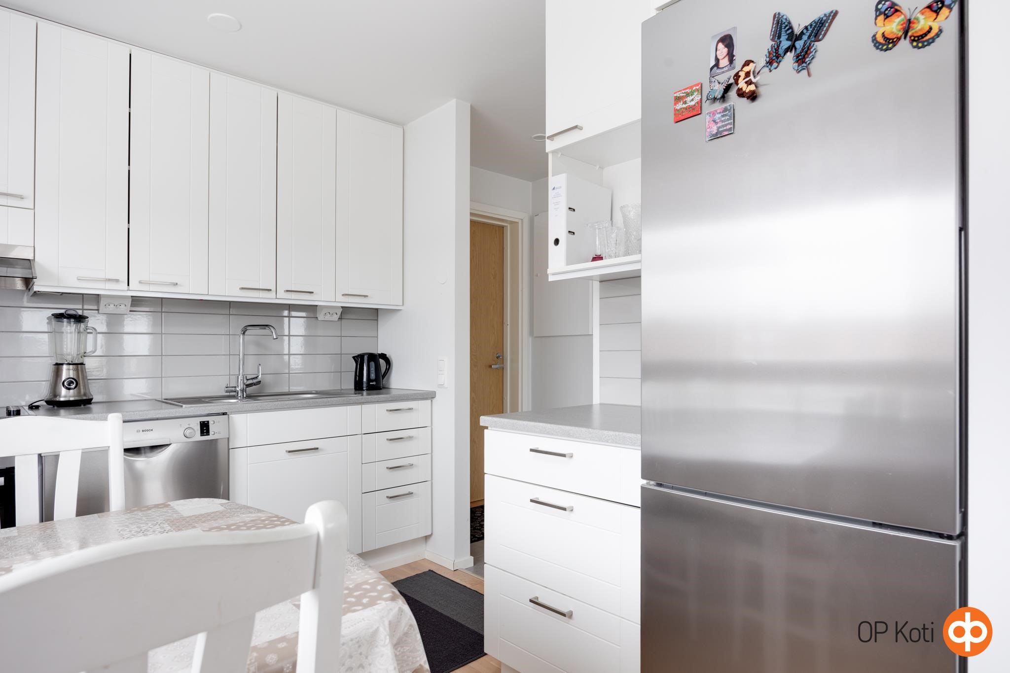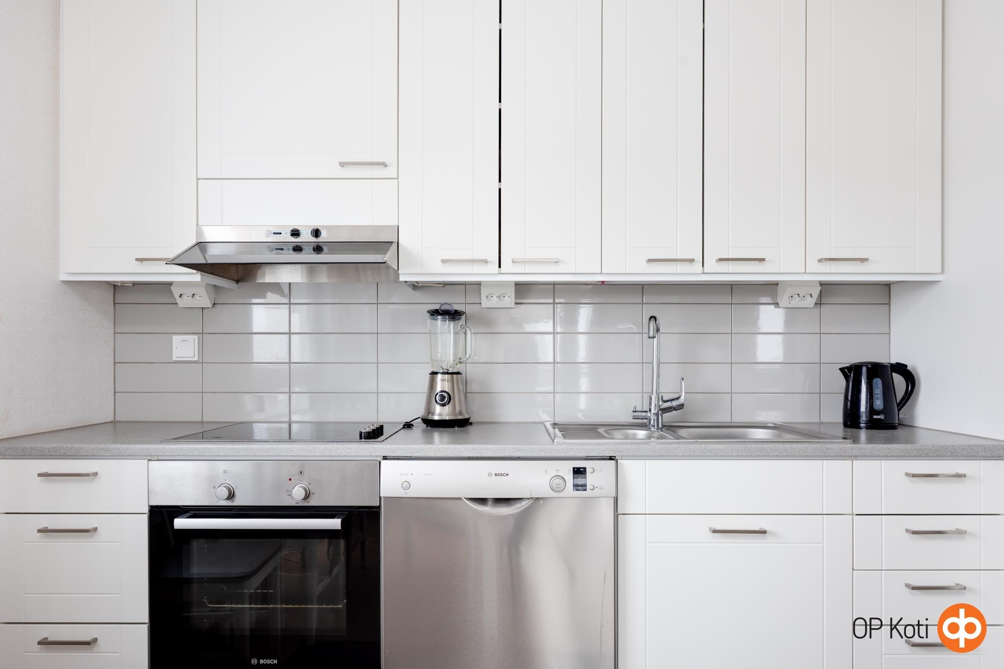 - Jääkaappipakastin, lattialiesi, keraaminen liesi, liesituuletin, astianpesukone, kaapistot, kiinteät valaisimet. -