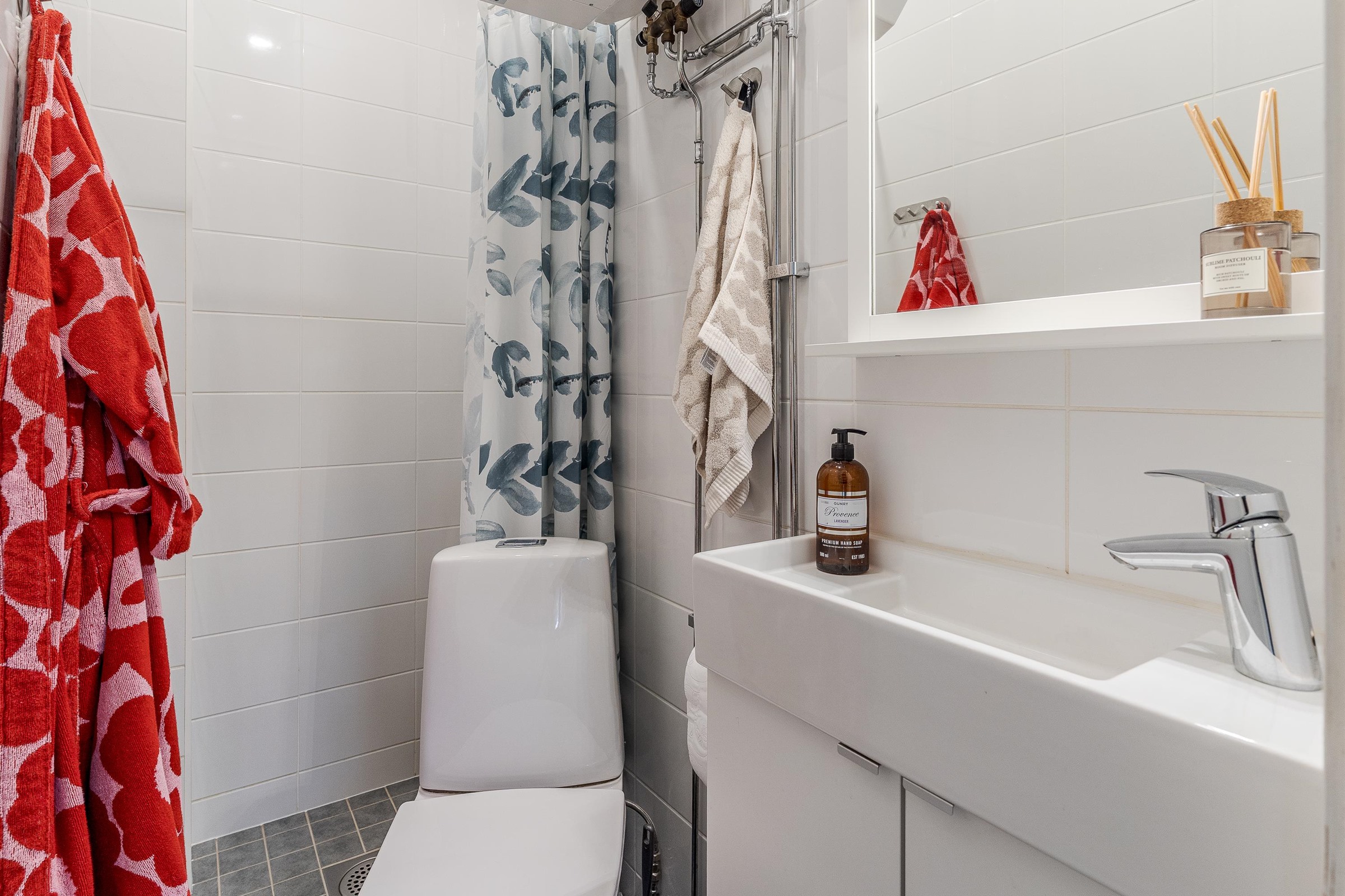 - Kylpyhuone, suihku, peilikaappi, allaskaappi, lattialämmitys, kiinteät valaisimet.