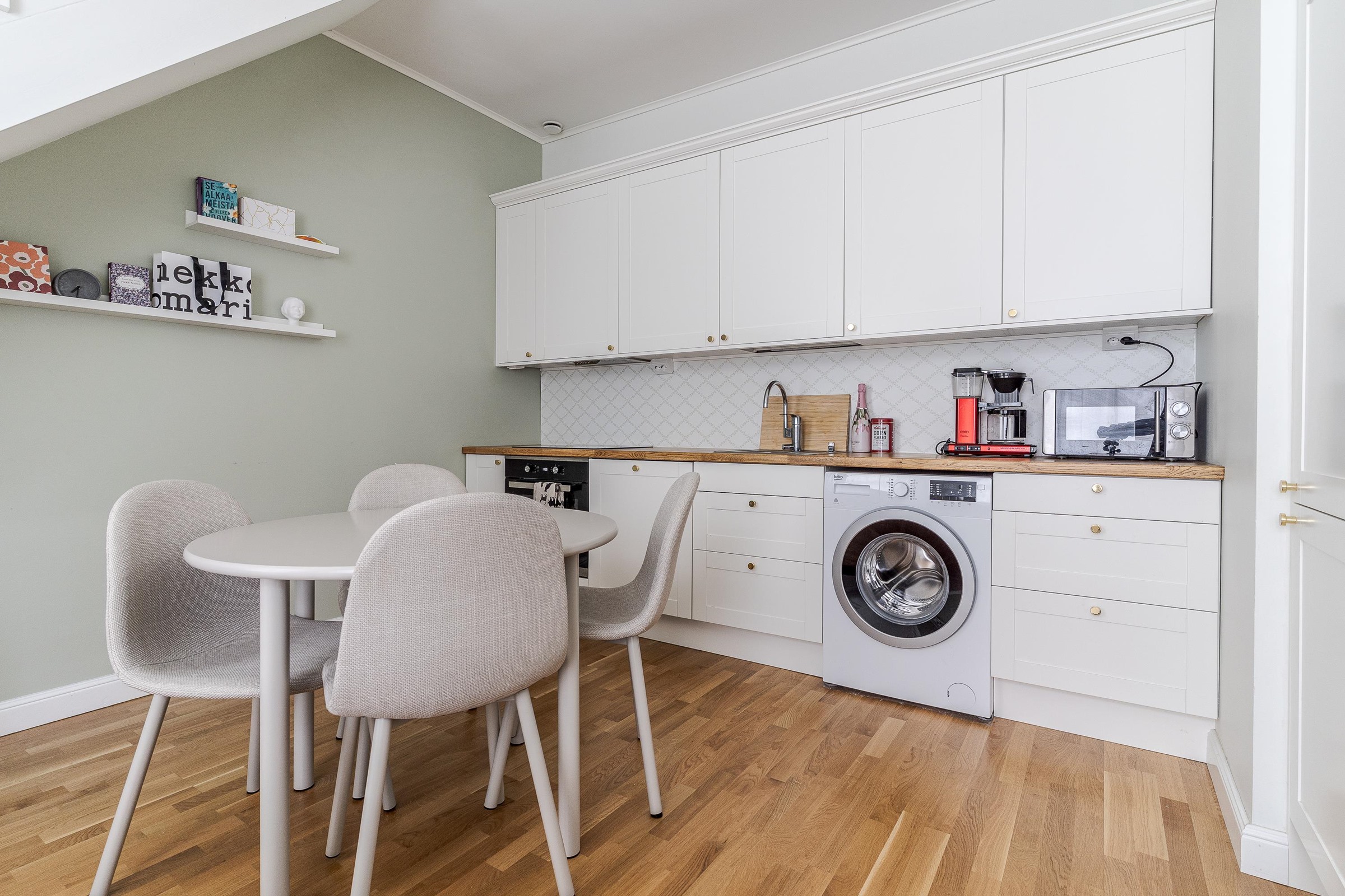 - Jääkaappipakastin, erillisuuni, induktioliesi, liesituuletin (aktiivihiilisuodattimella), astianpesukone, kaapistot, kiinteät valaisimet. Tasot massiivipuuta, Pyykinpesukone kuuluu keittiön varusteluun