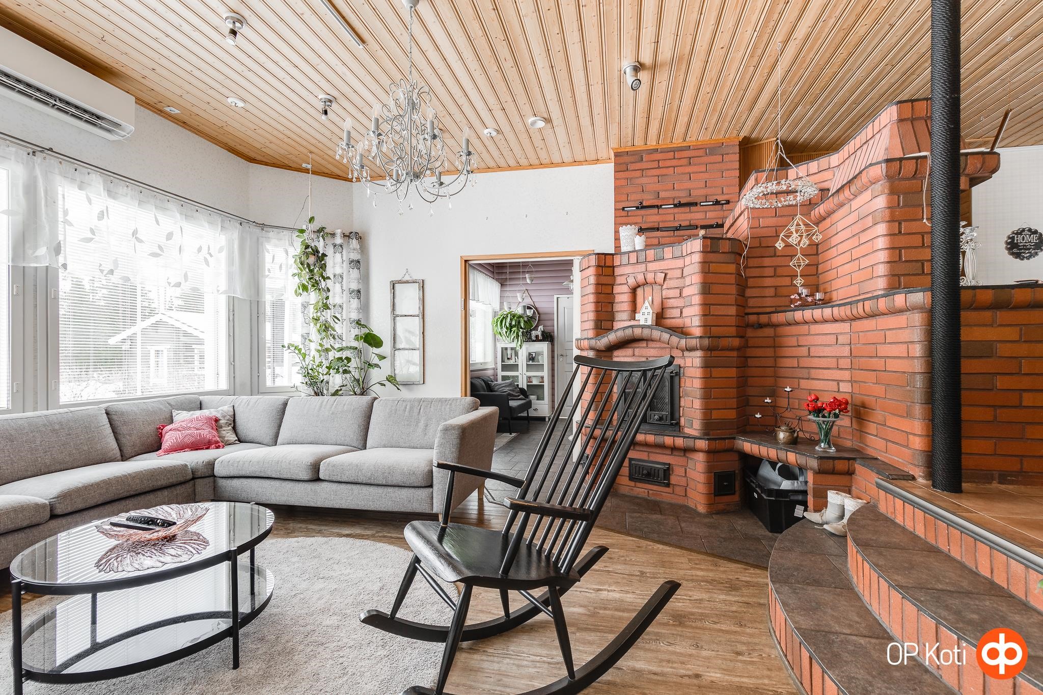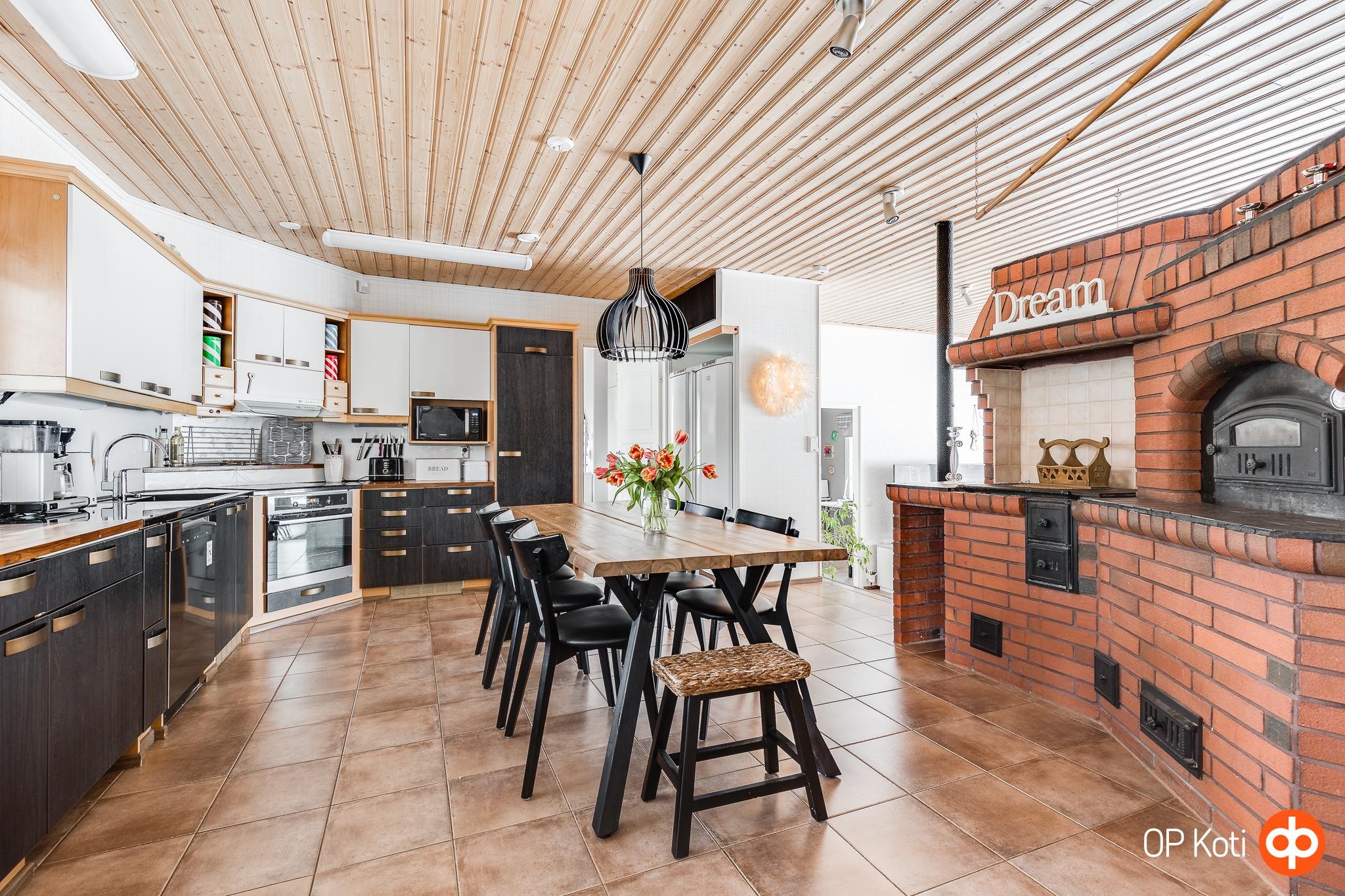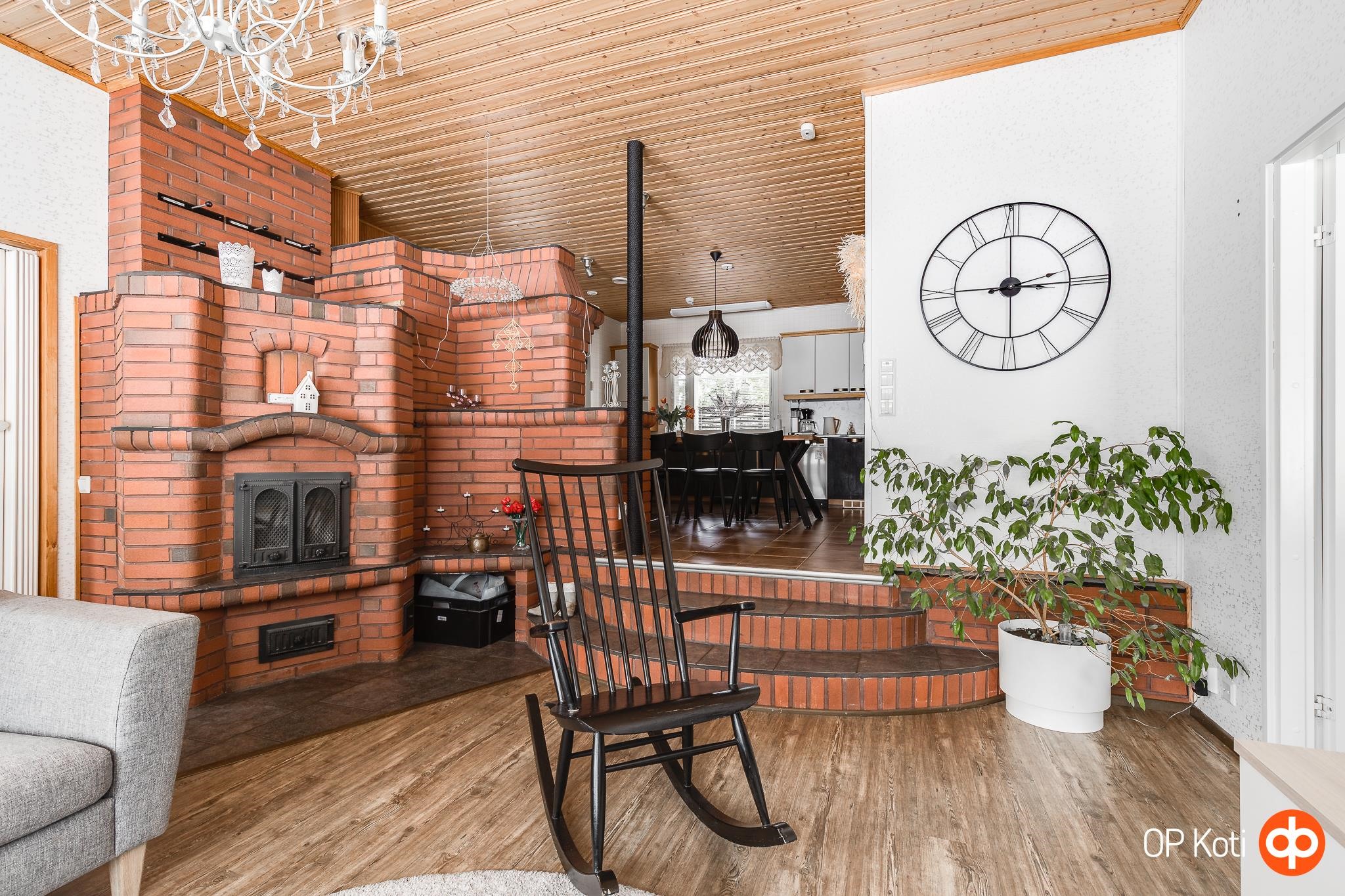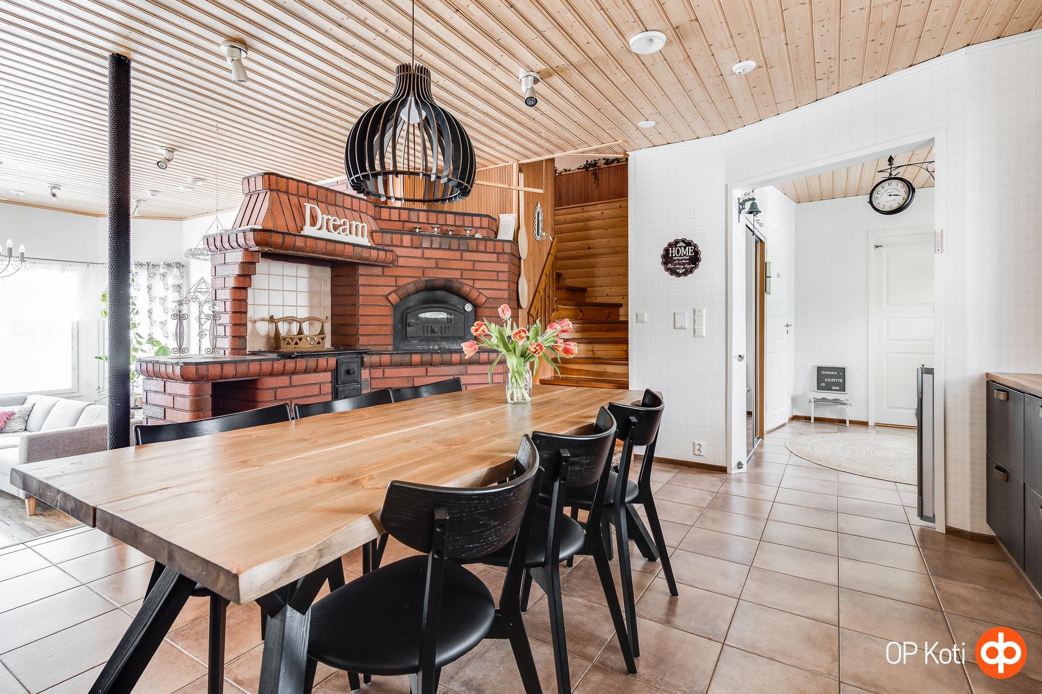 Tässä kodissa arki sujuu vaivattomasti monipuolisen tilaratkaisun ansiosta. Ensimmäisessä kerroksessa on kolme makuuhuonetta, tunnelmalliset oleskelutilat sekä muutama vuosi sitten remontoitu saunaosasto. Keittiössä yhdistyvät käytännöllisyys ja tunnelma, sillä varustukseen kuuluu leivinuuni ja puuhella. Kurasyöpöllä ja runsaalla kaappitilalla varustettu kodinhoitohuone helpottaa arjen askareita, ja kaksi erillistä wc:tä antavat joustavuutta. Yläkerrassa avara aulatila toimii oleskelu- tai työtilana, ja makuuhuoneet tarjoavat runsaasti yksityisyyttä perheenjäsenille.