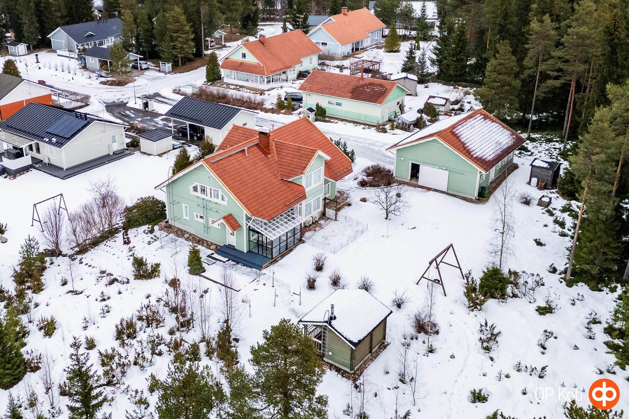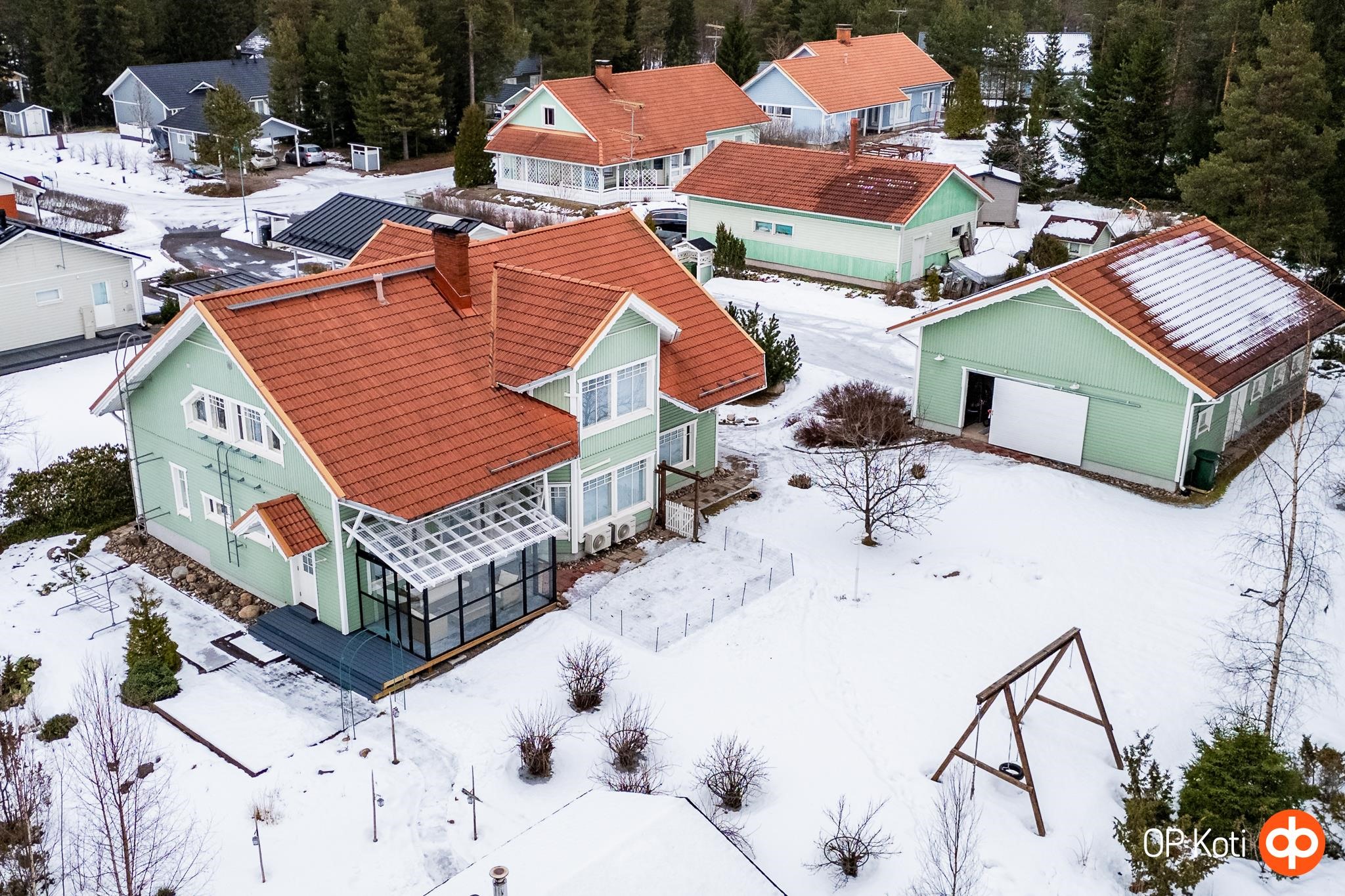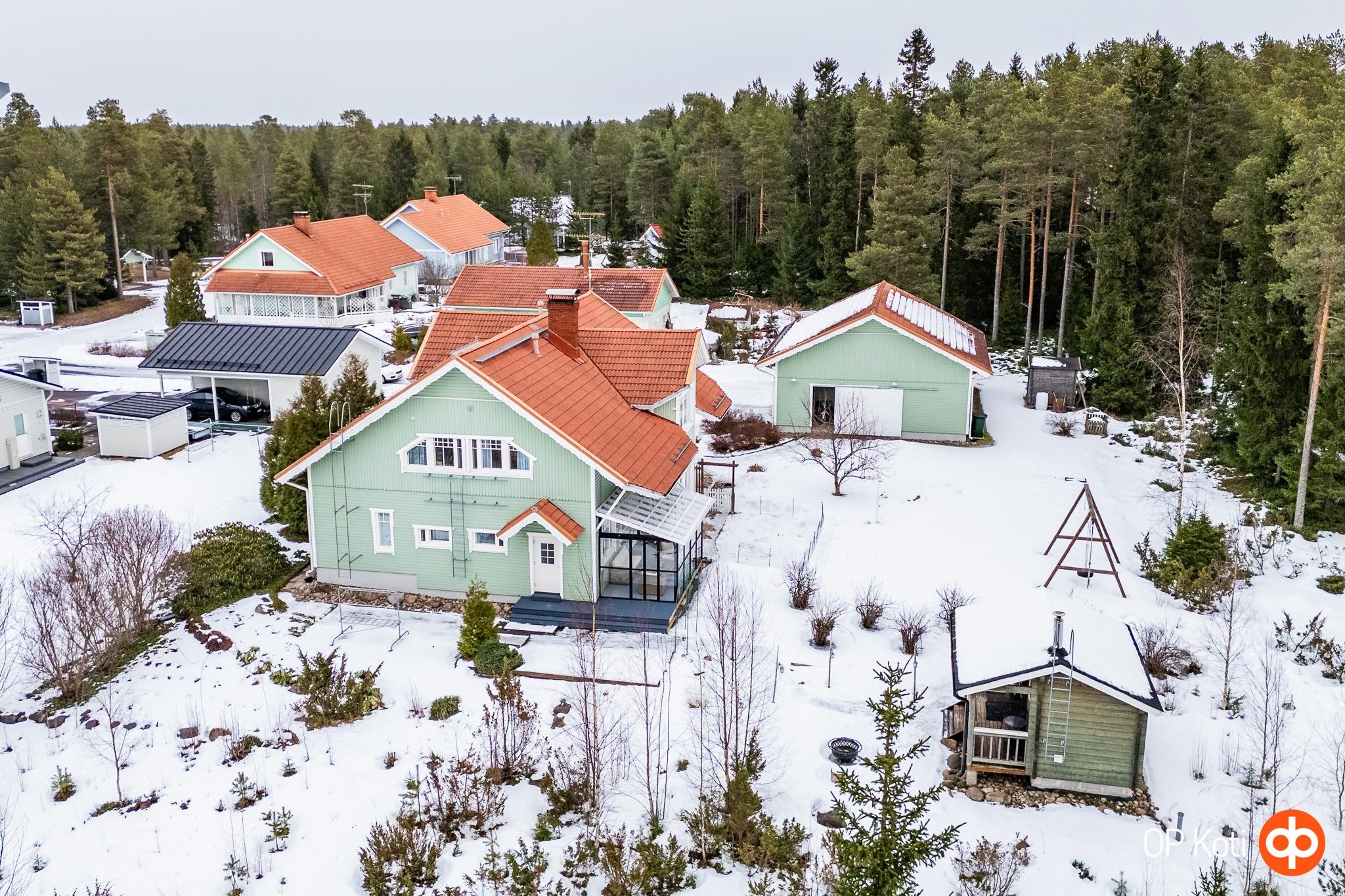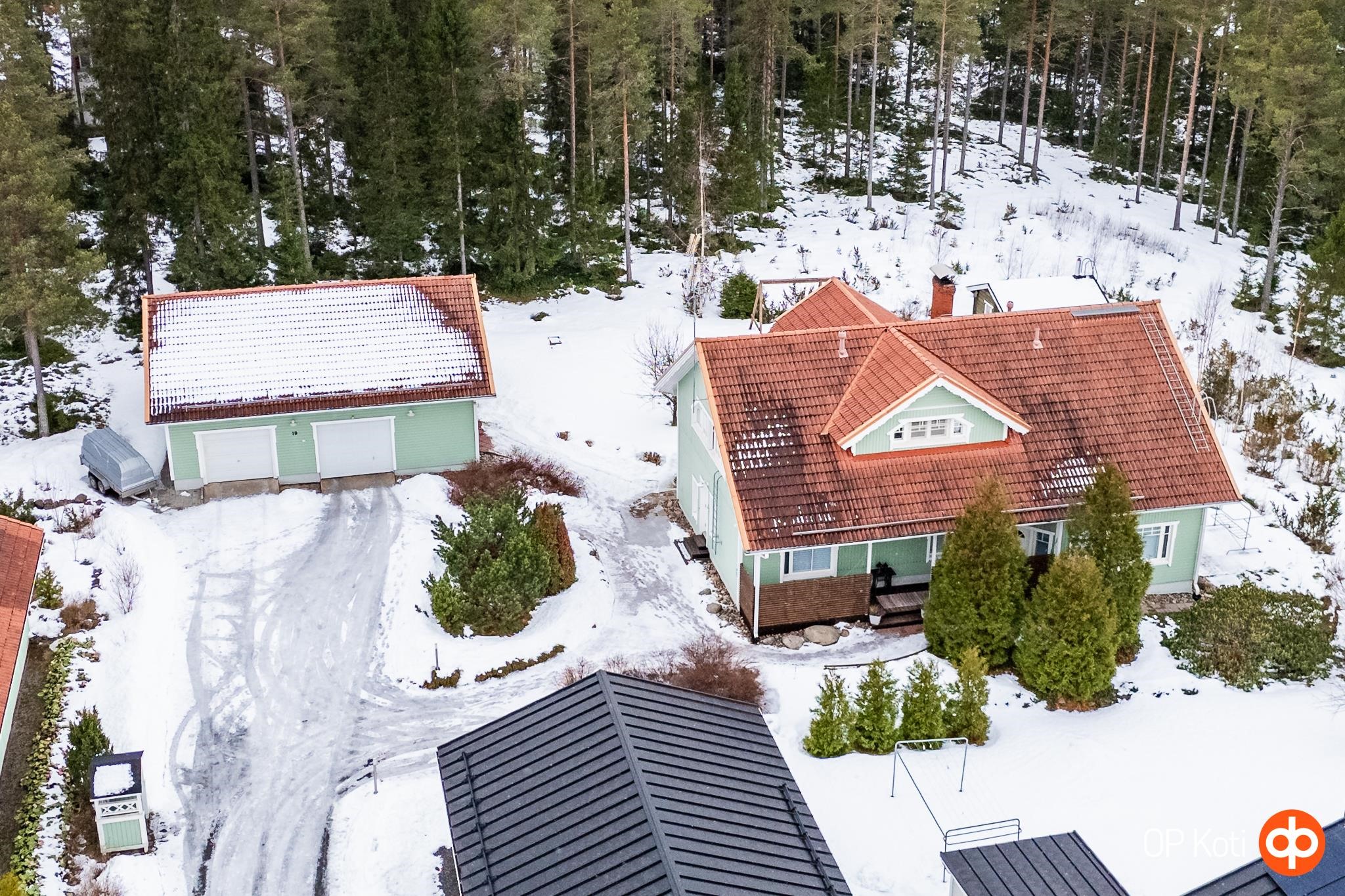 Vuonna 2001 rakennetun talon lämmityksestä huolehtii kaukolämpö yhdistettynä lattialämmitykseen, minkä lisäksi kaksi ilmalämpöpumppua tuovat energiatehokkuutta sekä toisaalta viilennystä kesäisin. Pihapiiri rajautuu metsän reunaan ja tarjoaa näin suojaisan ympäristön asumiseen. Katettu ja lasitettu terassi kutsuu nauttimaan ulkoilmasta pitkälle syksyyn. Autotalli- ja varastorakennuksessa on tilaa kahdelle autolle sekä runsaasti säilytystilaa. Metsän reunaan rakennettu erillinen pihasauna tuo arkeen ripauksen ylellisyyttä, ja liiteri helpottaa polttopuiden säilytystä.