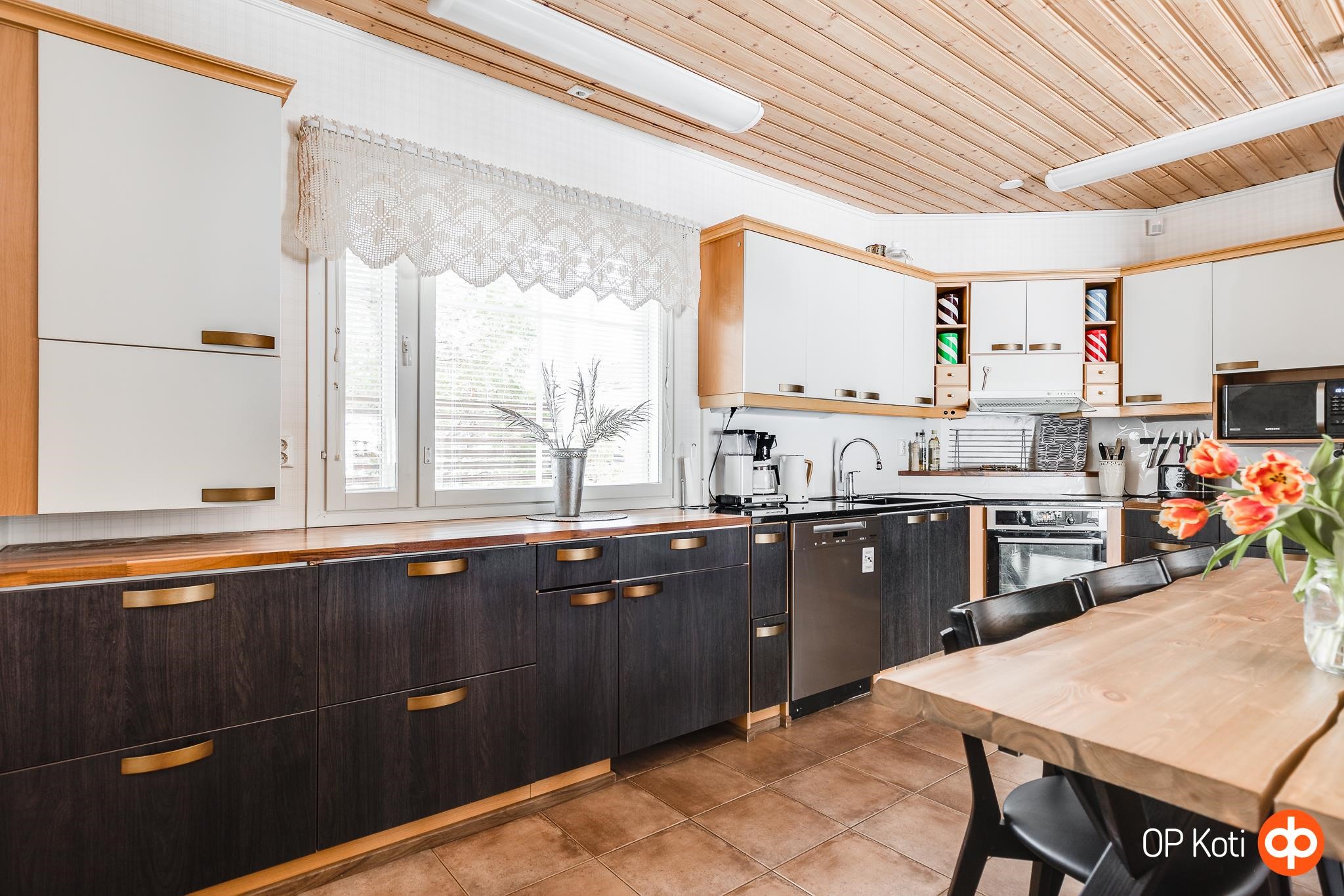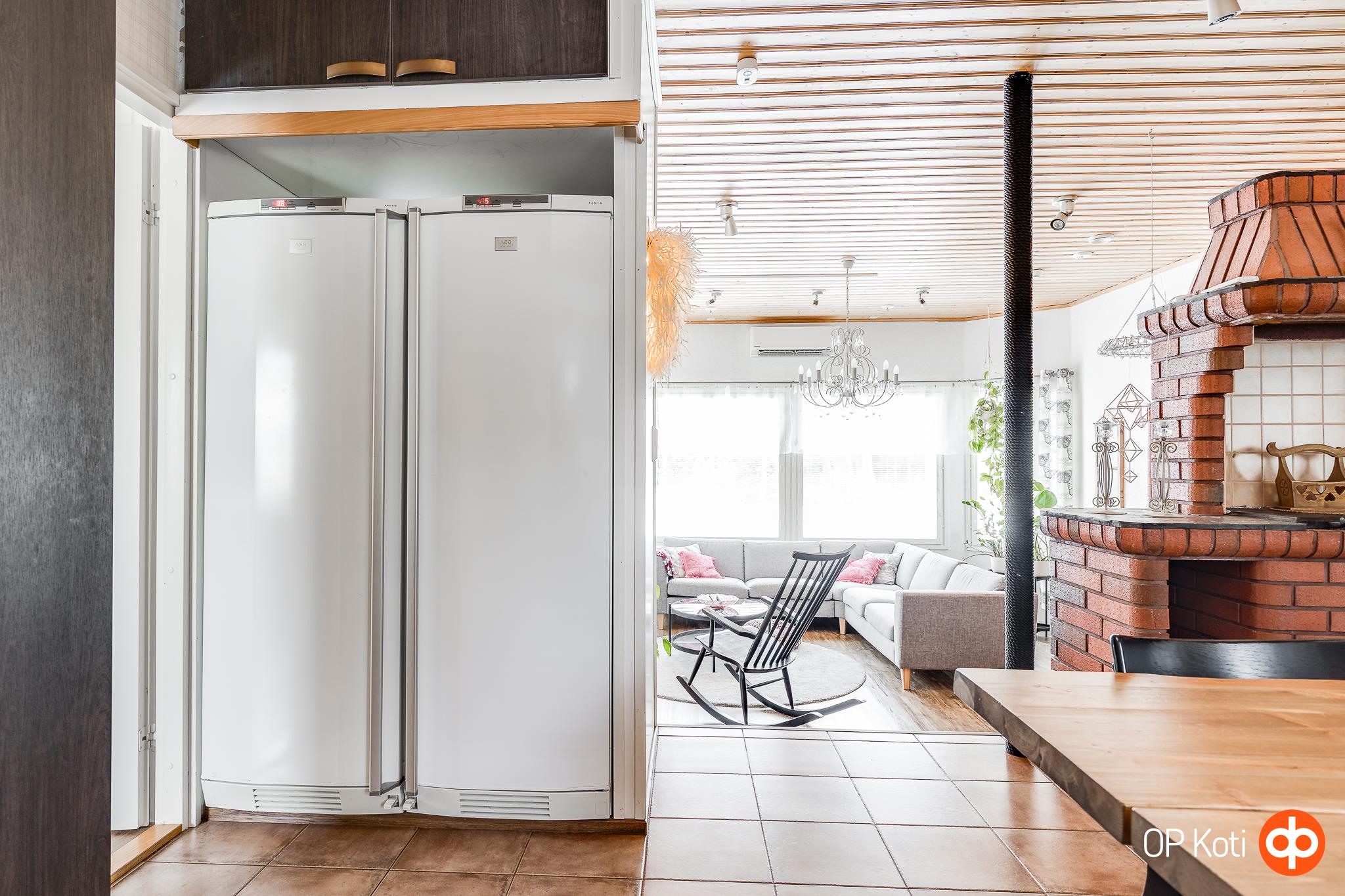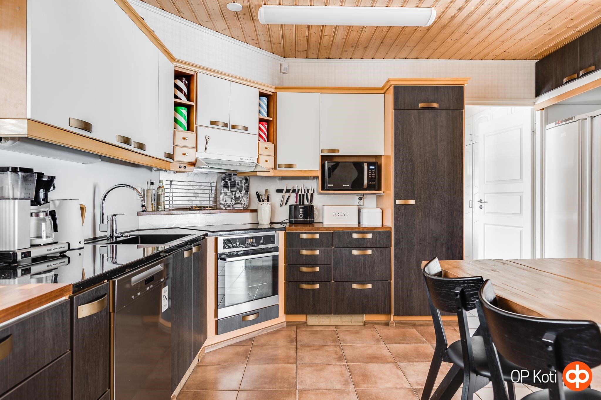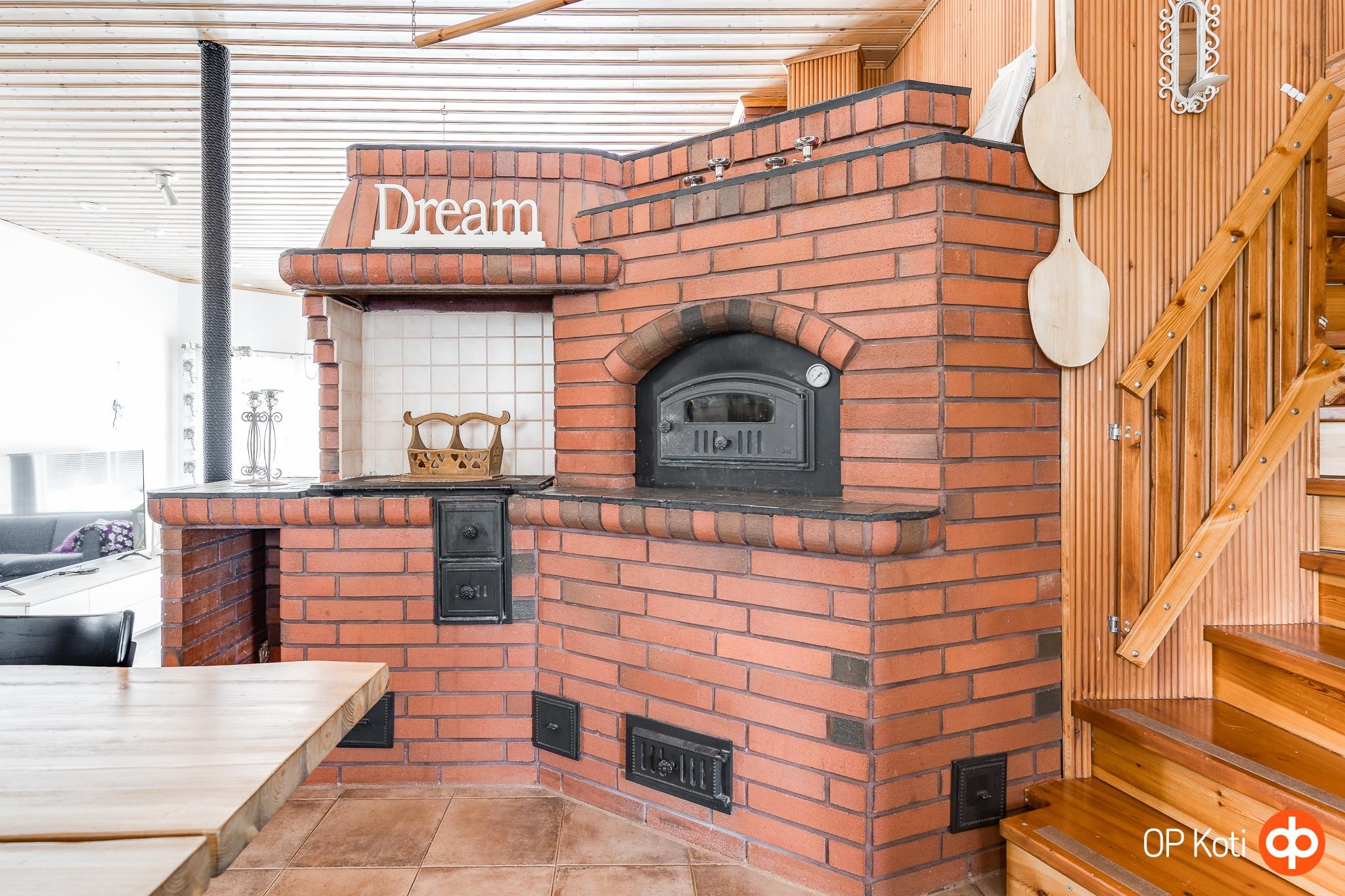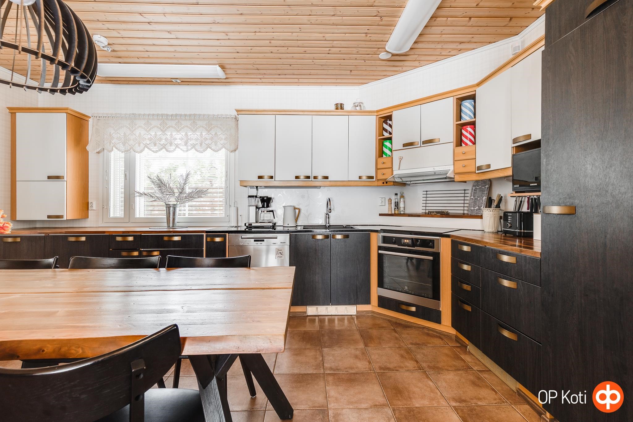 - Jääkaappi, pakastekaappi, erillisuuni, liesitaso (induktio), liesituuletin (talotuuletin), leivinuuni, astianpesukone, kaapistot, kiinteät valaisimet, pöytätasojen materiaali Massiivipuu / kivi. Puuhella