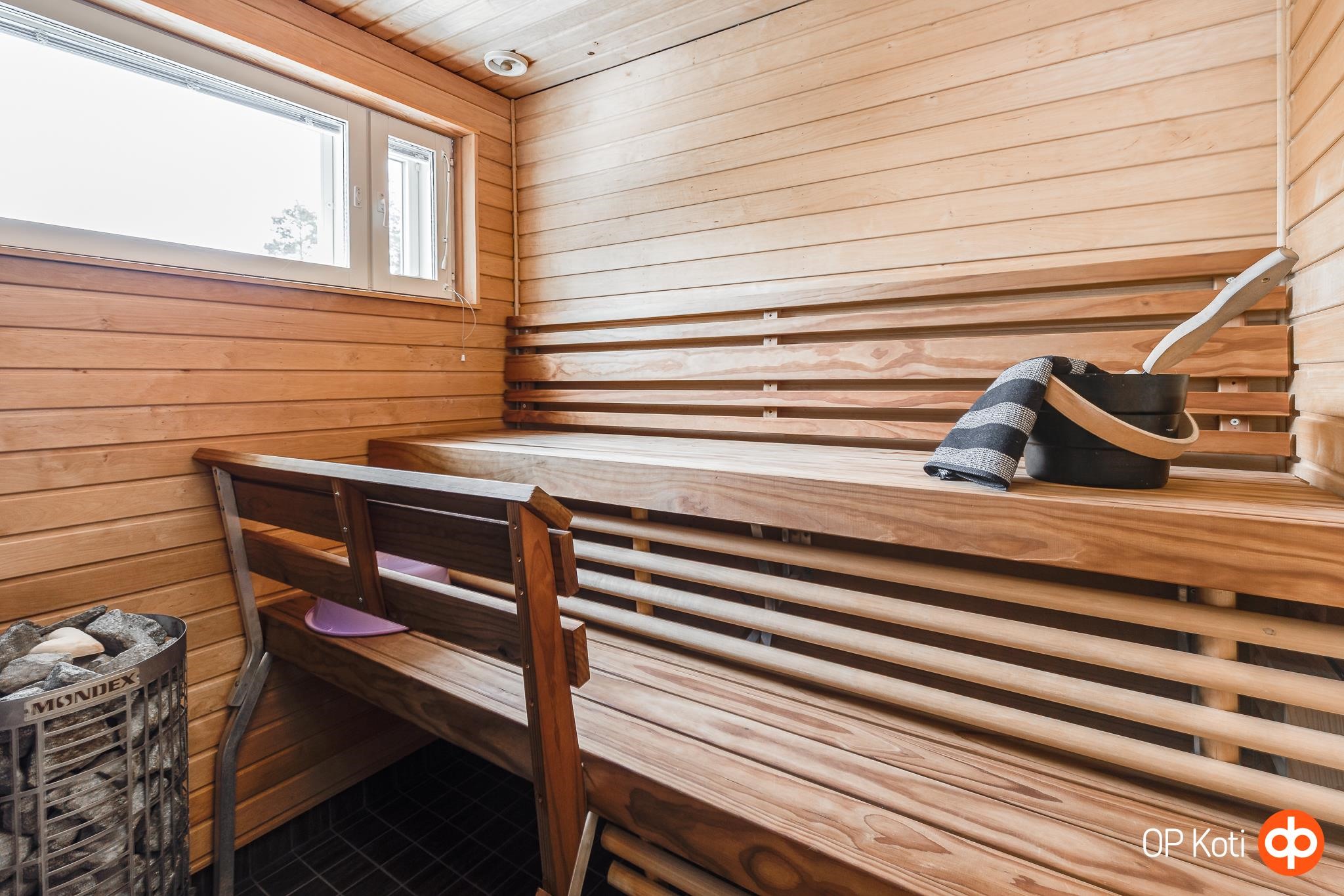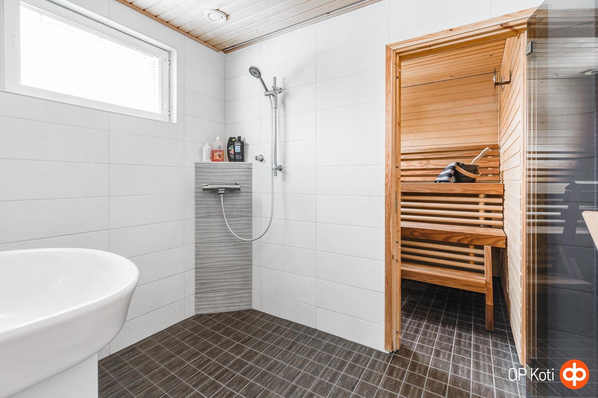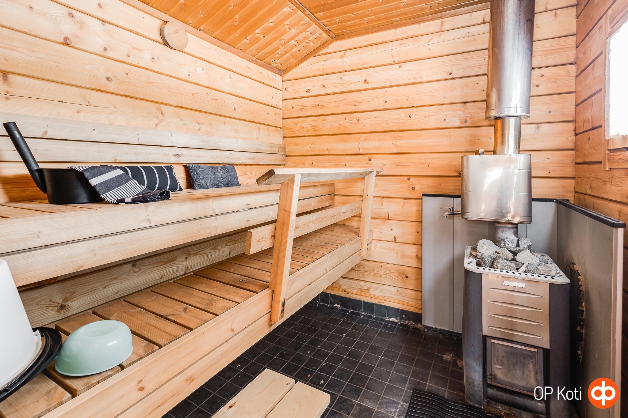 - Sauna, sähkökiuas (pilarikiuas), puukiuas, kylpyhuone, erillinen wc (2 kpl), suihku, peilikaappi (wc-tiloissa), kaapit, allaskaappi, pesukoneliitäntä, lattialämmitys, kiinteät valaisimet. Kylpyhuone ja sauna remontoitu 2021. Erillinen pihasauna, jossa puukiuas.