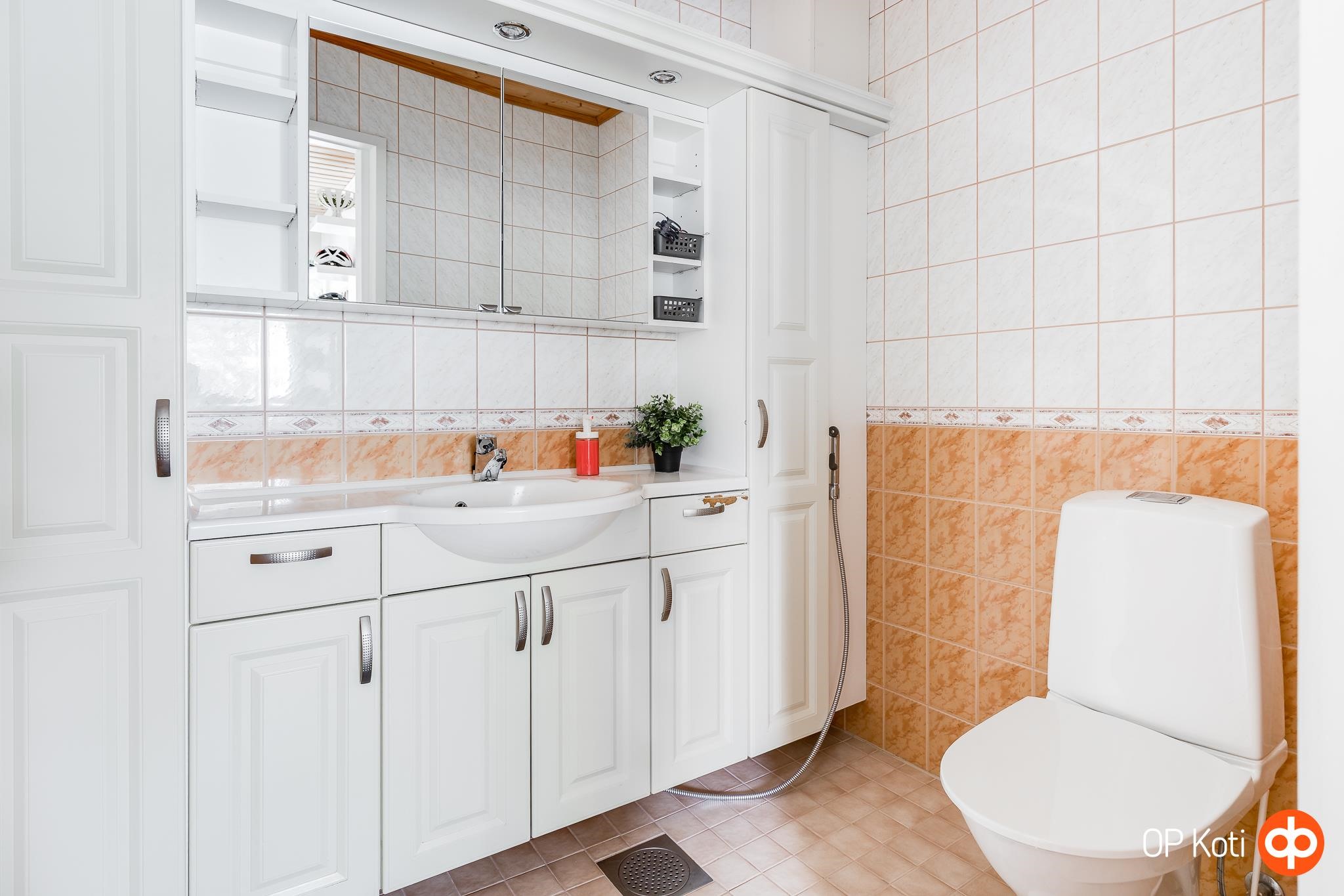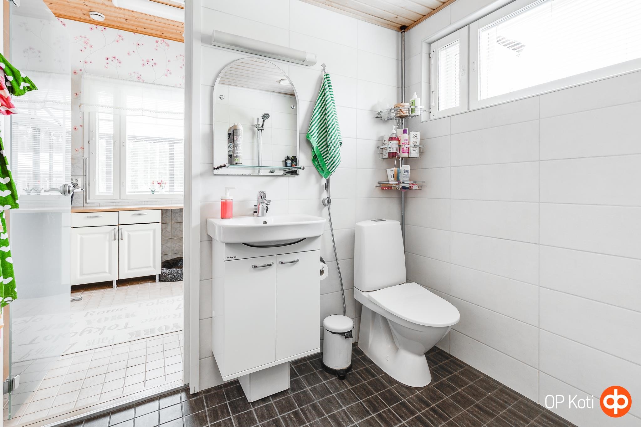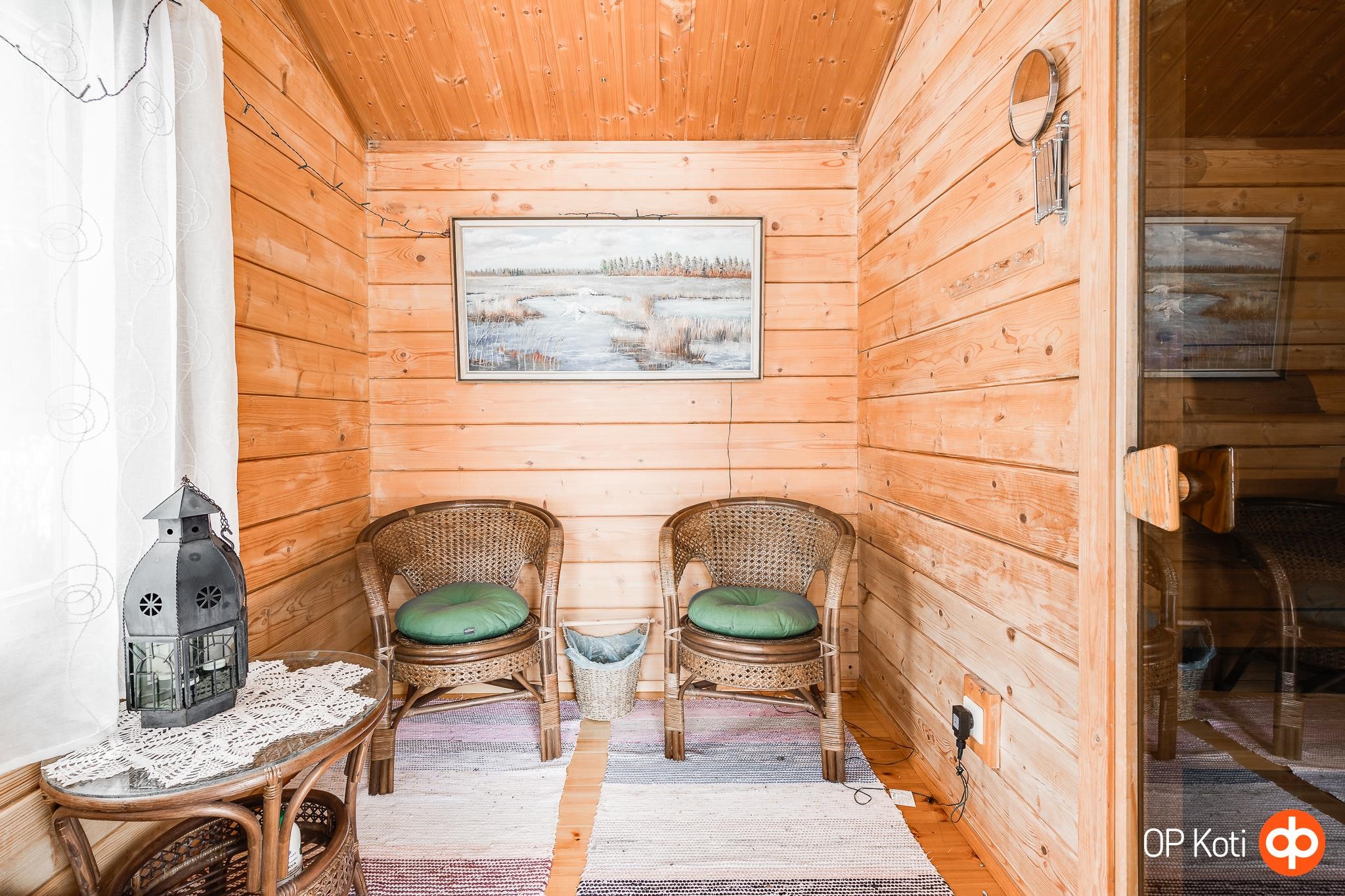 - Sauna, sähkökiuas (pilarikiuas), puukiuas, kylpyhuone, erillinen wc (2 kpl), suihku, peilikaappi (wc-tiloissa), kaapit, allaskaappi, pesukoneliitäntä, lattialämmitys, kiinteät valaisimet. Kylpyhuone ja sauna remontoitu 2021. Erillinen pihasauna, jossa puukiuas.
