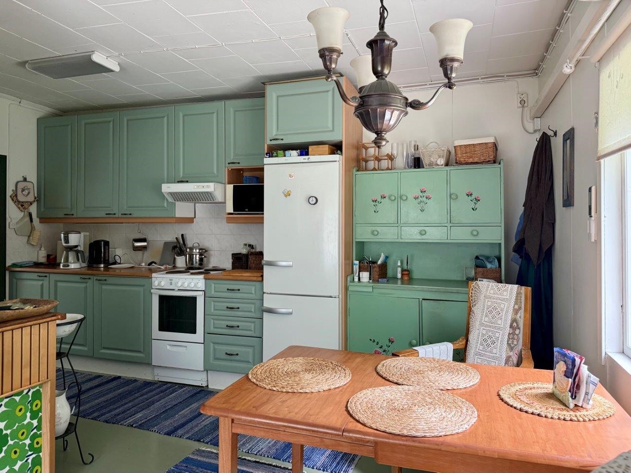 - Jääkaappipakastin, sähköliesi, liesituuletin, Puuhella.