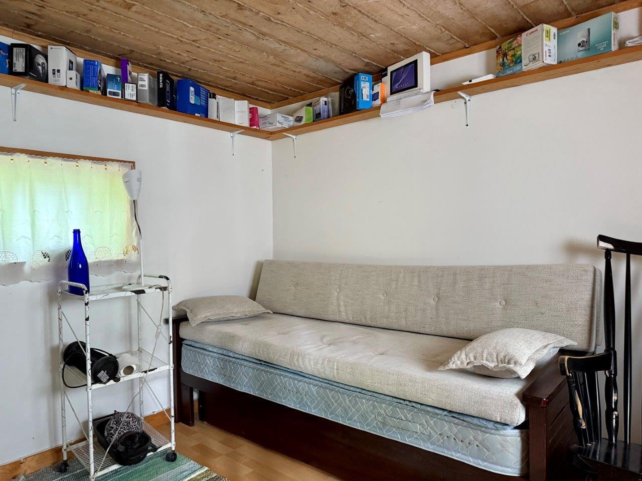 Keittiö: puulattia. Olohuone: puulattia. Makuuhuone 1: muovimatto. Makuuhuone 2: muovimatto. Kuisti: puulattia.