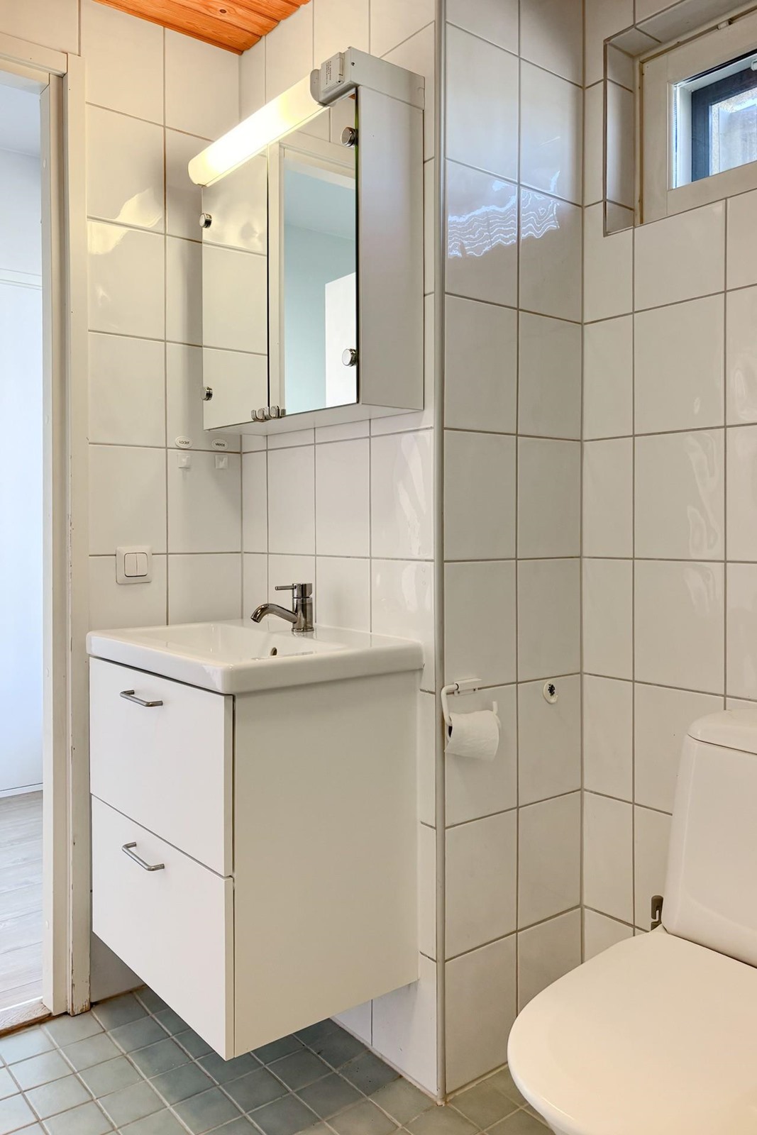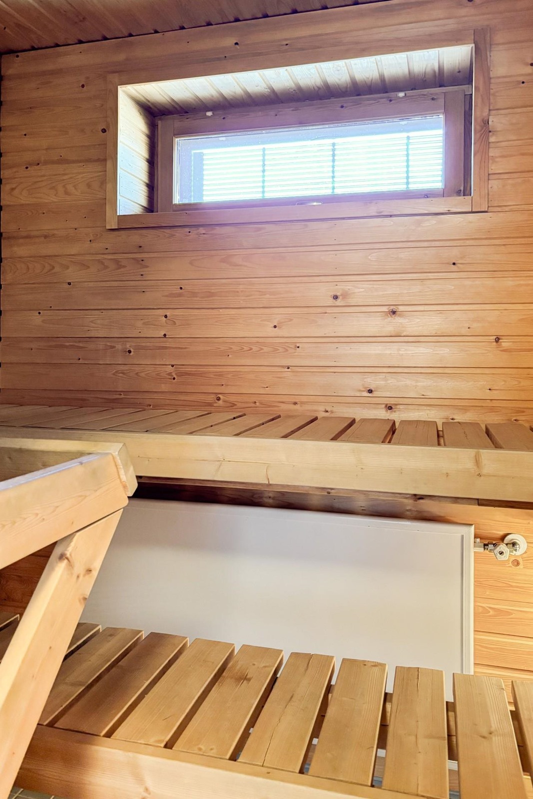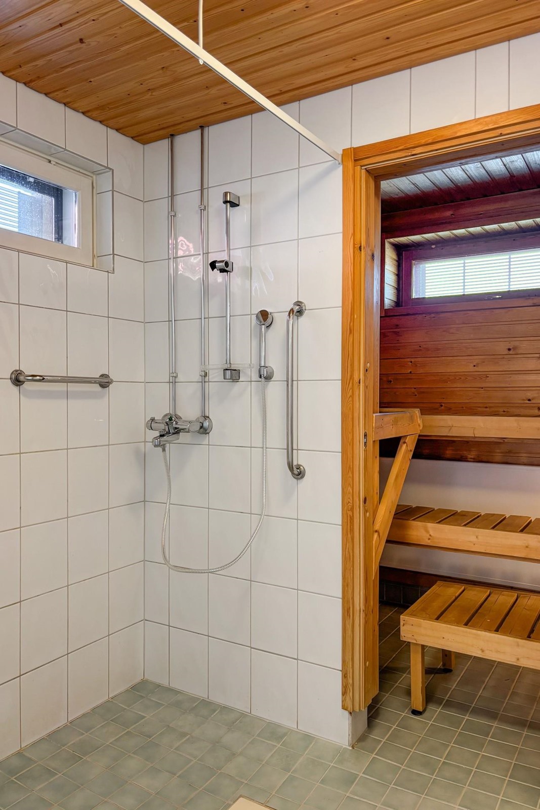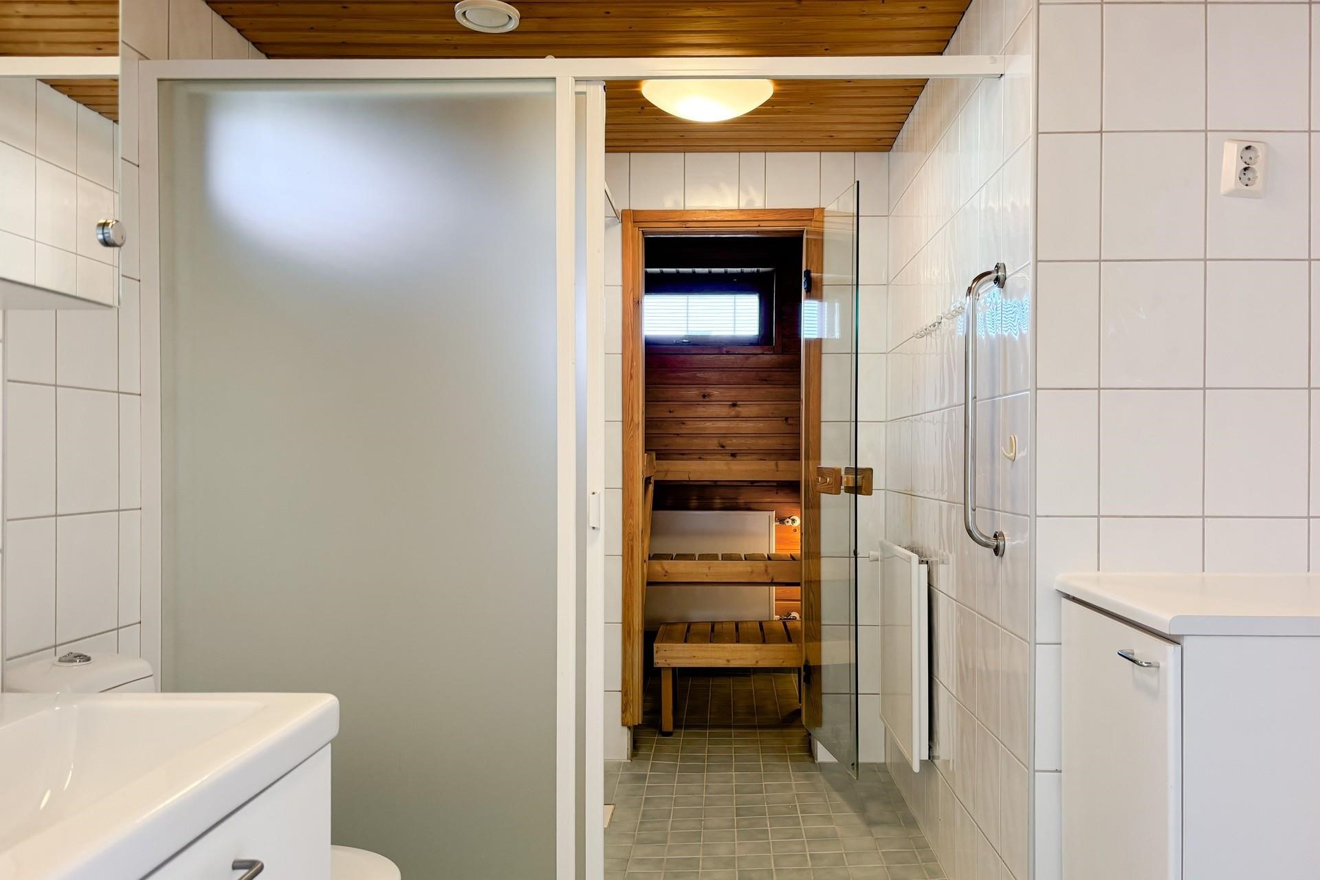- Sauna, sähkökiuas, kylpyhuone, suihku, suihkuseinä, peilikaappi, allaskaappi, pesukoneliitäntä, lattialämmitys, kiinteät valaisimet.