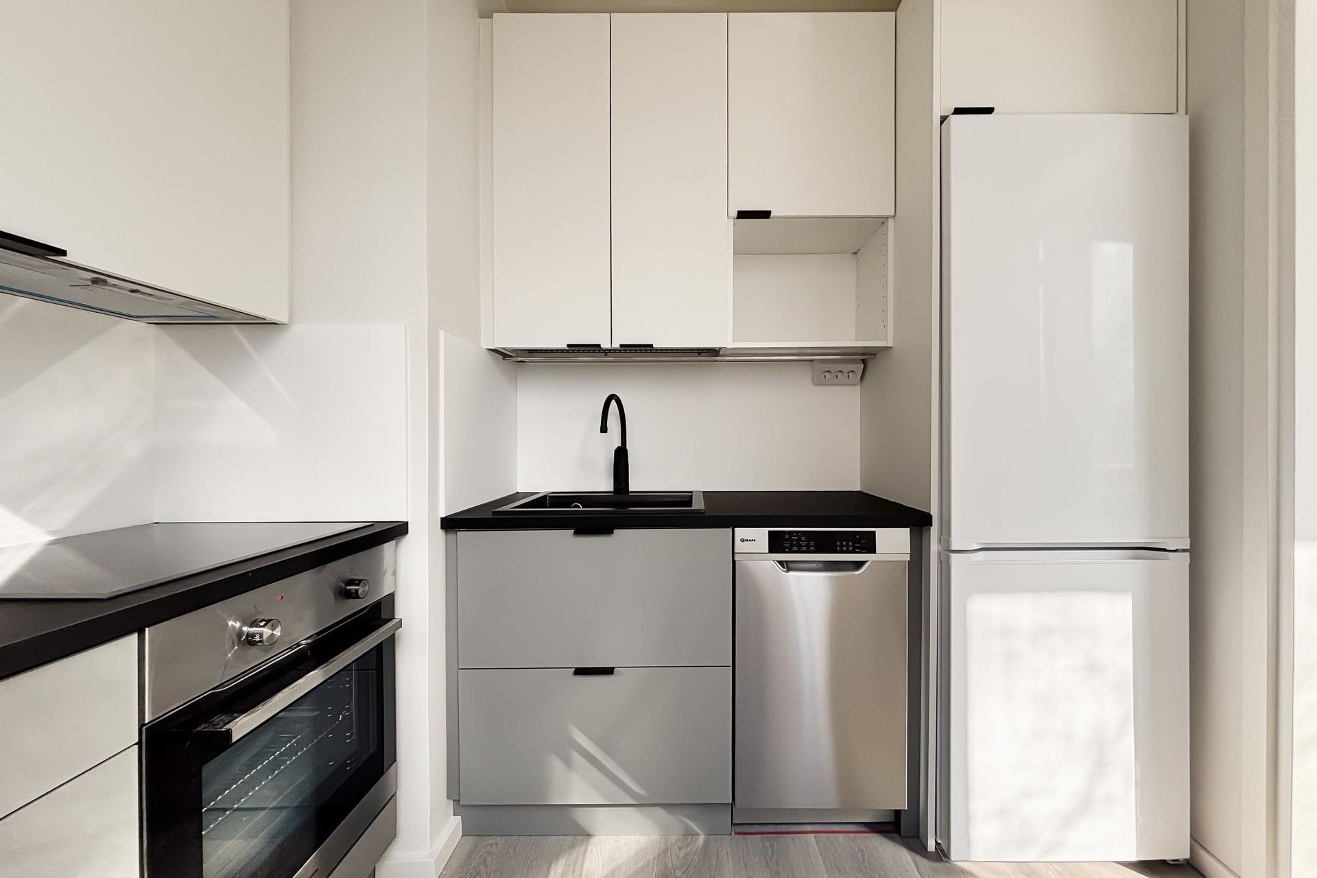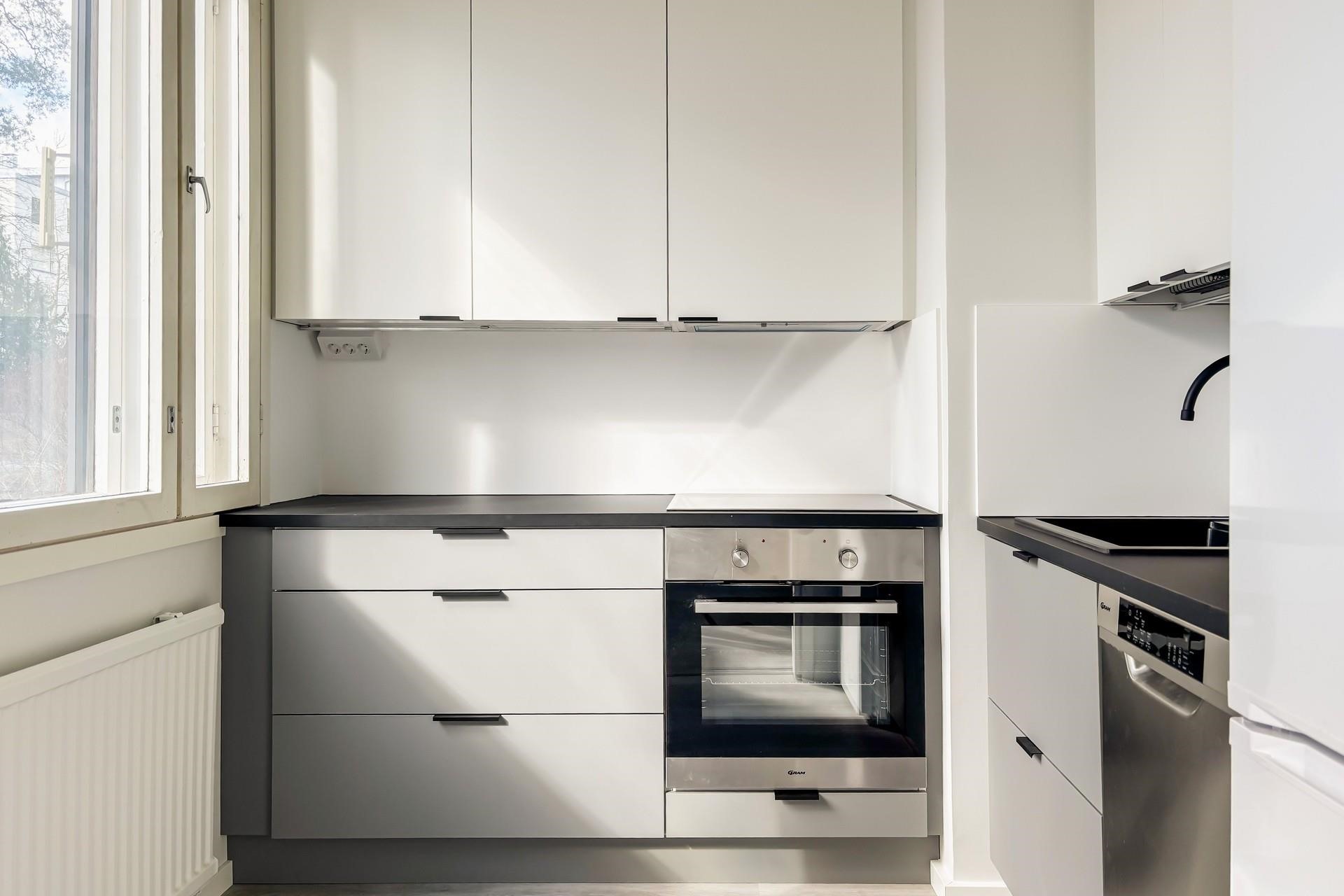 - Jääkaappipakastin, induktioliesi, liesituuletin, astianpesukone, kaapistot, kiinteät valaisimet.