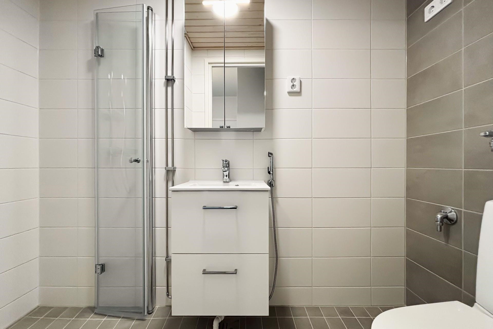 - Kylpyhuone, suihku, suihkuseinä, peilikaappi, allaskaappi, pesukoneliitäntä, kiinteät valaisimet.