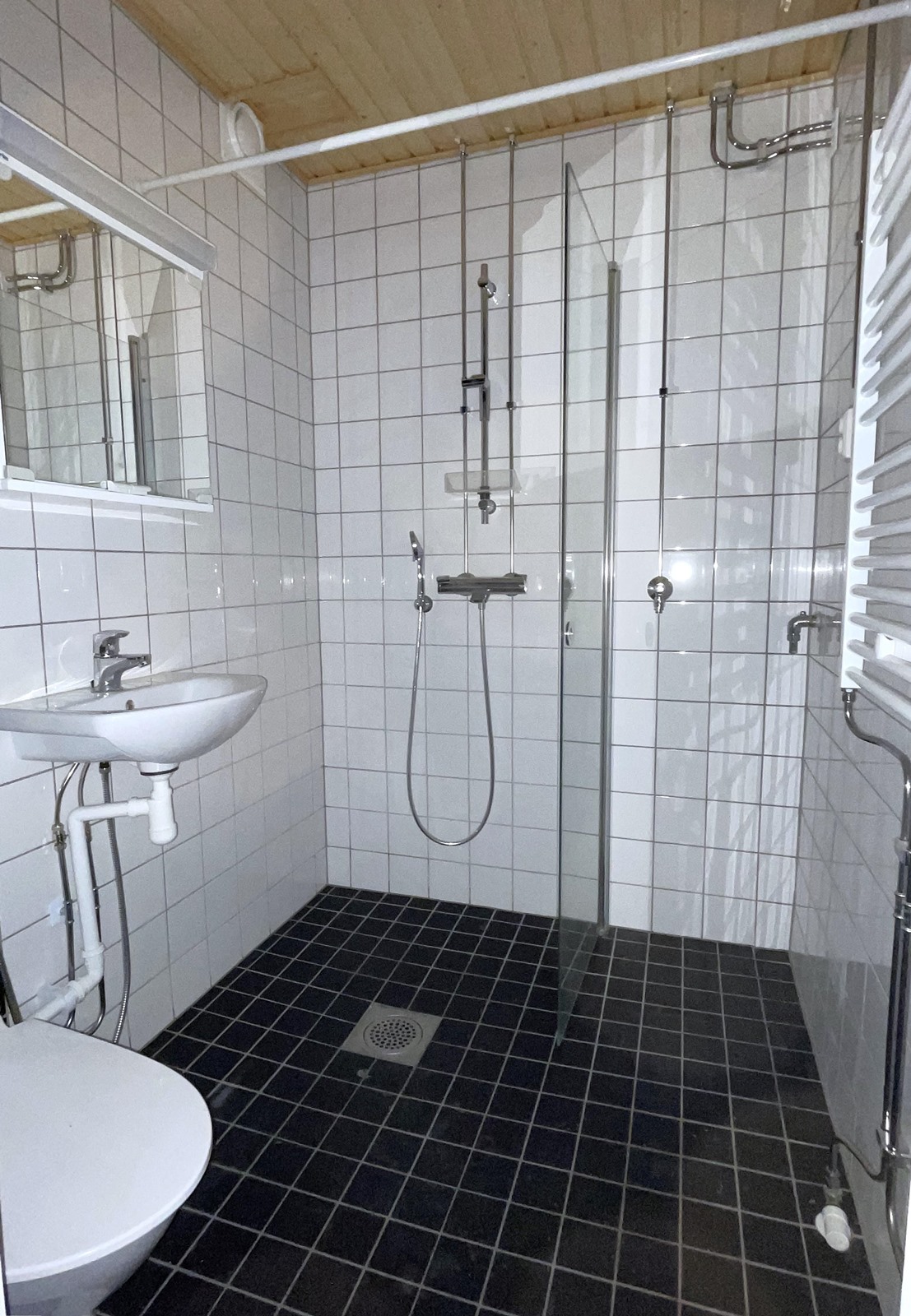 - Kylpyhuone, suihkuseinä, peilikaappi, pesukoneliitäntä, kiinteät valaisimet.
