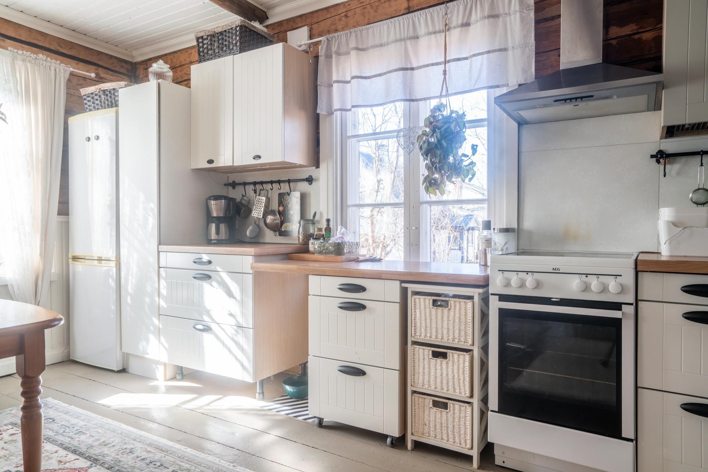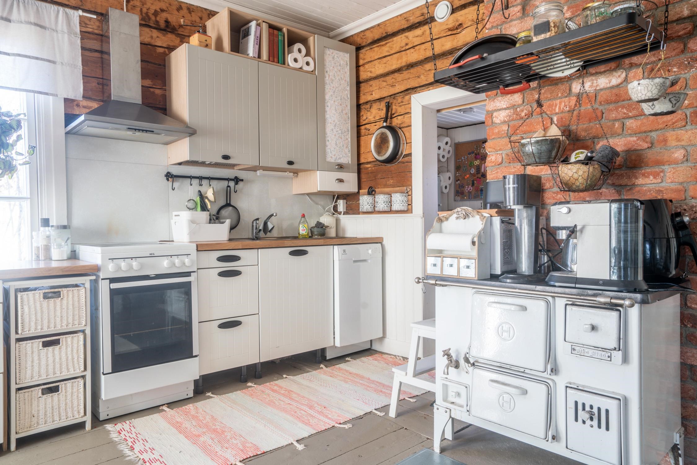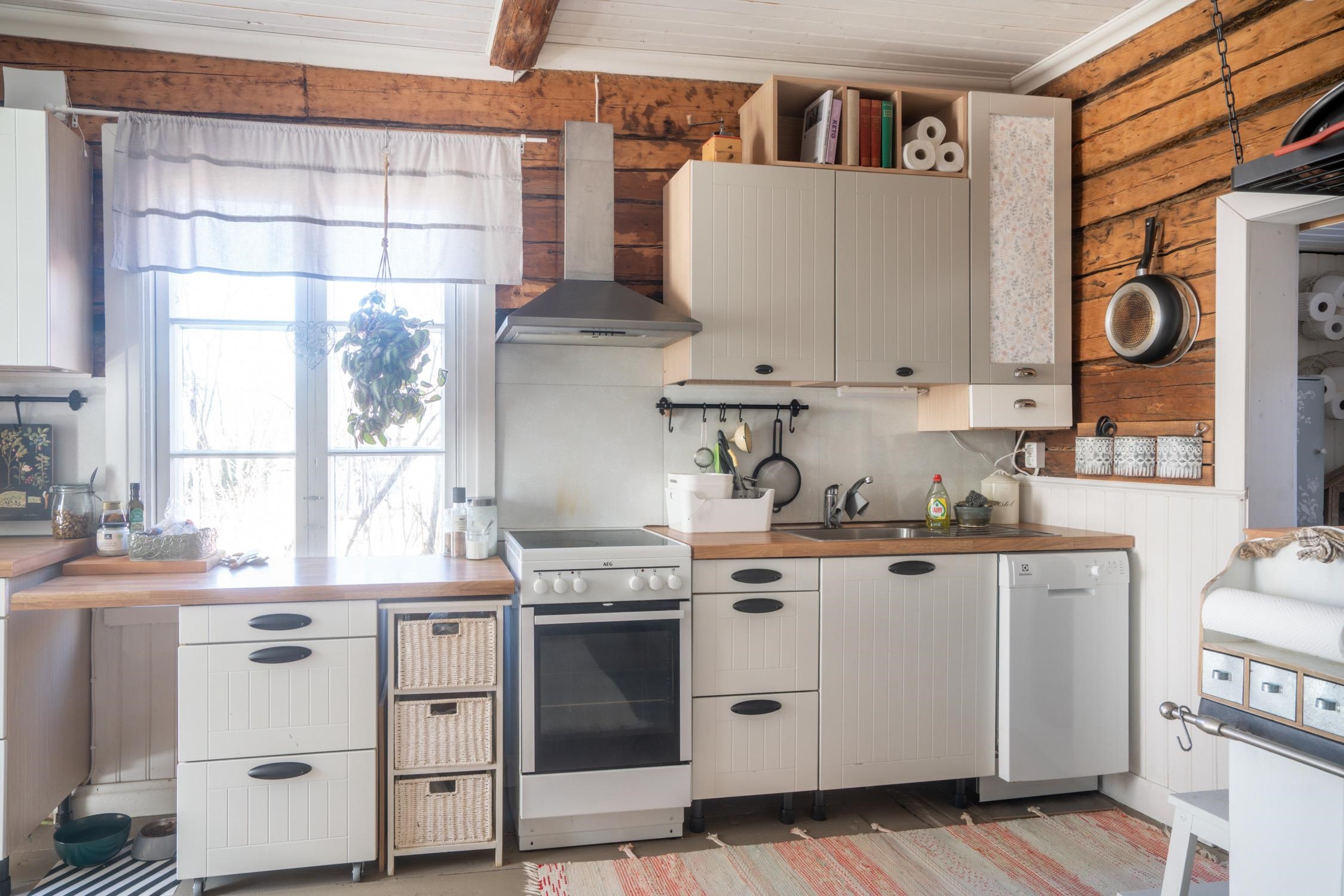 - Jääkaappipakastin, keraaminen liesi, liesituuletin, astianpesukone, kaapistot, . Puuhella