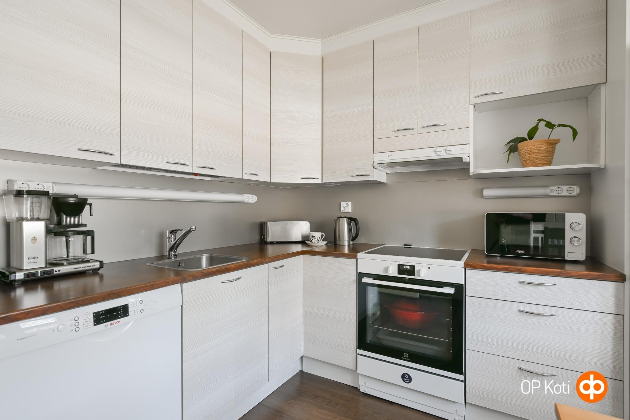 - Vuonna 2016 remontoidussa keittiössä on varusteina: jääkaappi, pakastekaappi, sähköliesi/ induktioliesi (2024), liesikupu, liesituuletin, astianpesukone ja kiinteät valaisimet.