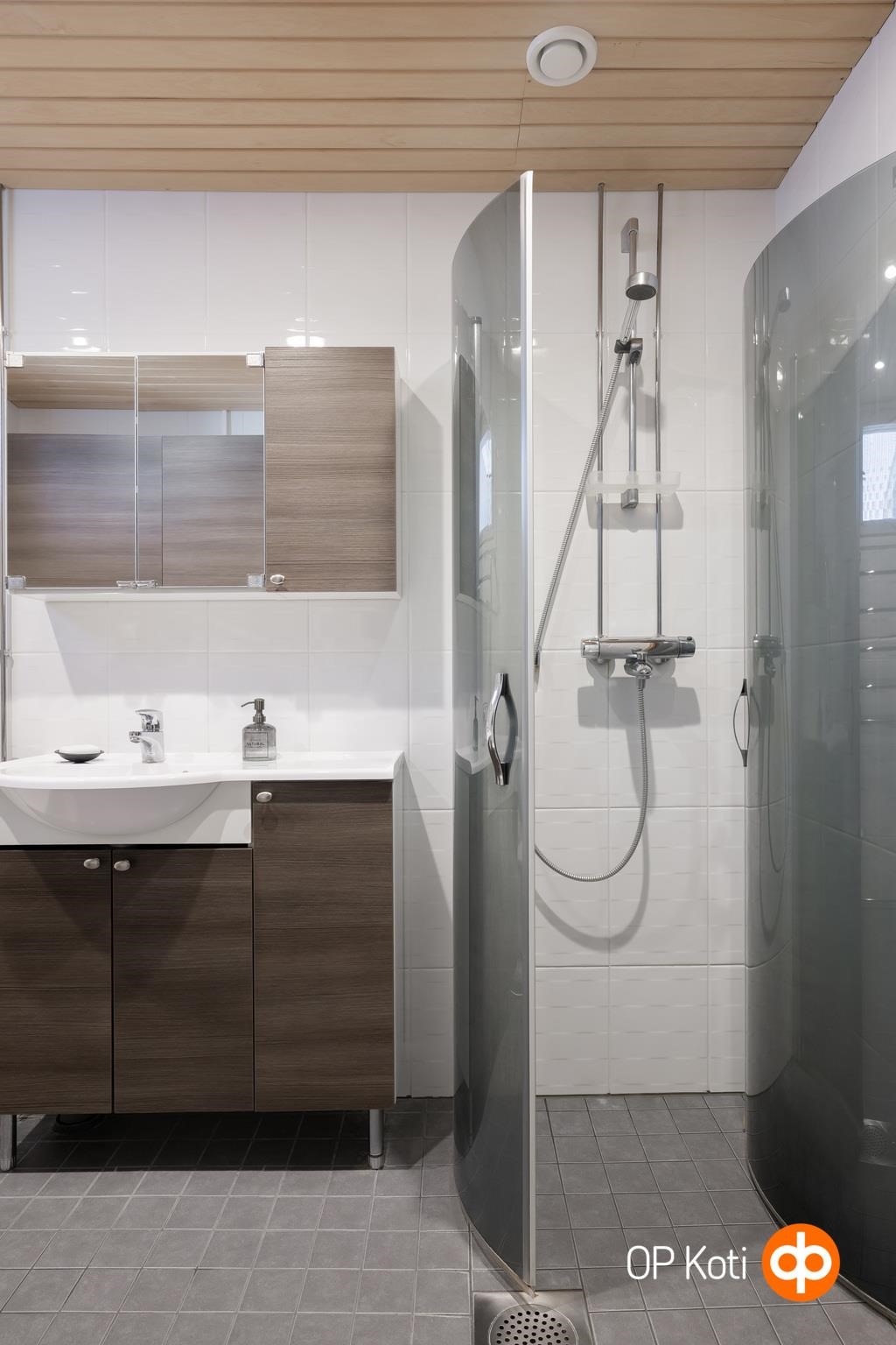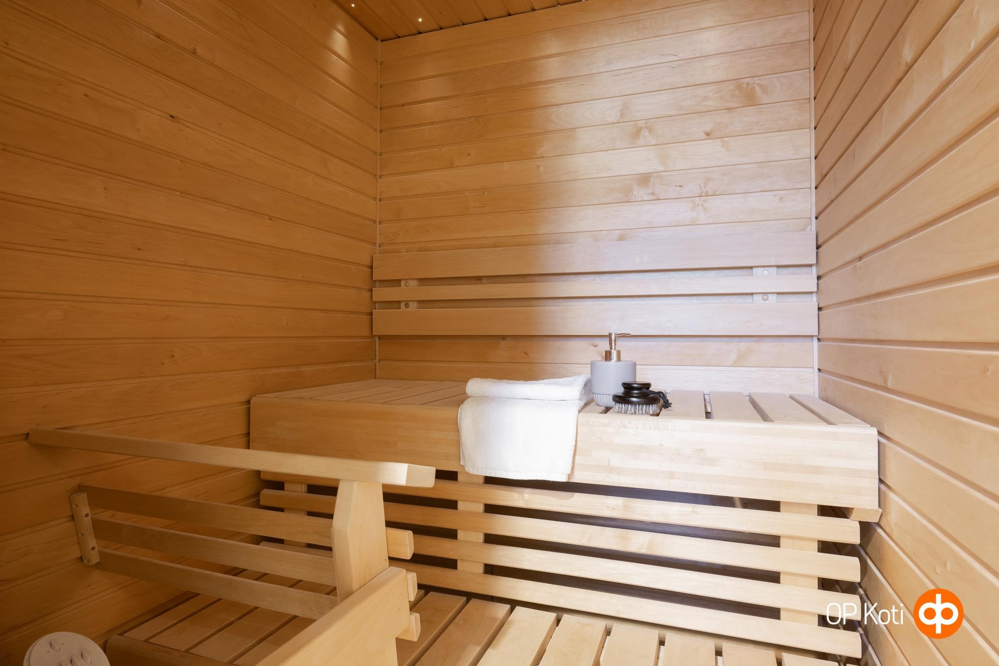 - Vuonna 2013 remontoidussa kylpyhuoneessa ja saunassa on varusteina: wc-istuin, bideesuihku, pesuallas, allaskaappi, peilikaappi, suihku, suihkuseinä x2, sauna, sähkökiuas, pesukoneliitäntä, lattialämmitys ja kiinteät valaisimet