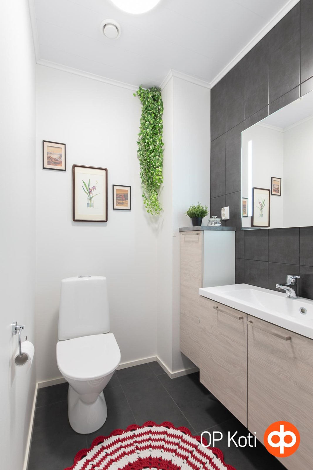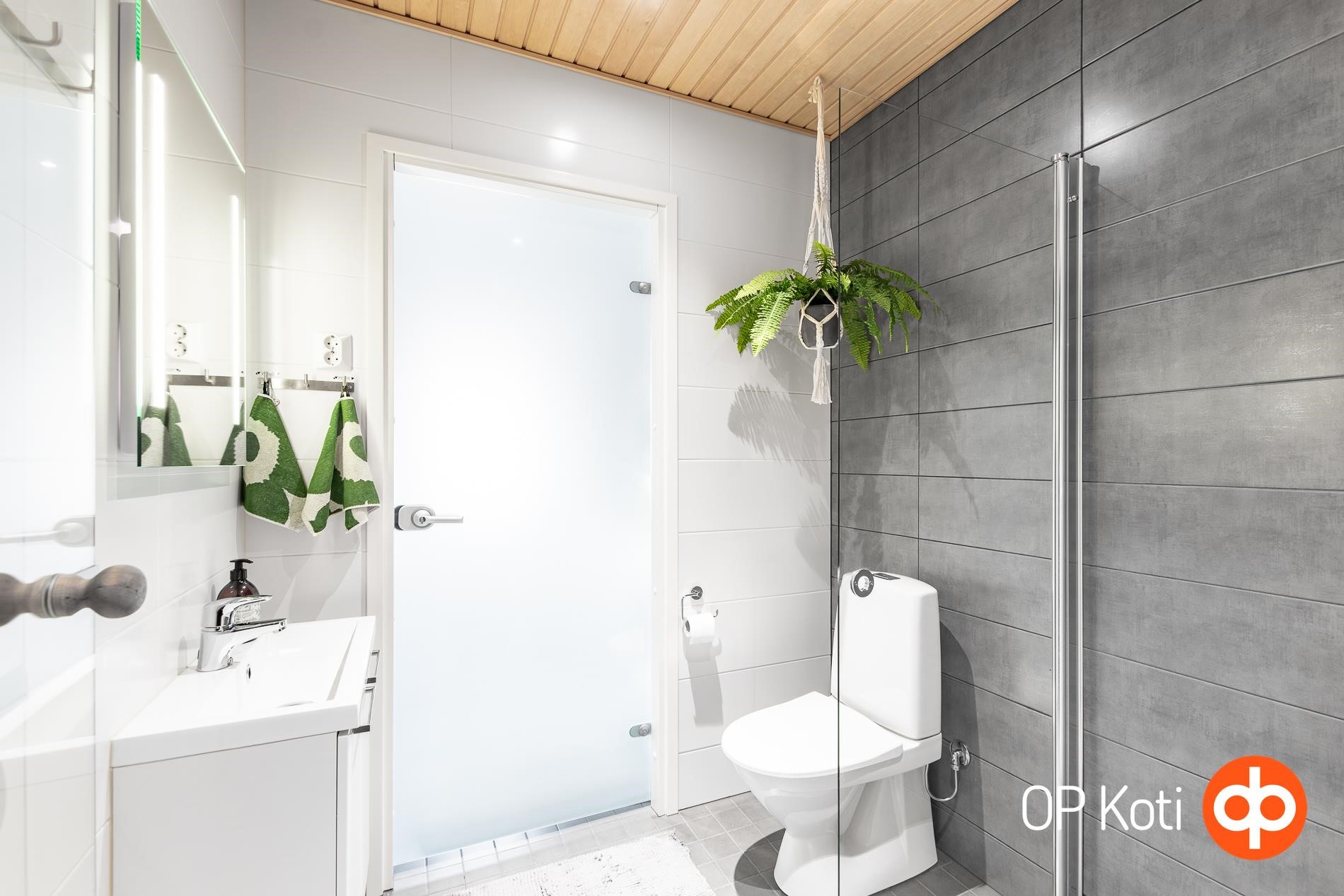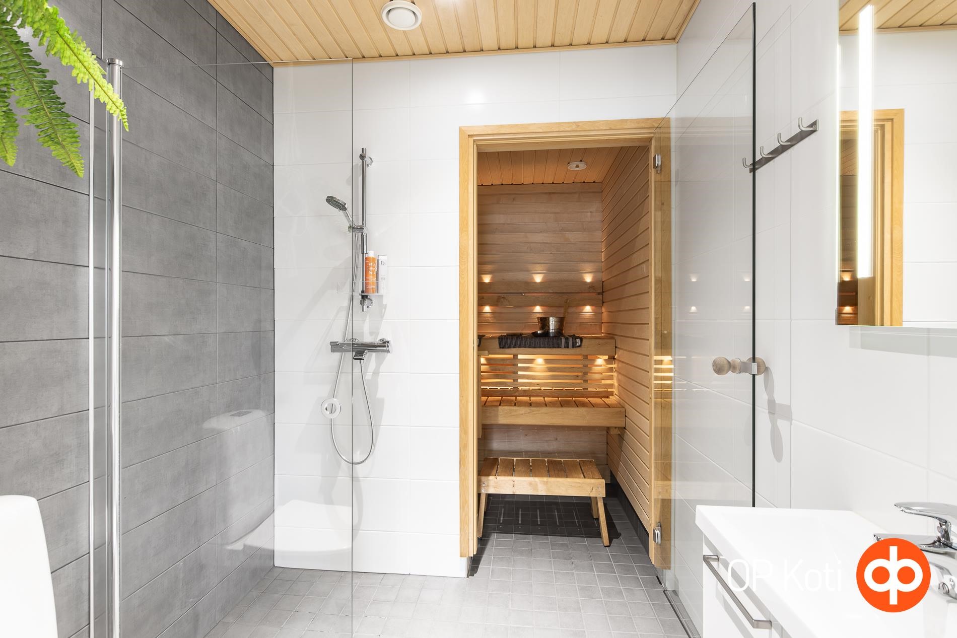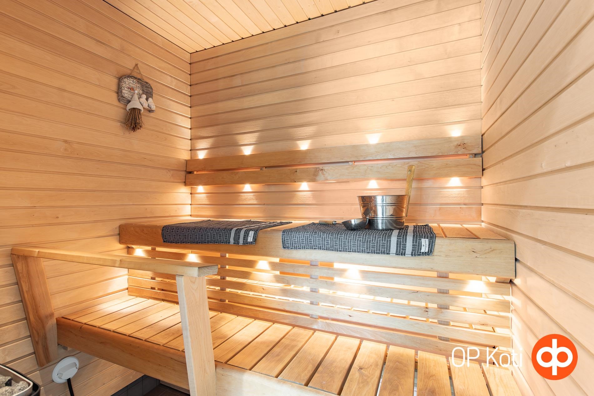 - Sauna, sähkökiuas, kylpyhuone, erillinen wc, suihku, suihkuseinä, peilit, kaapit, allaskaappi, pesukoneliitäntä, lattialämmitys, kiinteät valaisimet.