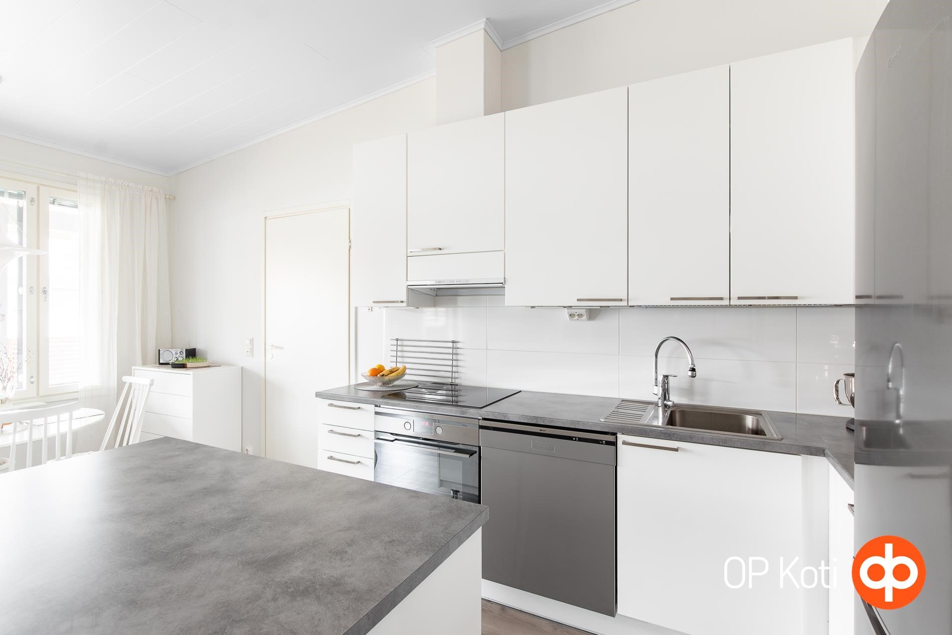 - Jääkaappipakastin, erillisuuni, induktioliesi, liesituuletin, astianpesukone, kaapistot, irralliset saarekkeet, kiinteät valaisimet.