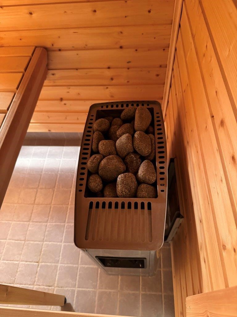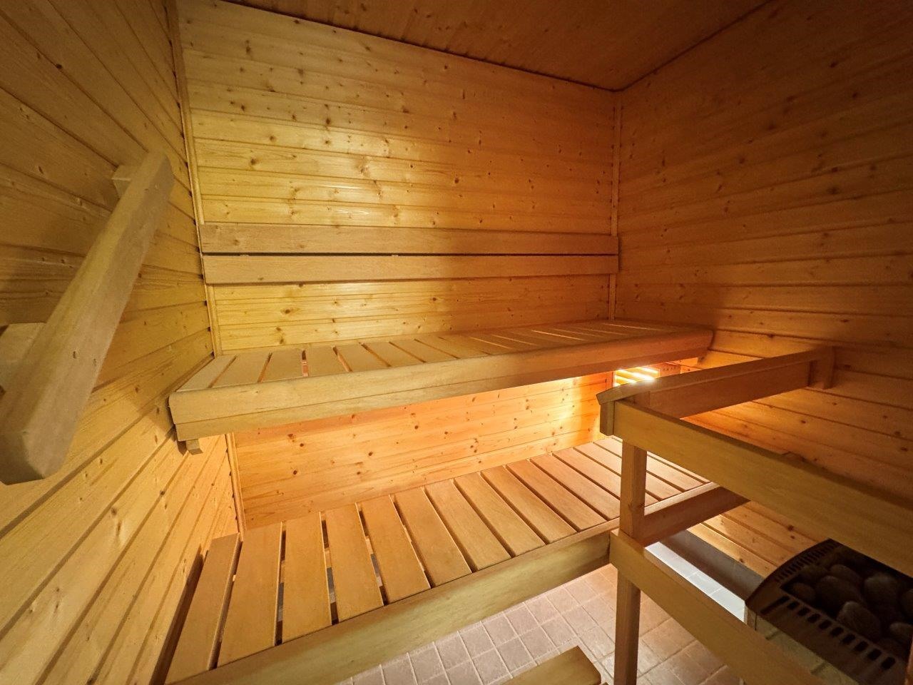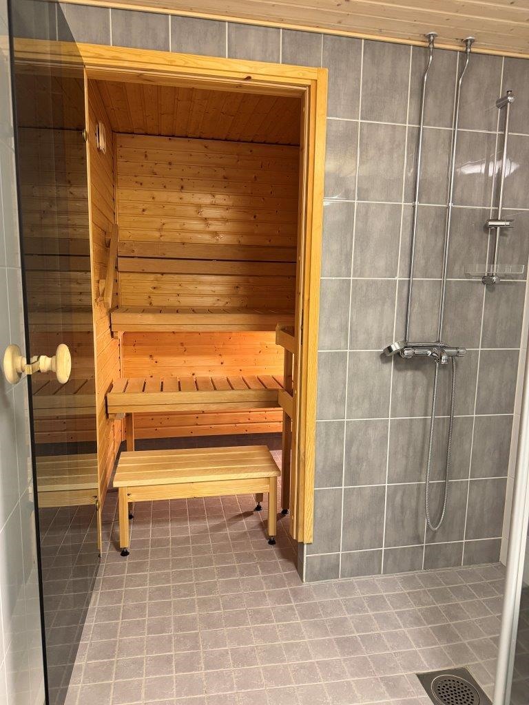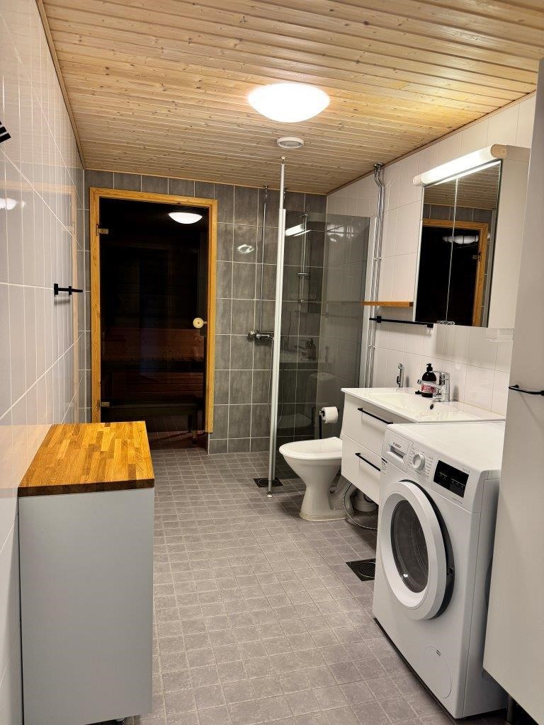 - Sauna, sähkökiuas, kylpyhuone, suihku, suihkuseinä, peilikaappi, kaapit kylpyhuonekaapisto, allaskaappi, pesukoneliitäntä, kiinteät valaisimet.