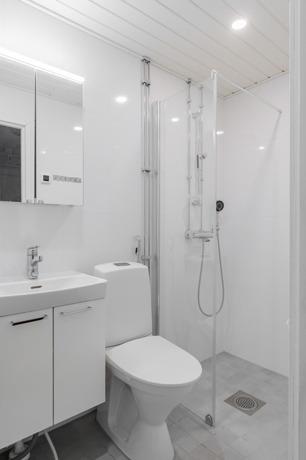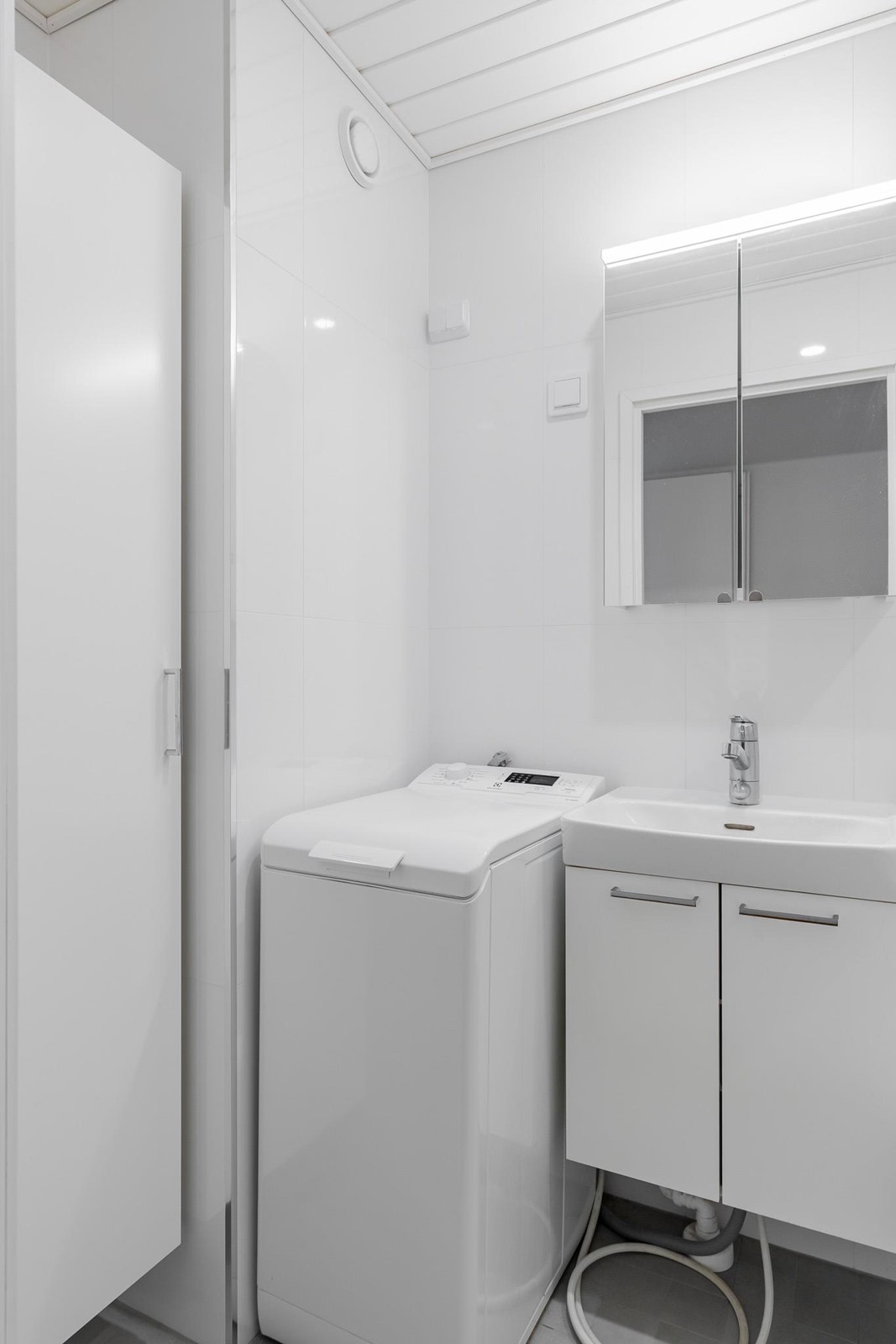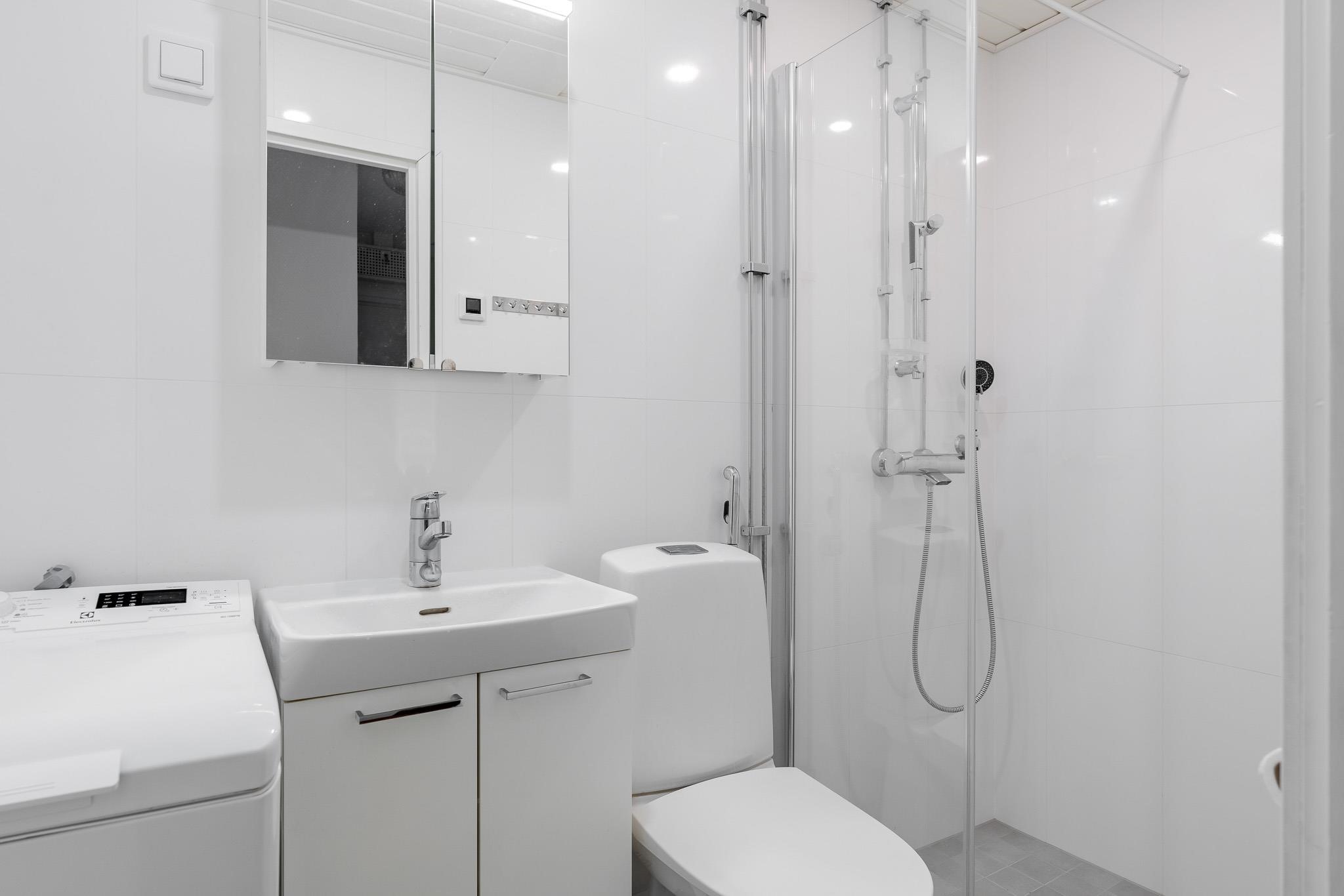 - Kylpyhuone, suihku, suihkuseinä, peilikaappi, kaapit, allaskaappi, pesukoneliitäntä, kiinteät valaisimet.