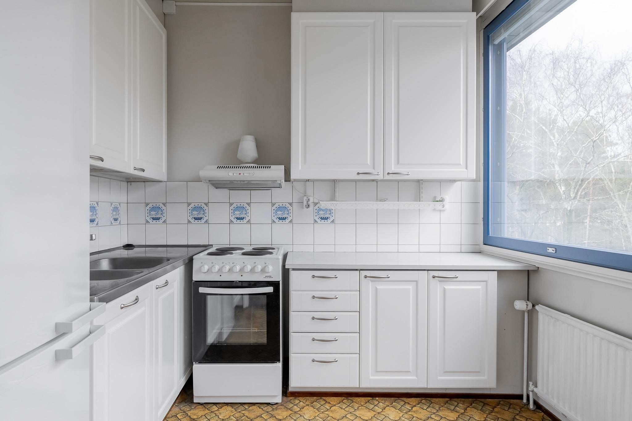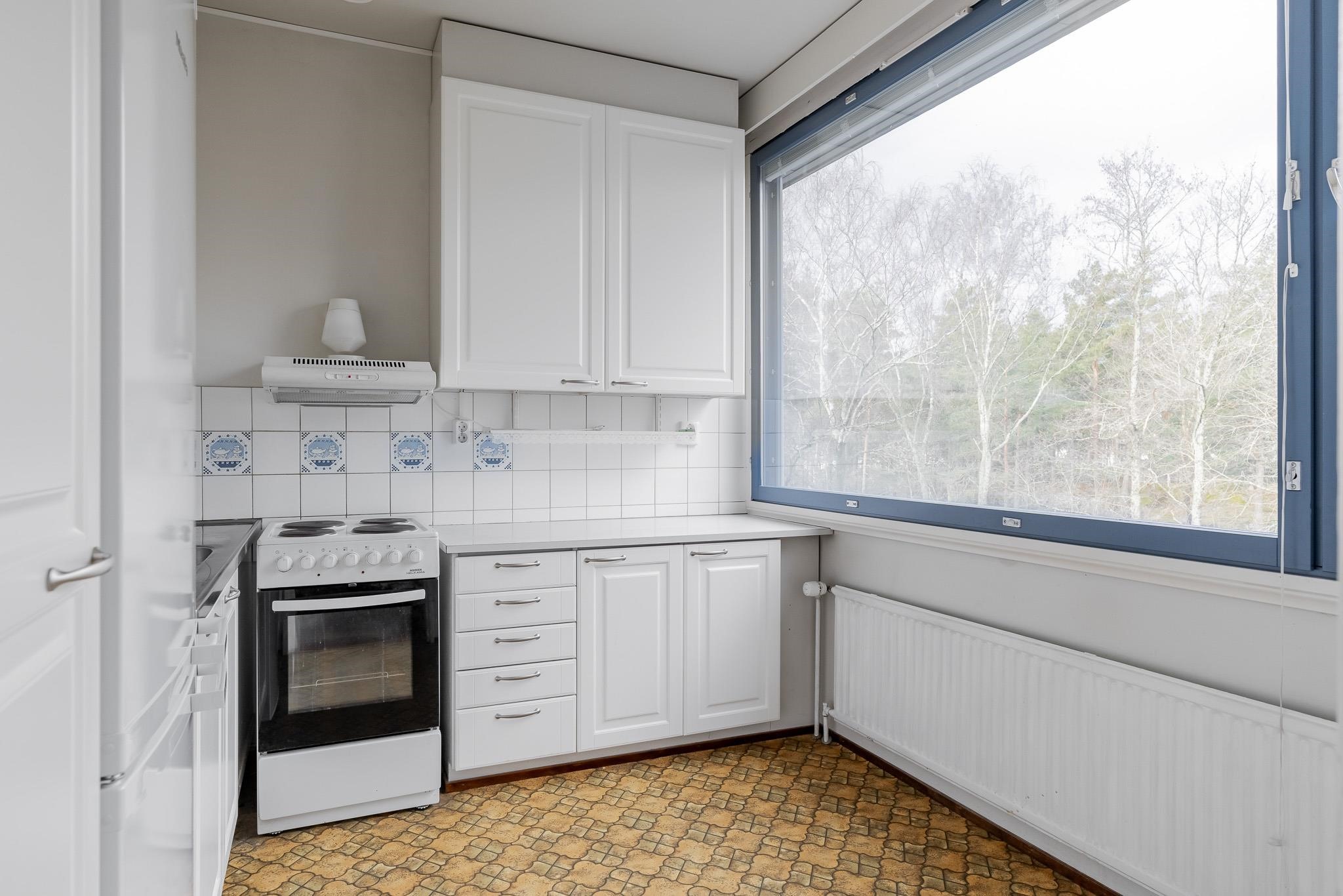 Säilytystilaa on runsaasti: vaatehuone sekä erillinen kellarikomero helpottavat tavaroiden järjestystä. Kylpyhuone on uusittu linjasaneerauksen yhteydessä ja siellä on tilaa myös pyykinpesukoneelle. Muutoin koti on peruskuntoinen ja tarjoaakin erinomaisen aihion remonttiunelmien toteuttamiselle. Ikkunoista aukeaa vehreät neljännen kerroksen näkymät.