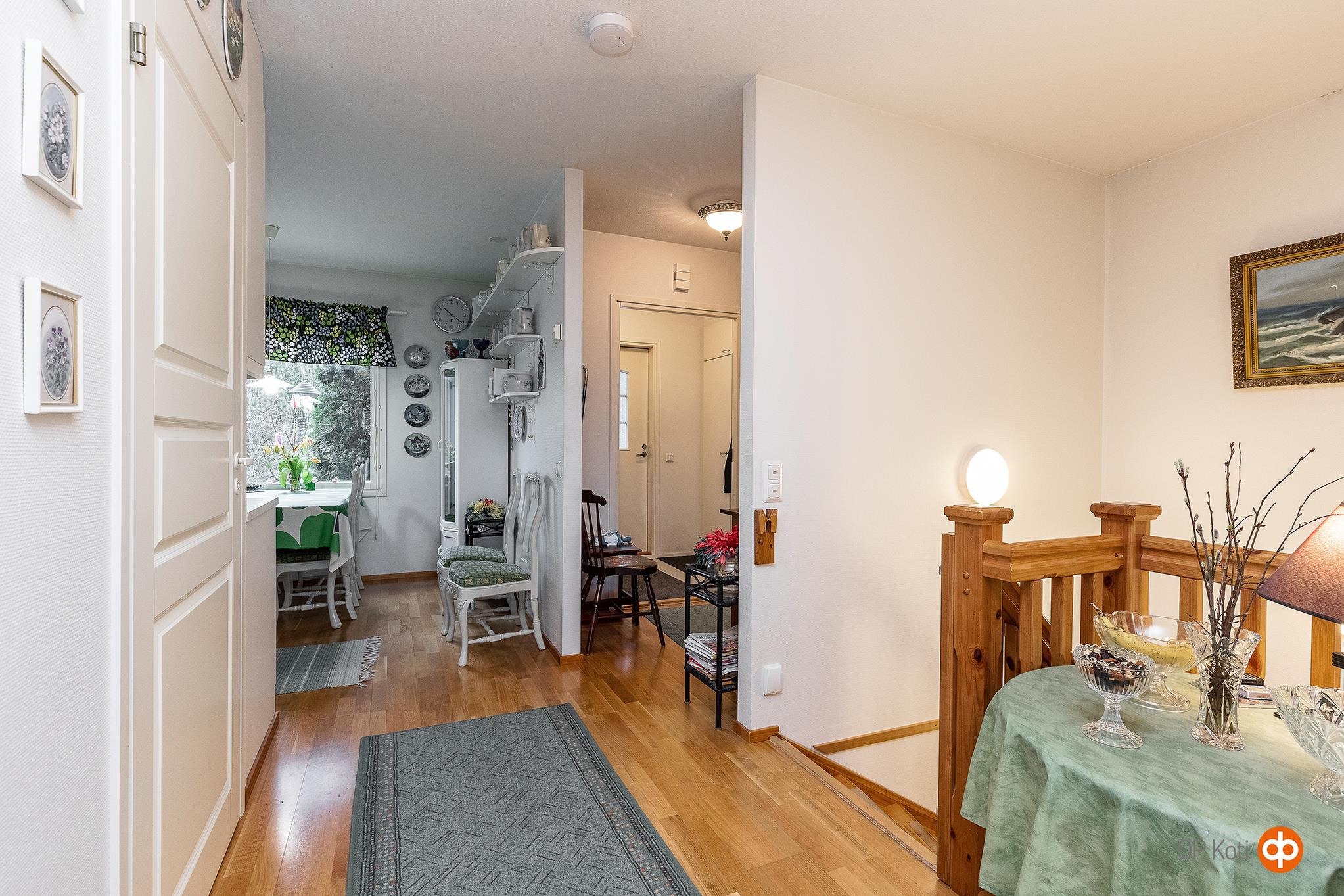 Keittiö: Parkettilattia ja lasikuitutapetti. Olohuone: Parkettilattia ja lasikuitutapetti. Makuuhuone 1: Parkettilattia ja lasikuitutapetti. Makuuhuone 2: Parkettilattia ja lasikuitutapetti. Kodinhoitohuone: Kaakeloidut seinät puoleenväliin, lasikuitutapetti ylhäällä, laattalattia. Sauna: Paneloidut seinät, laattalattia. Kylpyhuone: Kaakeloidut seinät, laattalattia. Eteinen: Parkettilattia ja lasikuitutapetti. Wc: Kaakeloidut seinät puoleenväliin, lasikuitutapetti ylhäällä, laattalattia. Tuulikaappi: Laattalattia, maalatut seinät.