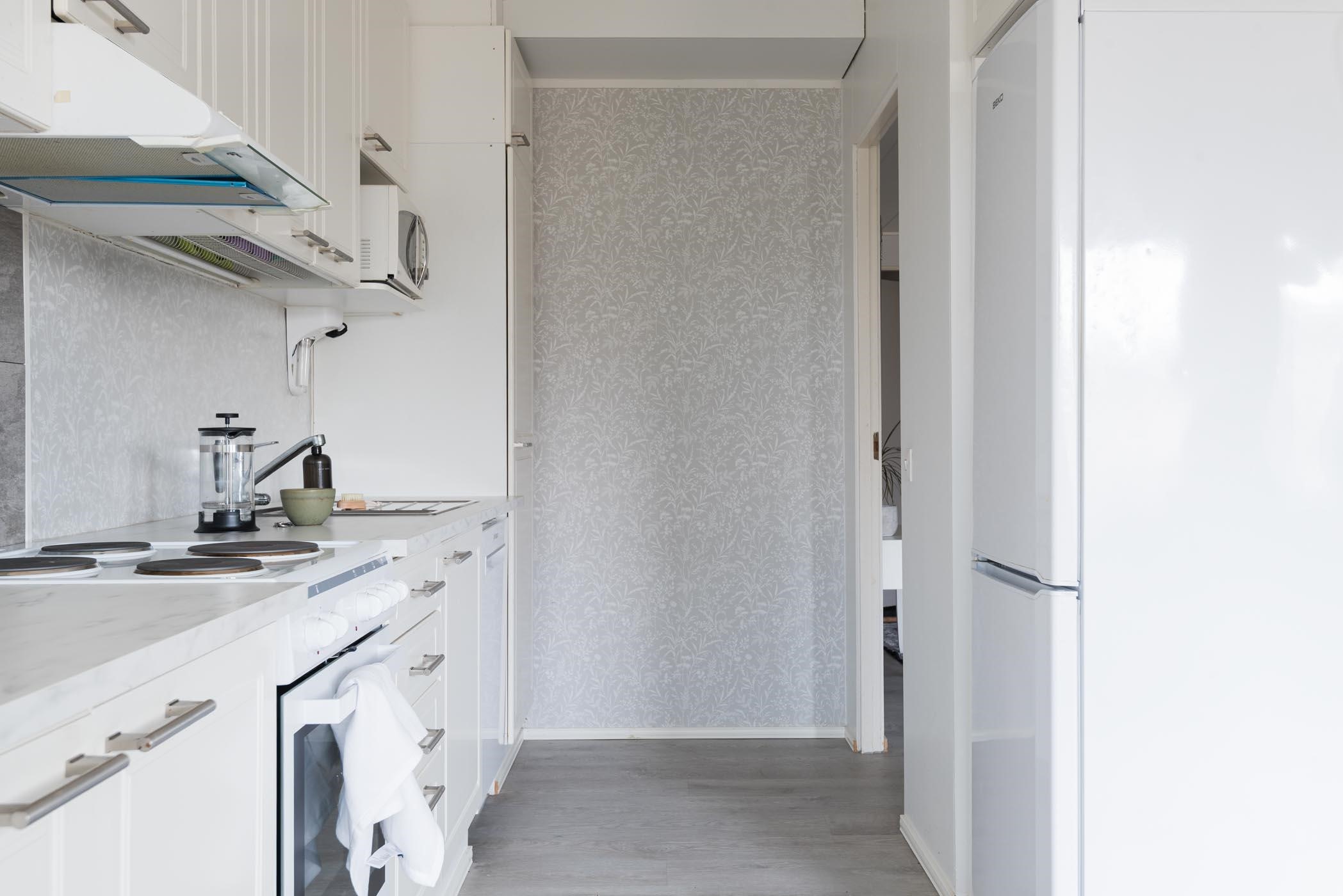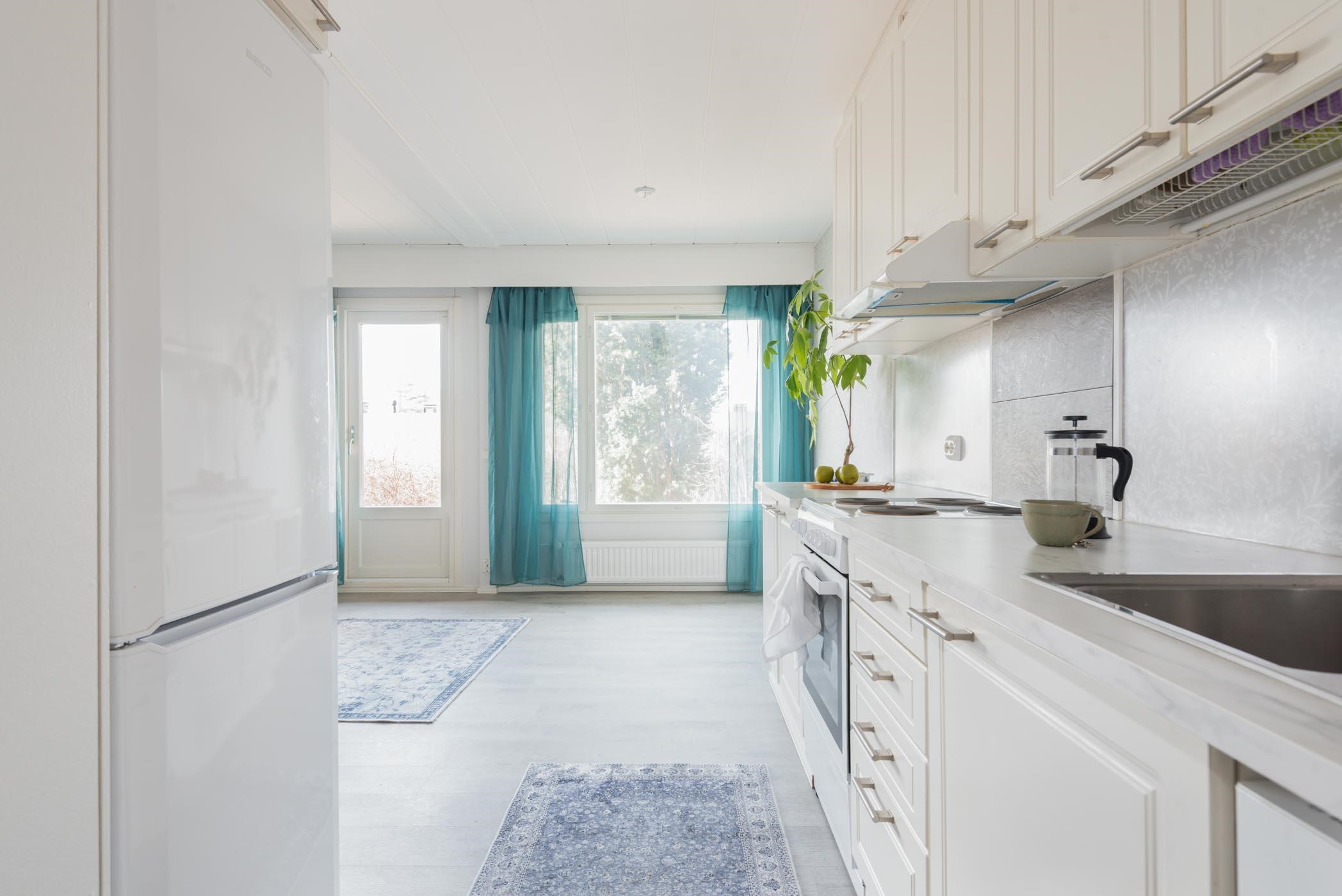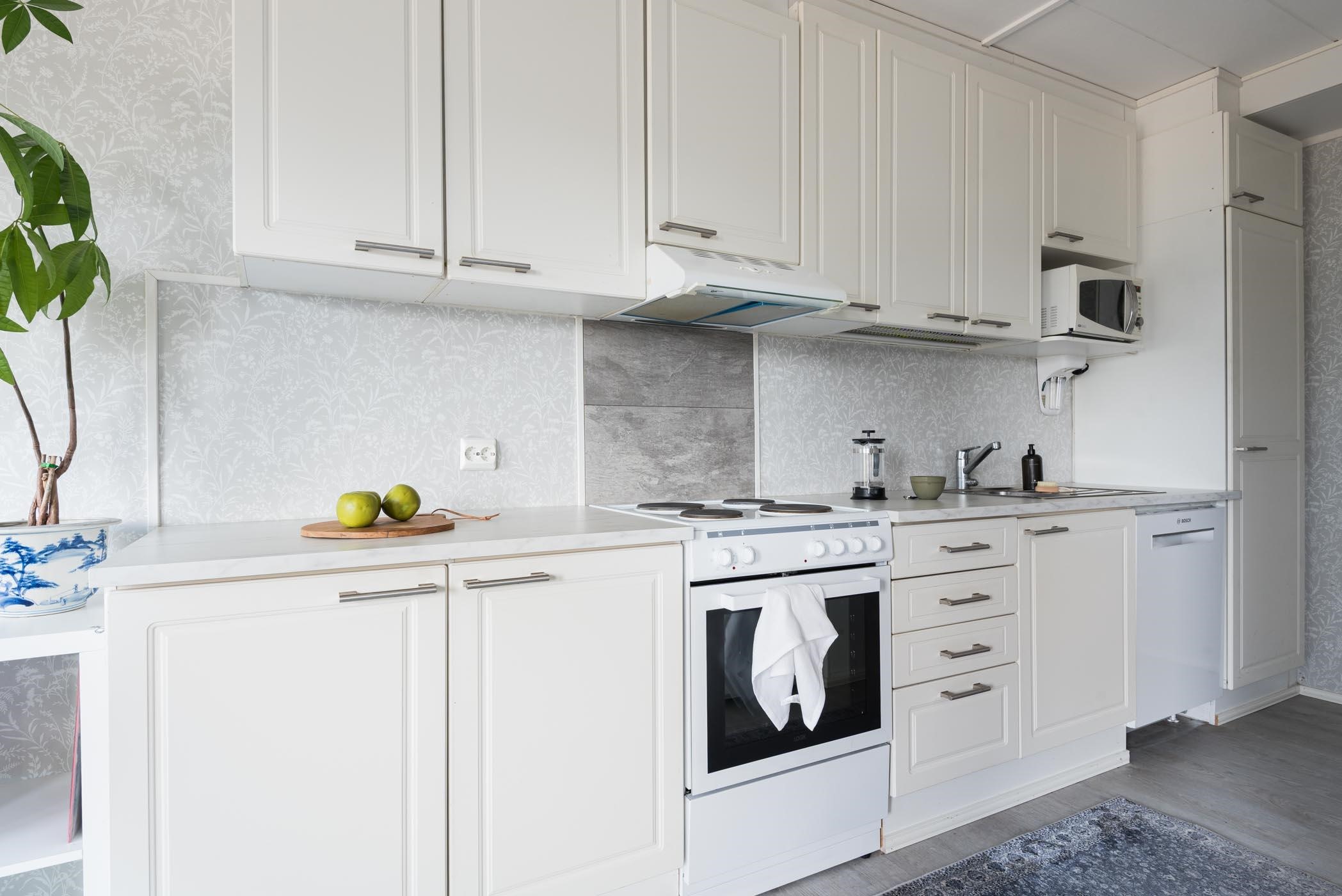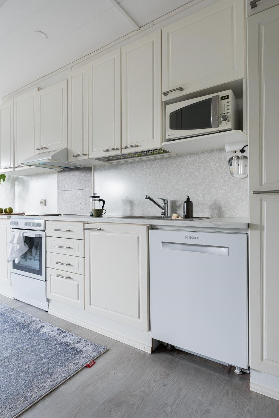 - Jääkaappipakastin, keraaminen liesi 2026, liesituuletin, astianpesukone, kiinteät valaisimet.