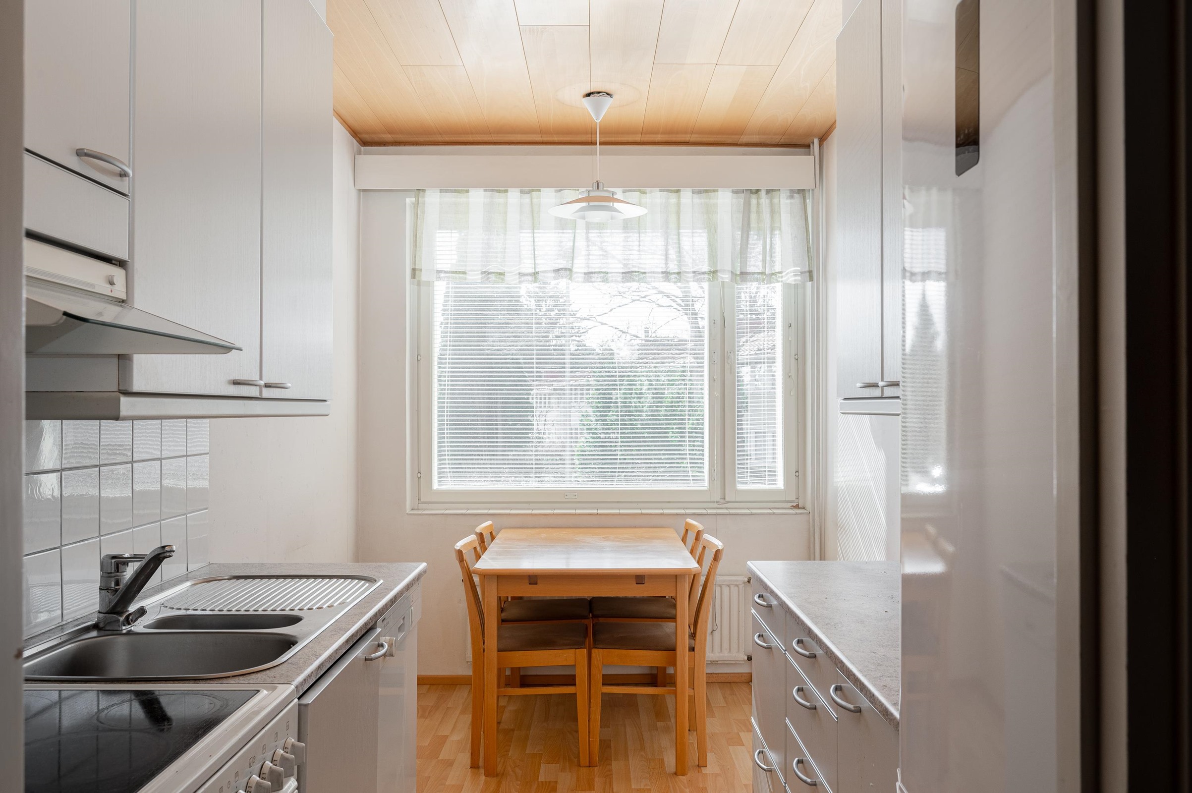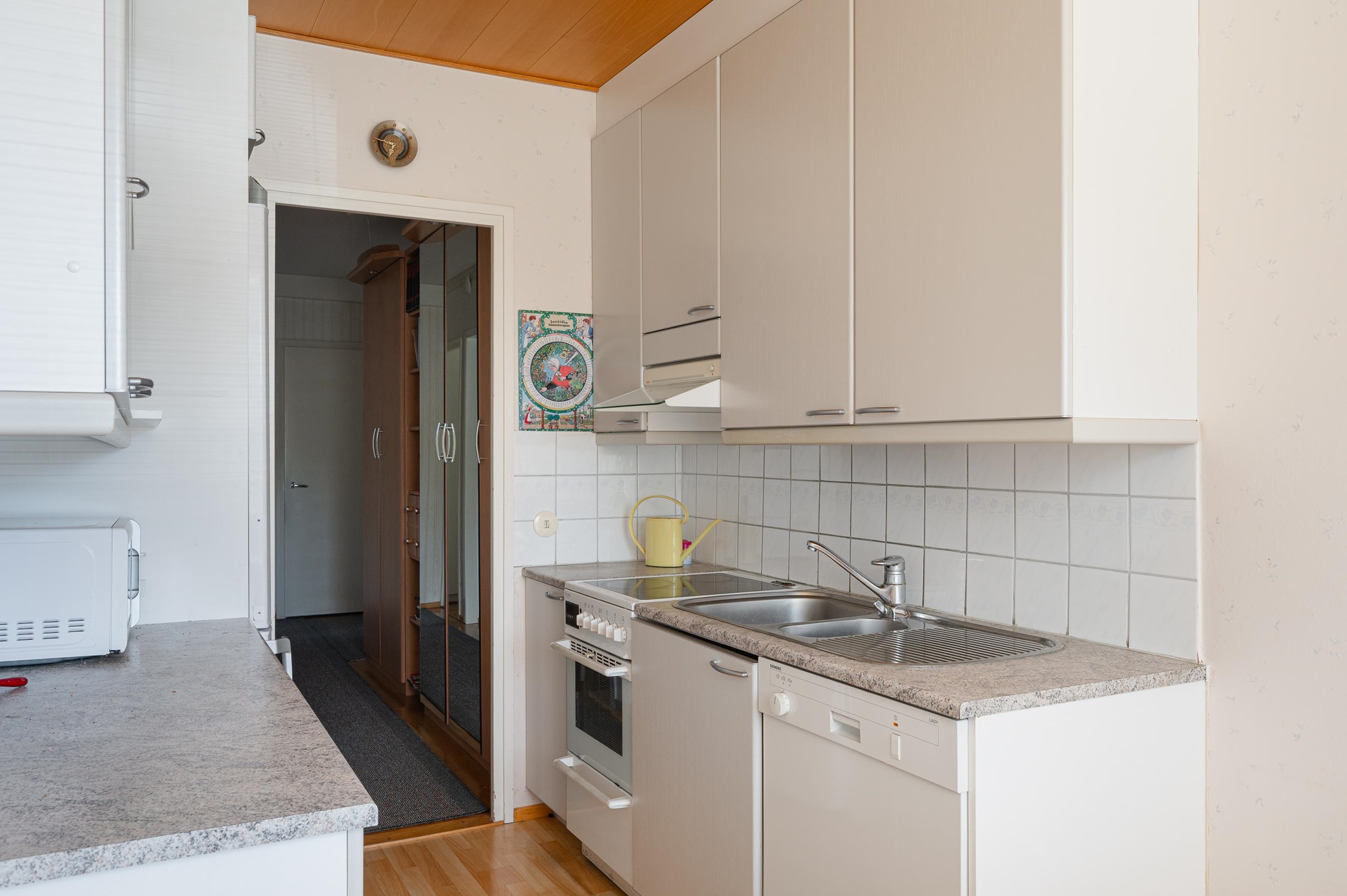 - Jääkaappipakastin, sähköliesi, liesikupu, astianpesukone, kaapistot, kiinteät valaisimet.