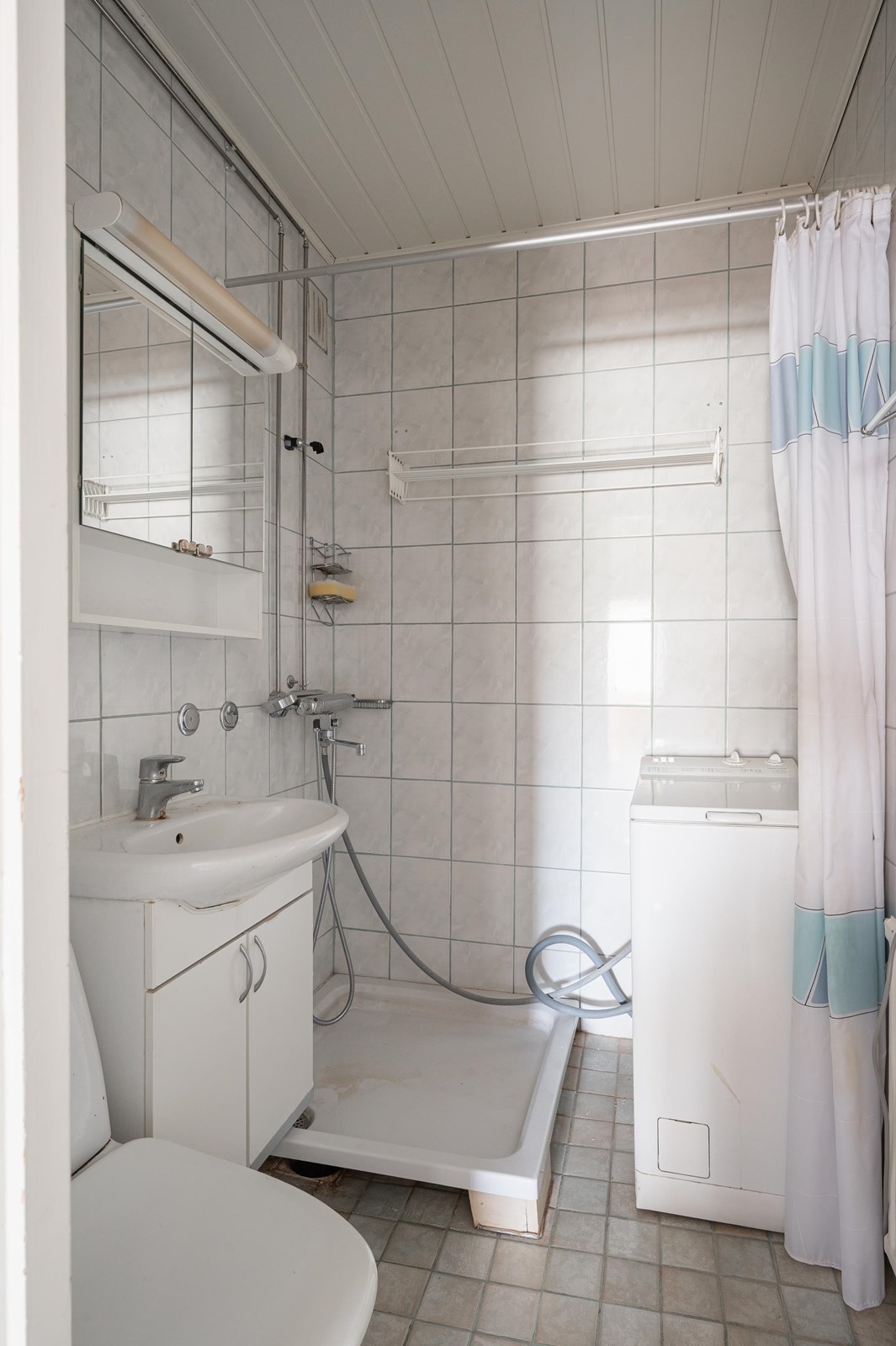 - Kylpyhuone wc, suihku, peilikaappi, allaskaappi, pesukoneliitäntä, kiinteät valaisimet.