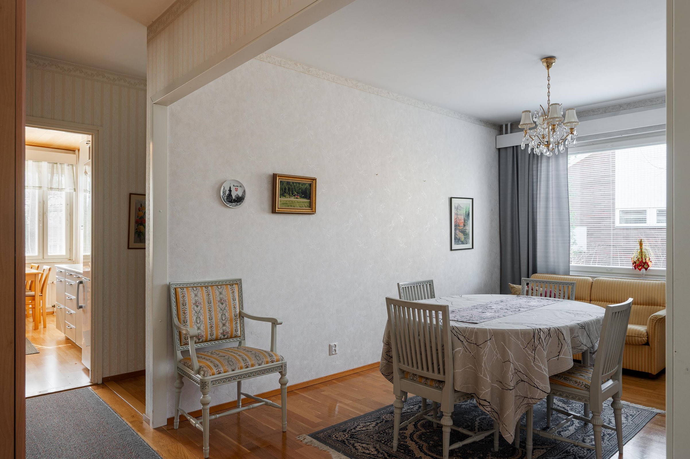 Keittiössä laminaattilattia, seinissä maali. Kaapistojen välitilassa laatta. Olohuoneessa ja makuuhuoneissa laminaattilattia, seinissä tapetti/maali. Kylpyhuoneessa seinä- ja lattialaatoitus.