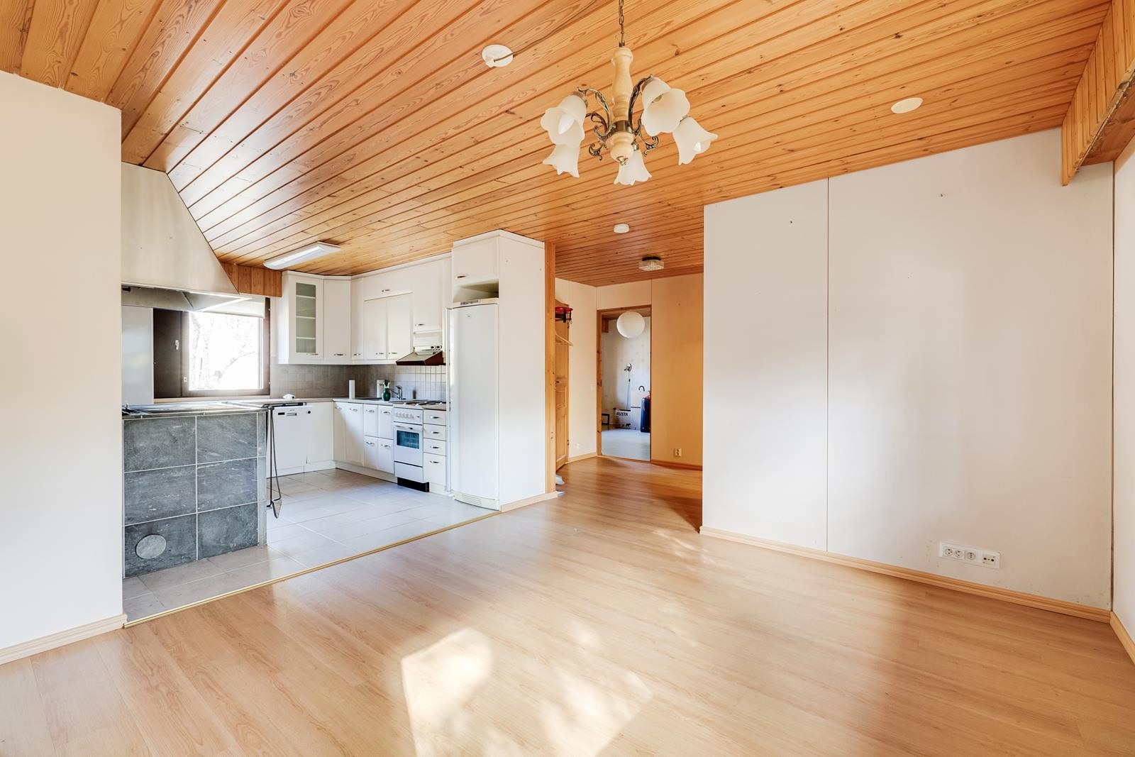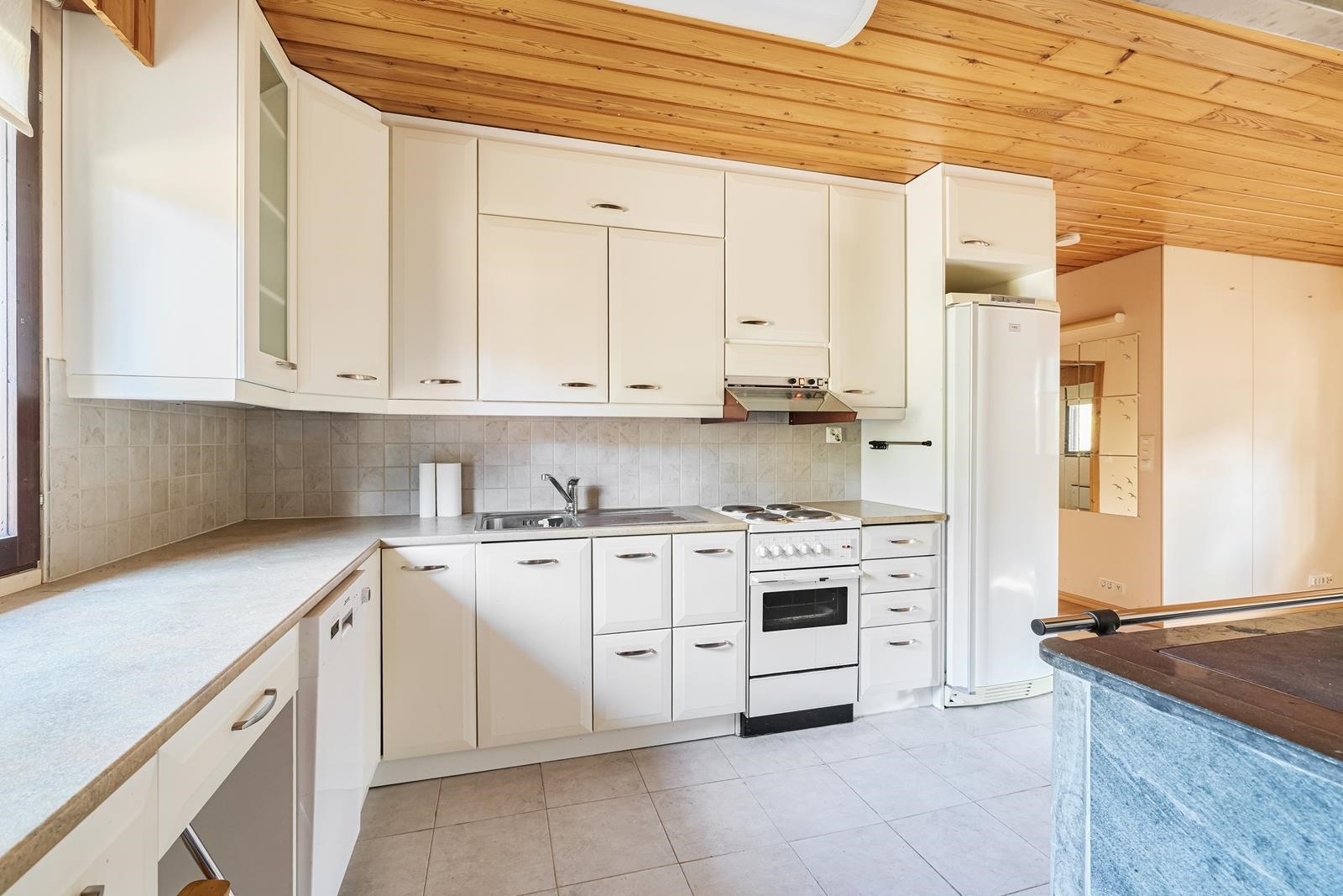 - Jääkaappi, lattialiesi, liesituuletin, astianpesukone, kaapistot uusittu v. 2009, keittiön tulisija asennettu 2002, nuohous 2025, keittiön lattialämmitys v. 2009.