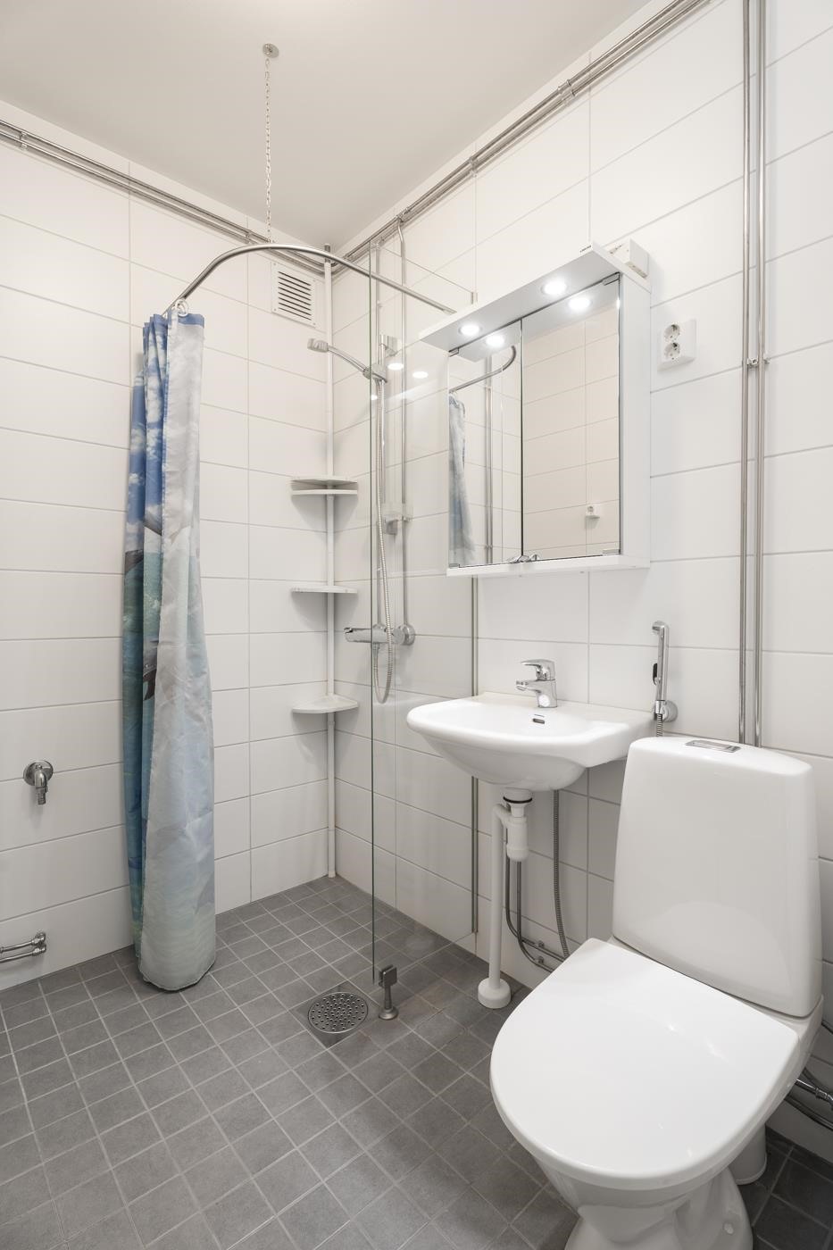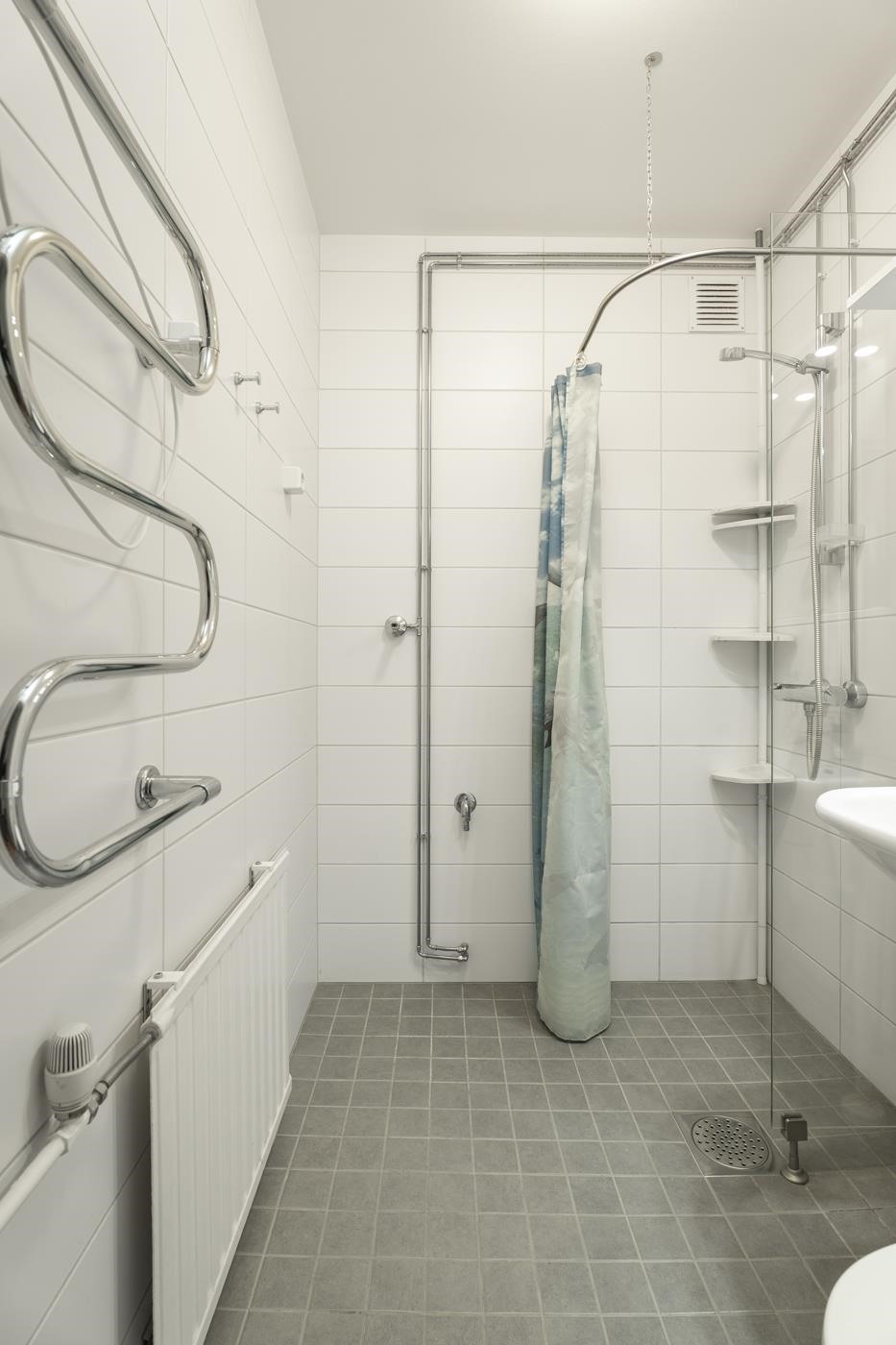 - Kylpyhuone, suihku, peilikaappi, allaskaappi, pesukoneliitäntä, sähköinen kuivausteline.