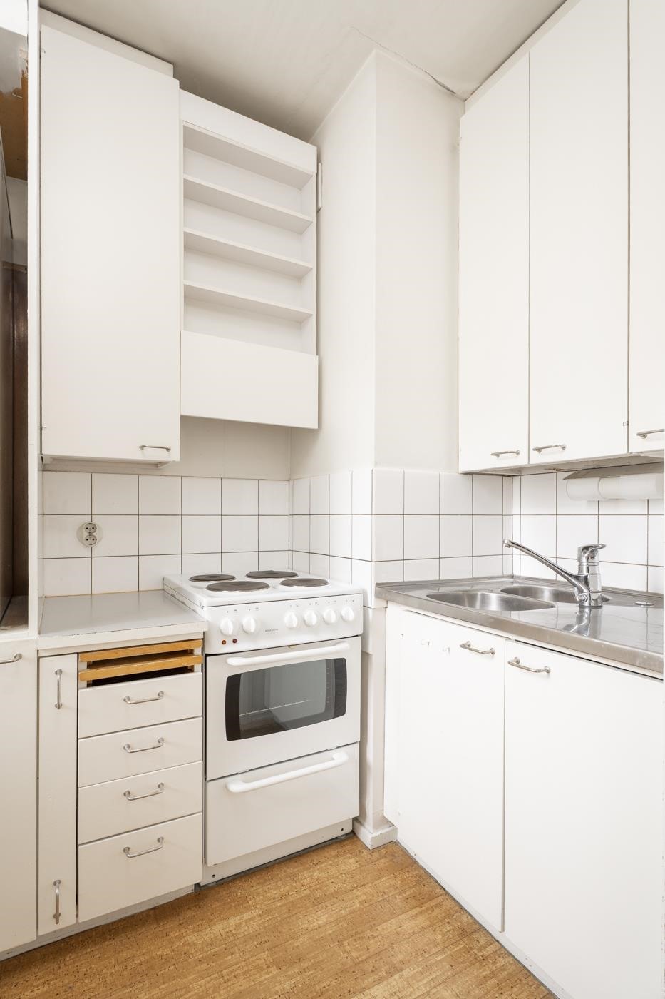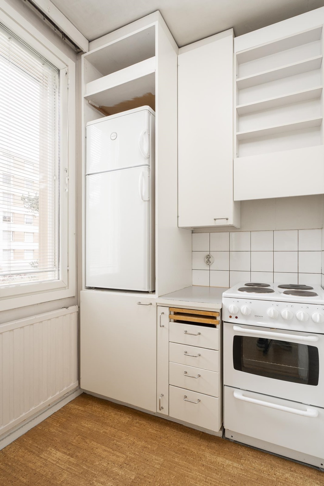 - Jääkaappipakastin, sähköliesi, kaapistot, kiinteät valaisimet välitilassa.