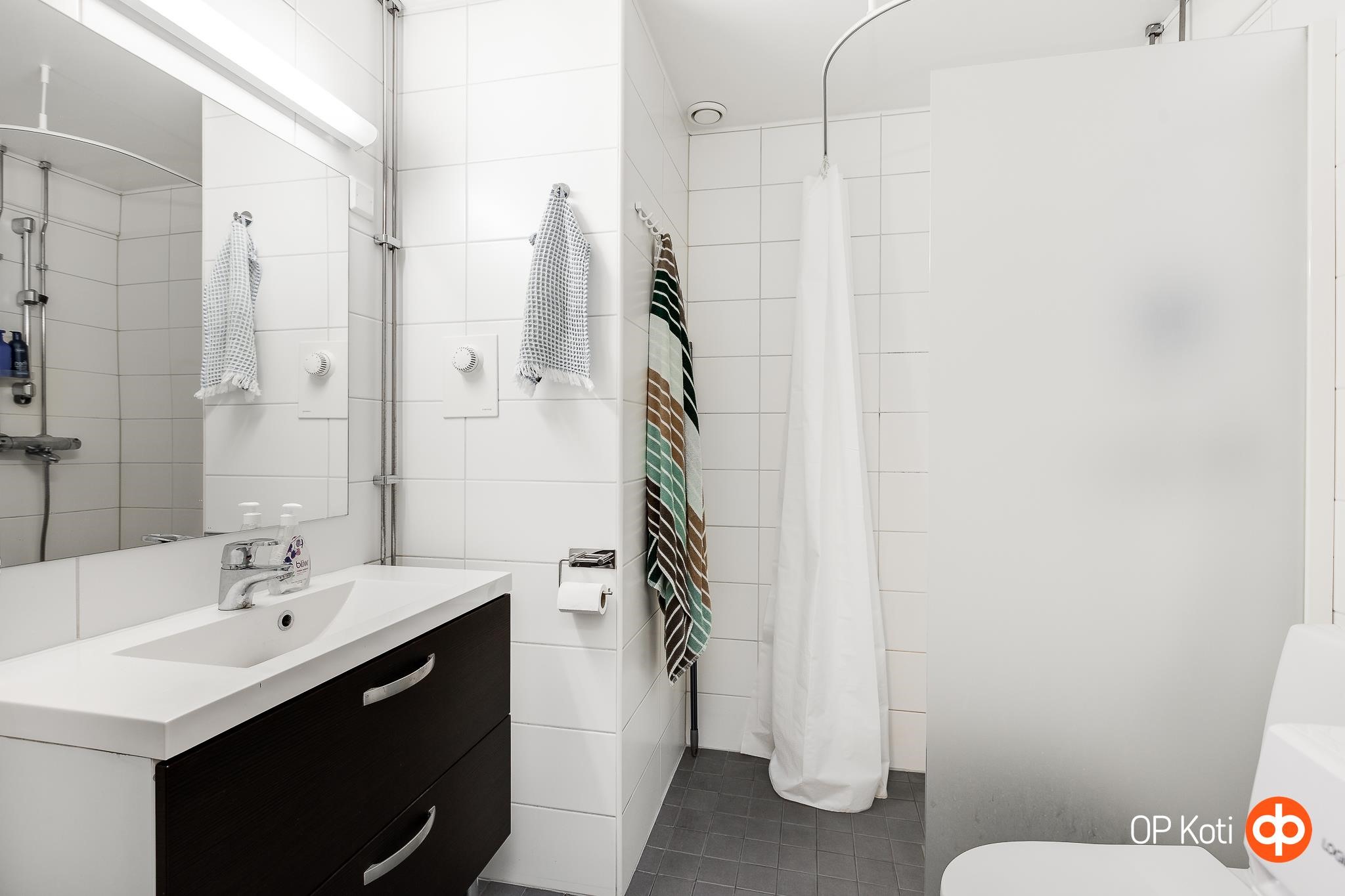 - Kylpyhuone, suihku, suihkuseinä, peilit, allaskaappi, pesukoneliitäntä, lattialämmitys kylpyhuoneessa, kiinteät valaisimet.