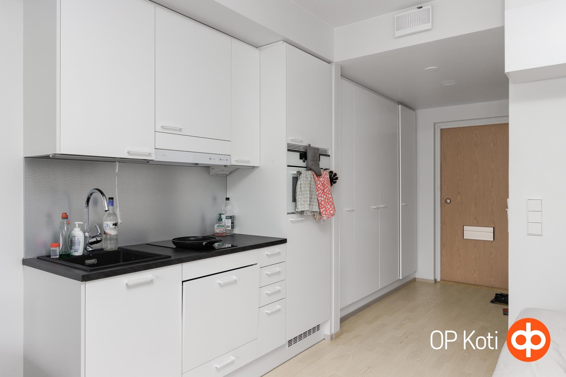 - Jääkaappi, erillisuuni yhdistelmäuuni, induktioliesi, liesikupu, astianpesukone, kaapistot, kiinteät valaisimet.