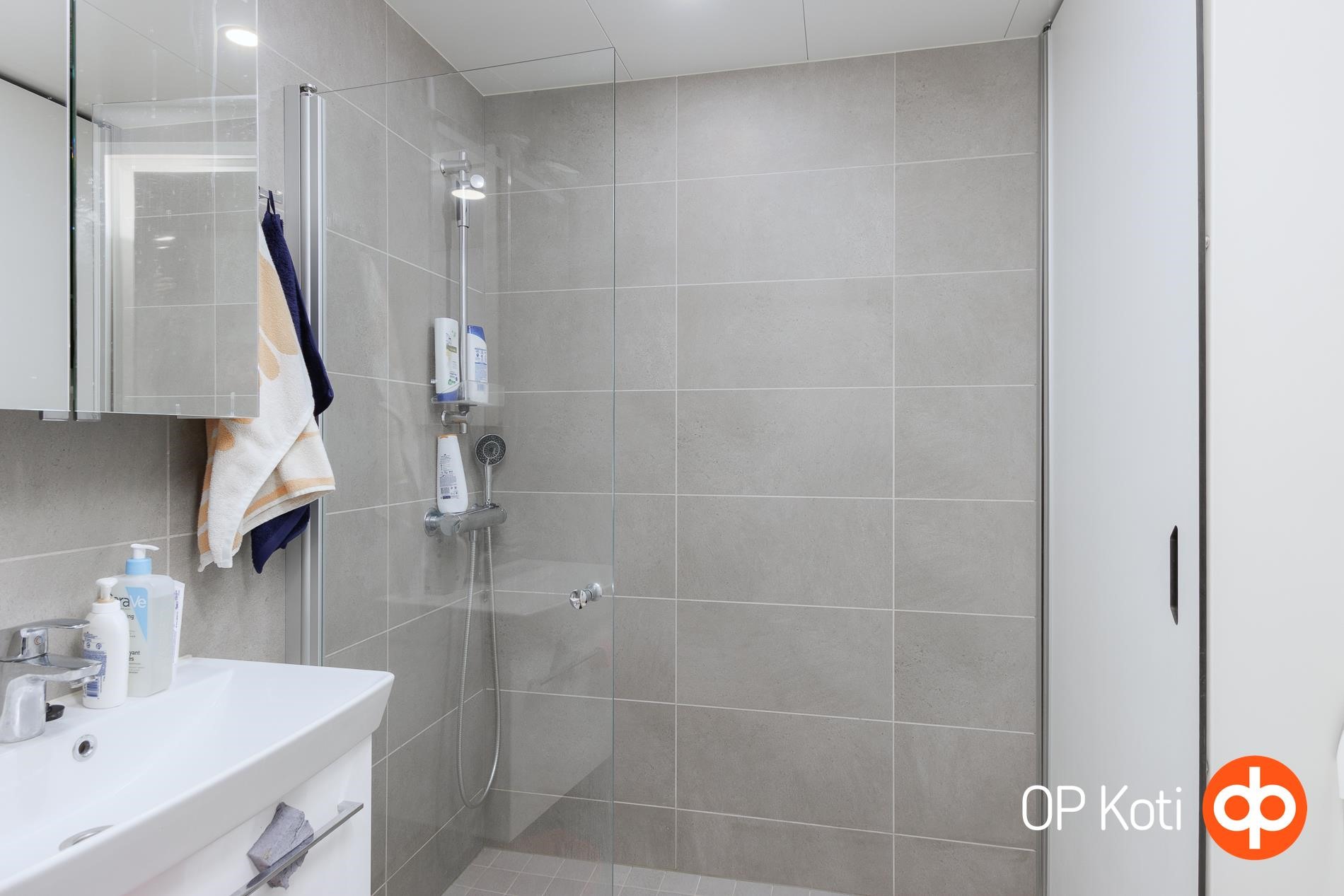 - Kylpyhuone, suihku, suihkuseinä, peilikaappi, allaskaappi, pesukoneliitäntä, lattialämmitys.