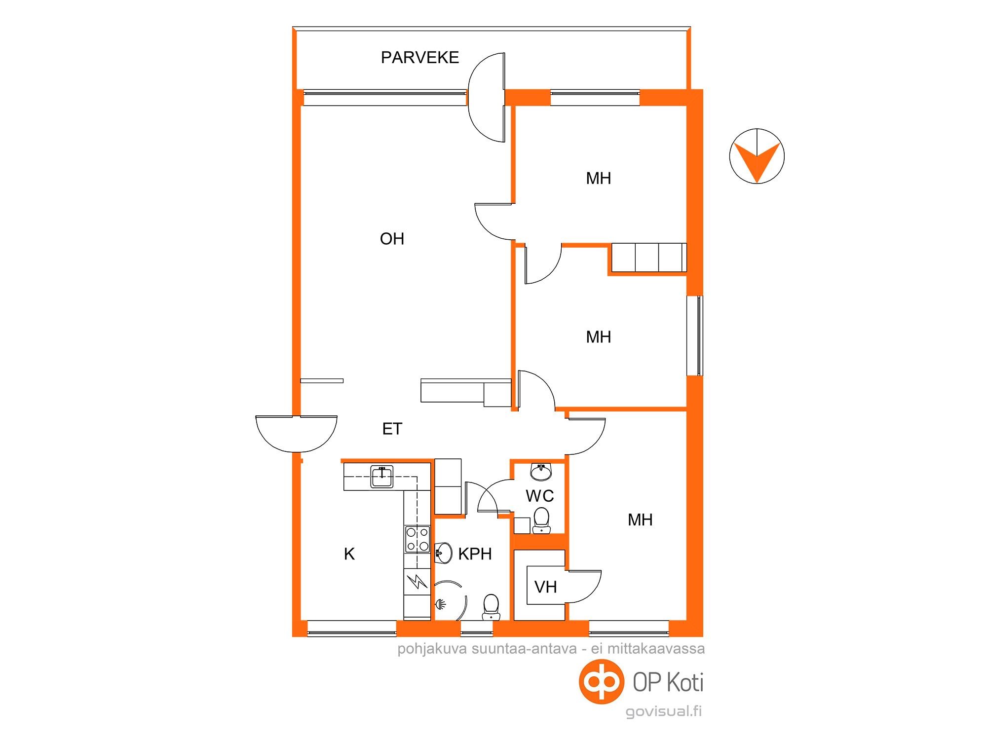 - Olohuone ja makuuhuone etelä sekä mh länteen. Keittiö ja makuuhuone pohjoiseen.