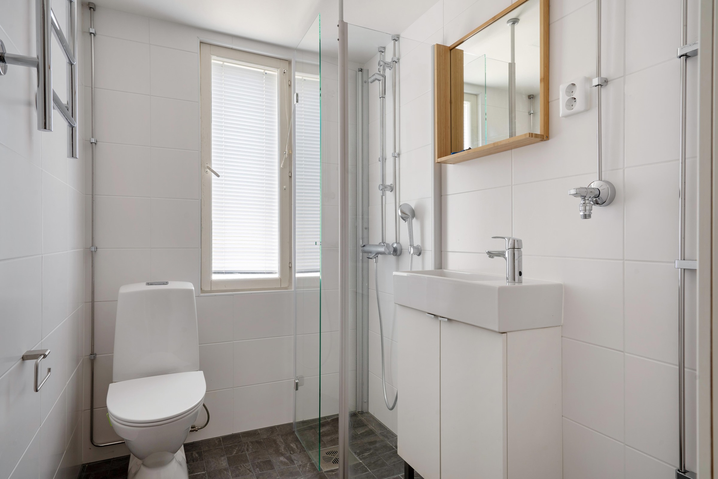 - Kylpyhuone, erillinen wc, suihku, suihkuseinä, peilikaappi, pesukoneliitäntä, lattialämmitys, kiinteät valaisimet.