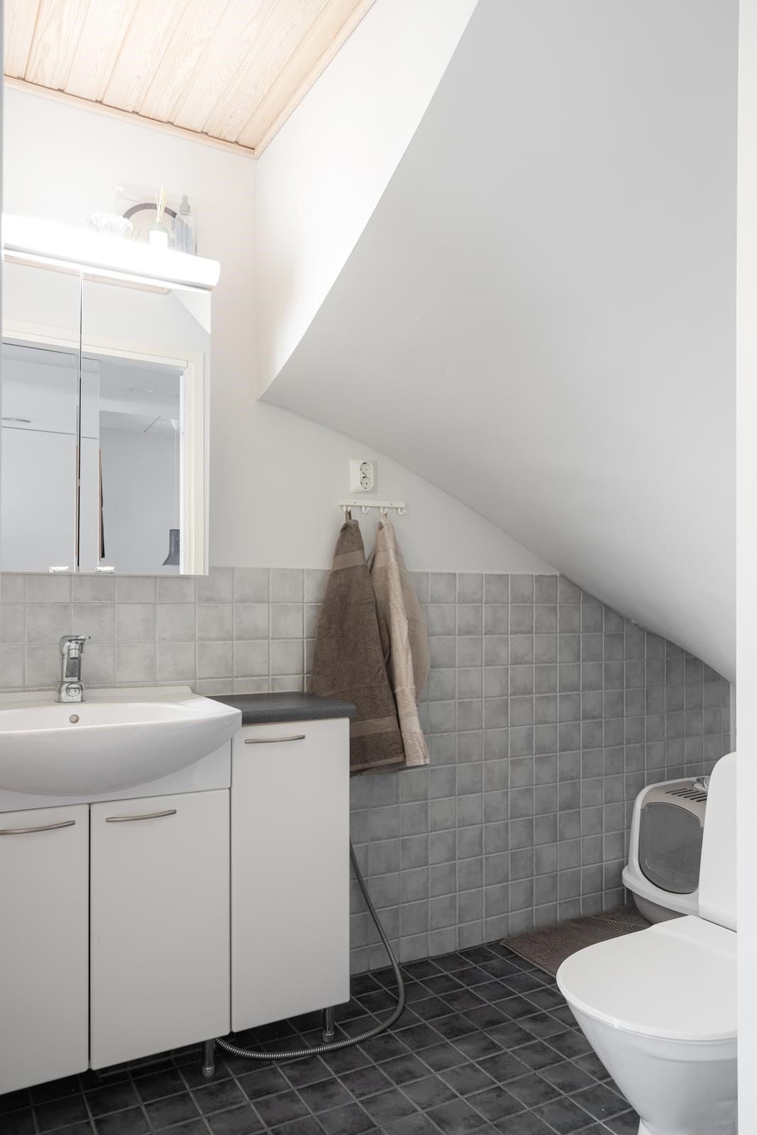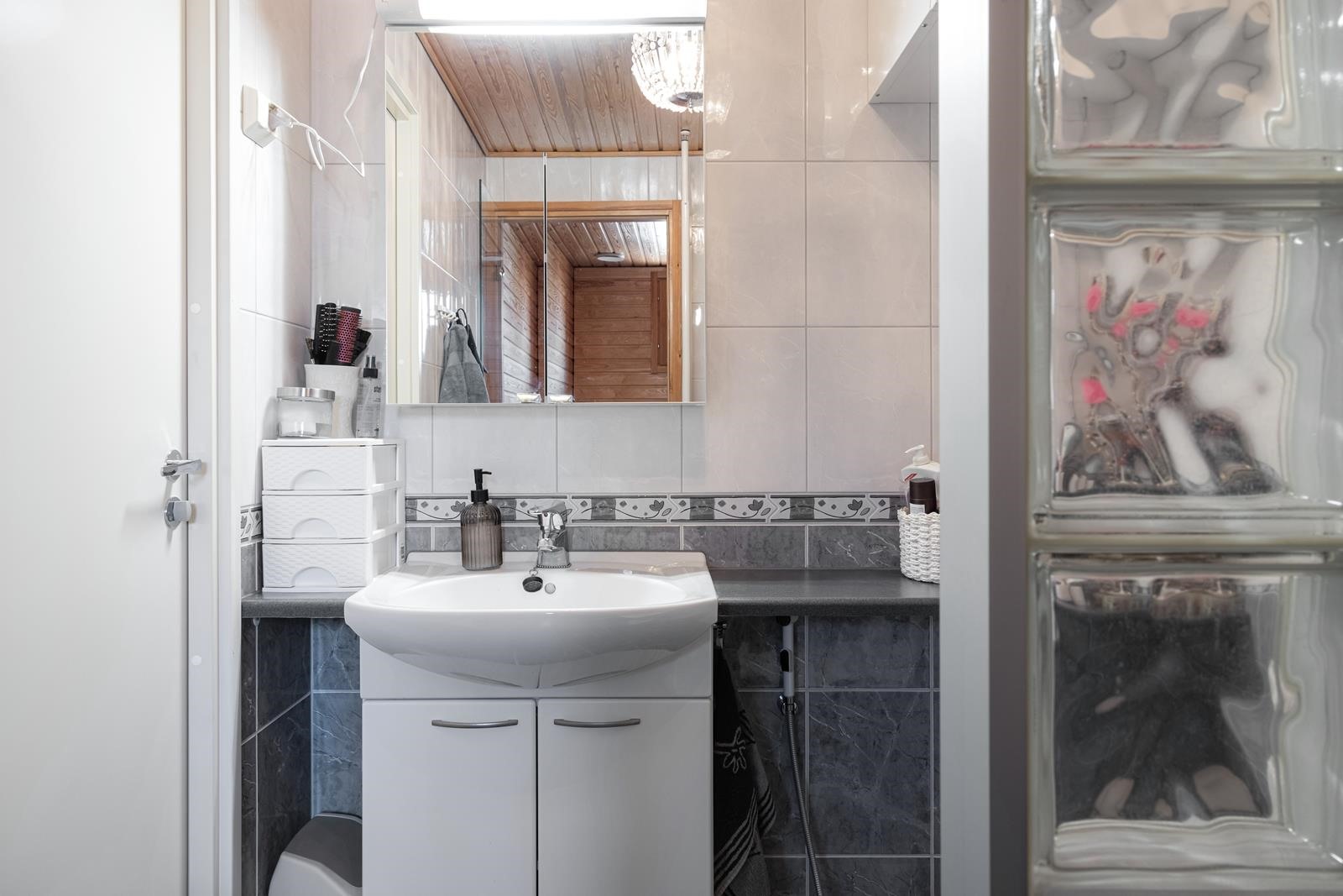 - Sauna, sähkökiuas, kylpyhuone, erillinen wc, suihku, suihkuseinä, peilikaappi, allaskaappi, pesukoneliitäntä, lattialämmitys, kiinteät valaisimet.
