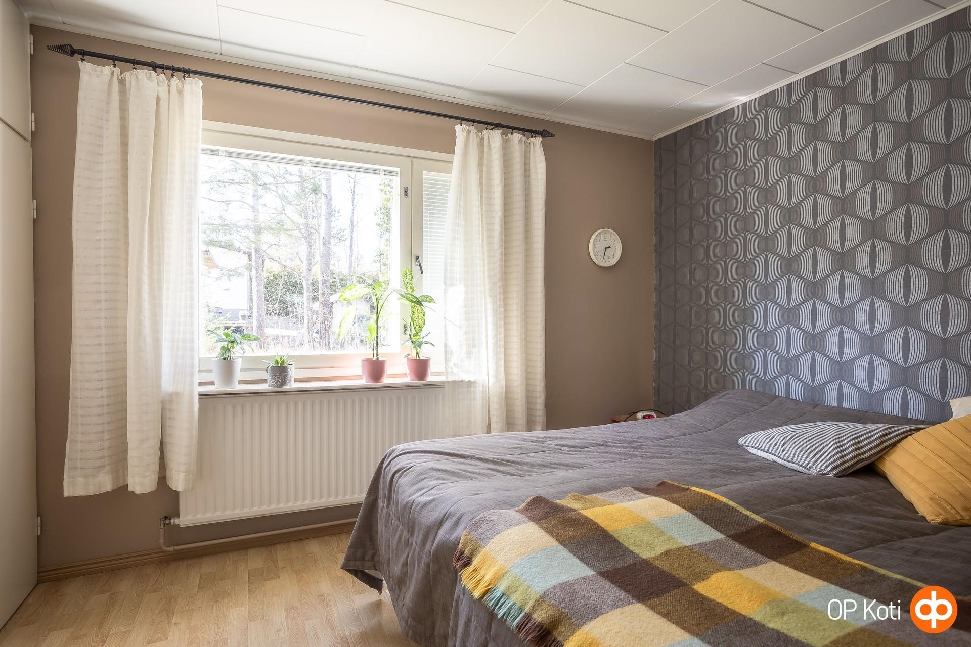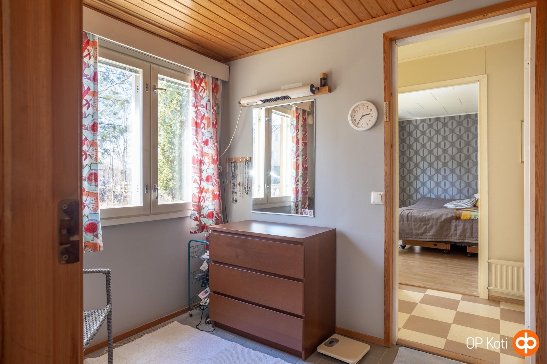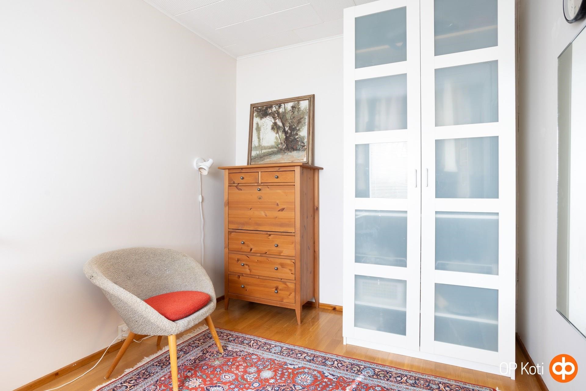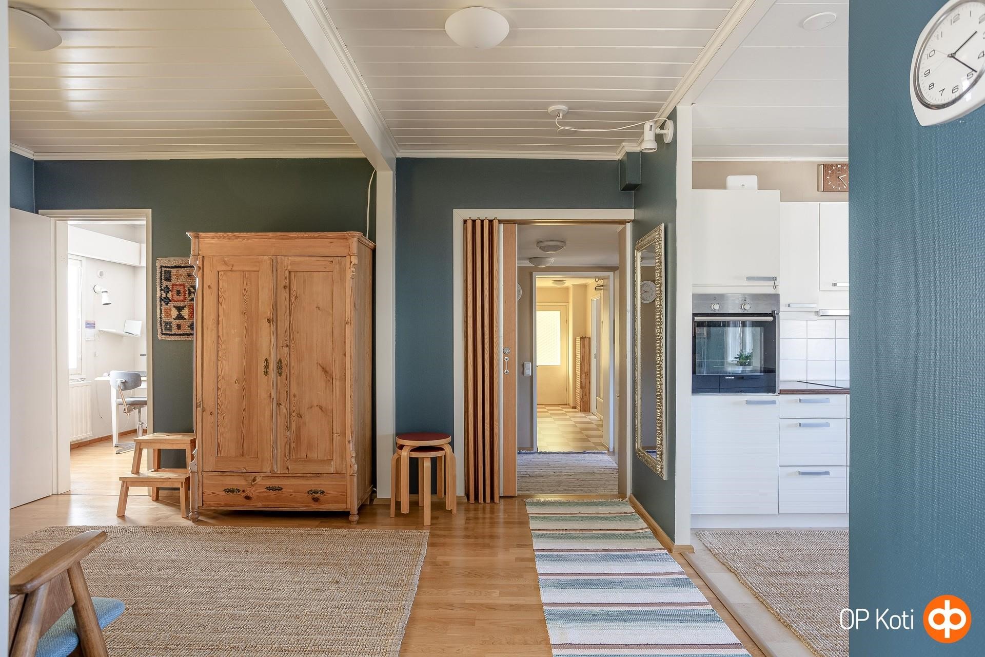 Keittiö: lattia: korkkilaatta, seinät: maali. Olohuone: lattia: parketti, seinät: maali. Makuuhuone 1: lattia: laminaatti, seinät: maali/tapetti. Makuuhuone 2: lattia: parketti, seinät: maali. Makuuhuone 3: lattia: parketti, seinät: maali. Kodinhoitohuone: lattia: laatta, seinät: maali. Sauna: lattia: laatta, seinät: paneeli. Kylpyhuone: lattia: laatta, seinät: kaakeli. Eteinen: lattia: parketti, seinät: maali. Wc: lattia: laatta, seinät: kaakeli. apukeittiö: lattia: korkkilaatta, seinät: maali.